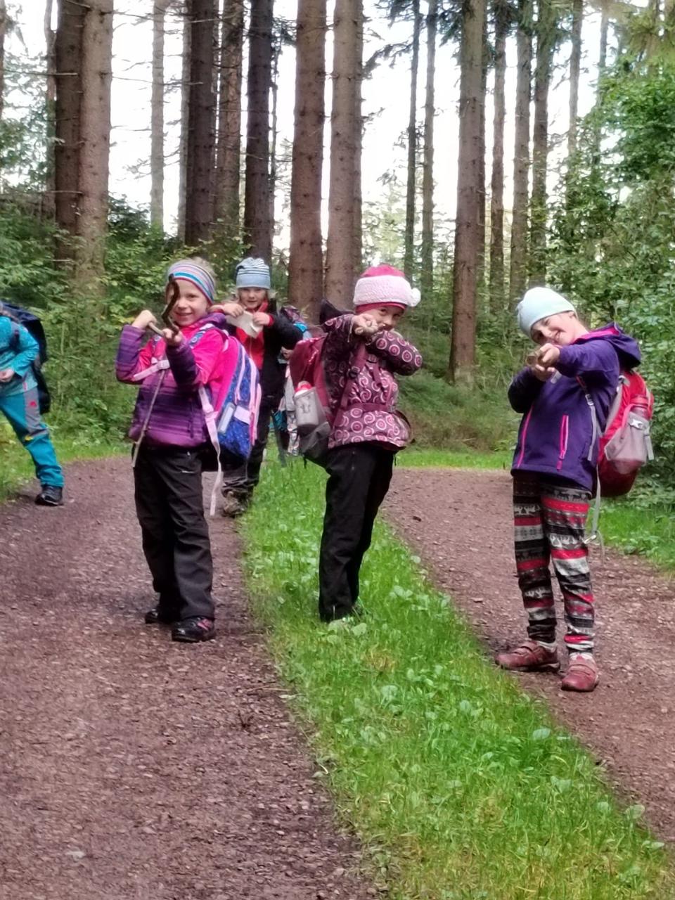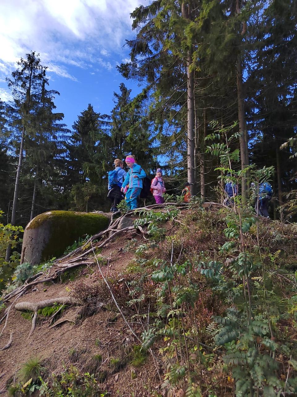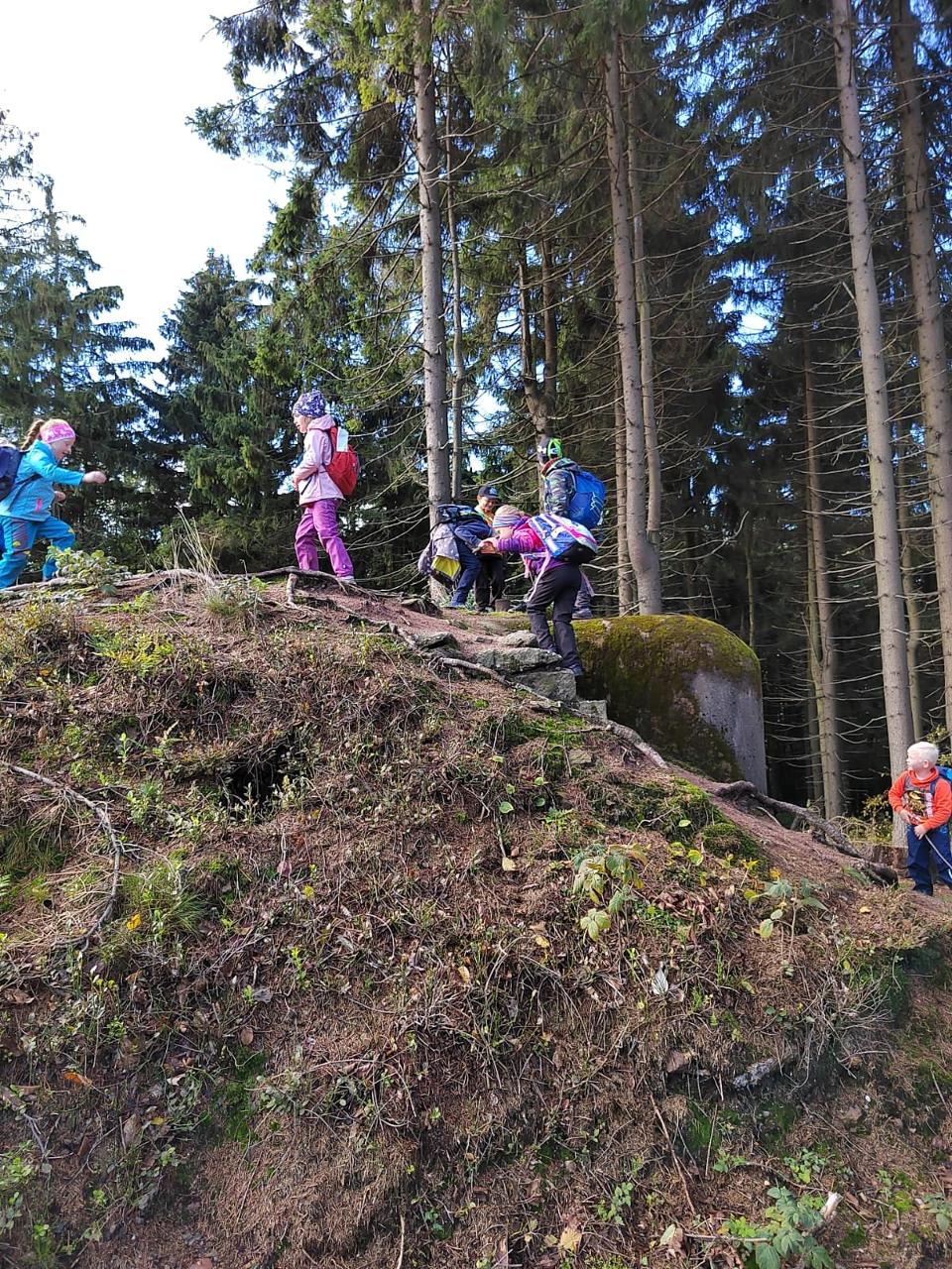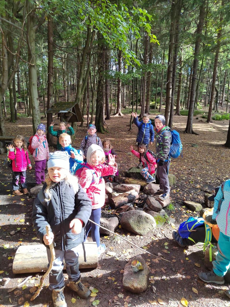 Loupežníka Lotranda známe z Čapkovské pohádky “Loupežnická pohádka” a tak jsme se rozhodli navštívit Lotranda v jeho jeskyni, která se v našem kraji nachází. Cesta lesem nás přivedla až k 24 m vysoké rozhledně Žaltman, mnozí překonali sami sebe a přes svůj strach z výšky nakonec shlédli do kraje ze samého vršku rozhledny. Poté jsme se vydali cestu za Lotrandem. Ale kudy jít? Jé…na cestě se třpytily zlaťáky, které asi vypadly cestou z lupu samotnému Lotrandovi. Zlaťáky nás přivedly k jeskyni, kde jsme potkali Lotranda i s jeho ženou a loupežnickým synkem. Připravili jsme si ohniště a vzájemně se s loupežnickou rodinou podělili o naše pochoutky. Vyprávěli jsme si o našich životech, škole a zážitcích. Celým výletem nás provázely písničky a češtinářské slovní hádanky. Kousek cesty jsme se nakonec svezli naším Mravbusem.