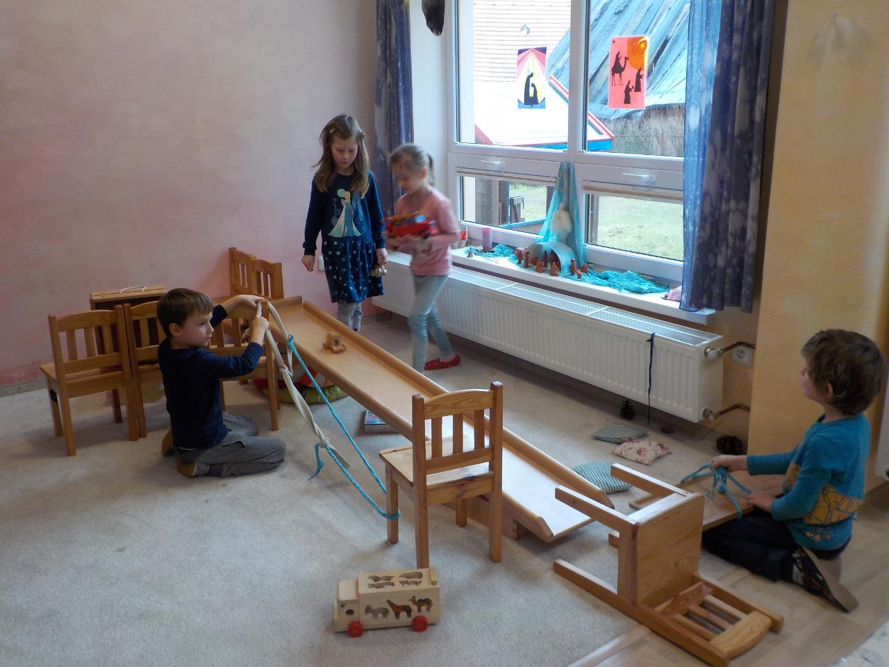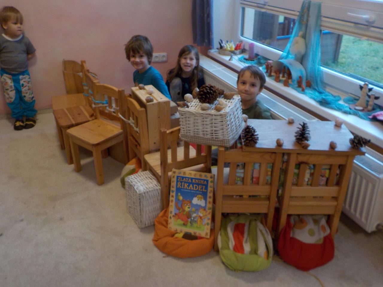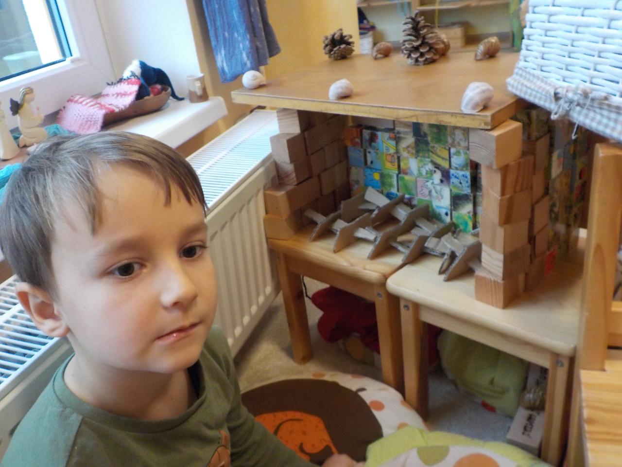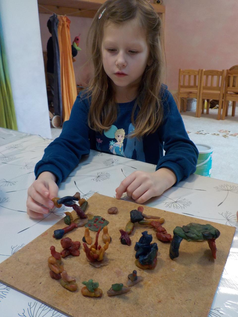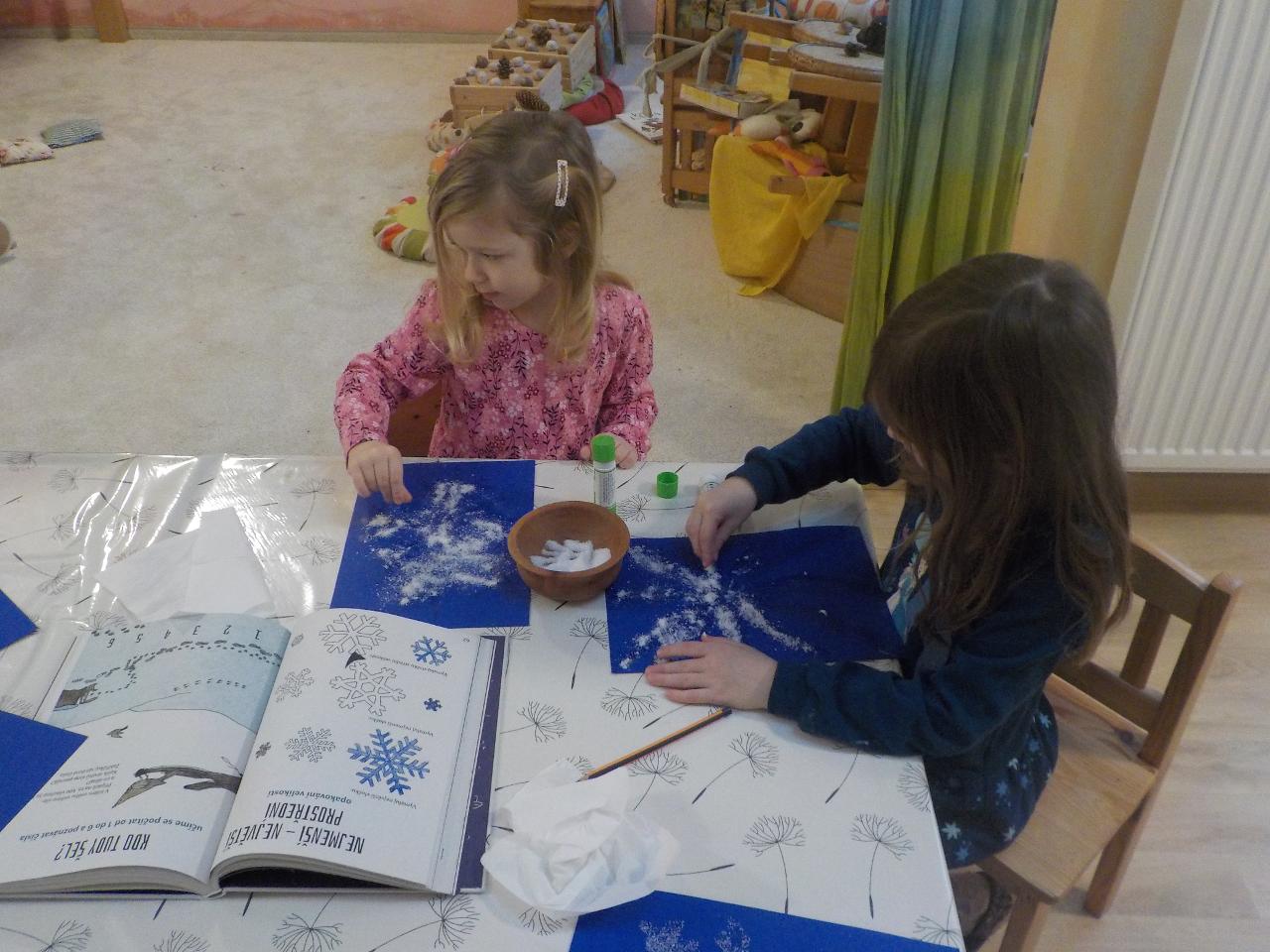 Po dozvucích Vánoc si konečně máme čas uvědomit nový rok a vše, co nám přináší. Hráli jsme si na 12 měsíčků, kteří mají každý svůj úkol. Vítali jsme nový rok s fanfrnochem a jeho legračním zvukem. Ze včelího vosku jsme vymodelovali kolo roku a vše, co Maruška měla nakázáno donést v lednu z lesa. Pomocí soli a lepidla tvoříme lednové ozdoby - sněhové vločky - jen škoda, že venku žádné nejsou. Alespoň je viděť v pískovišti písek a po cestách bláto, nezapadalo ani bludiště, takže cesta pro odvážné je volná. Kromě připravených úkolů pro děti je tu ještě spousta výzev, které přichází samy od sebe - z klouzačky, kterou přinesl Ježíšek vzniká nakloněná rovina a je třeba vyzkoušet vše, co po ní sjede a jak rychle. V Mravenečku vzniká spousta staveb - některé jsou domy, jiné tanky, další pak obchody - máme tu modeláře, kteří vyrábí papírové modely - letadel bylo spousta a co se v obchůdku neprodalo, tak se rozdalo. U nás se žádný den nenudíme.