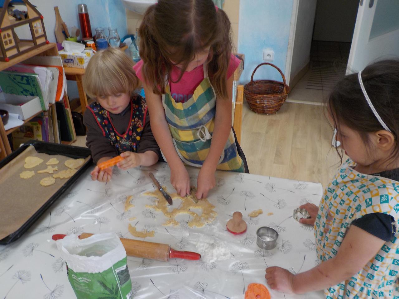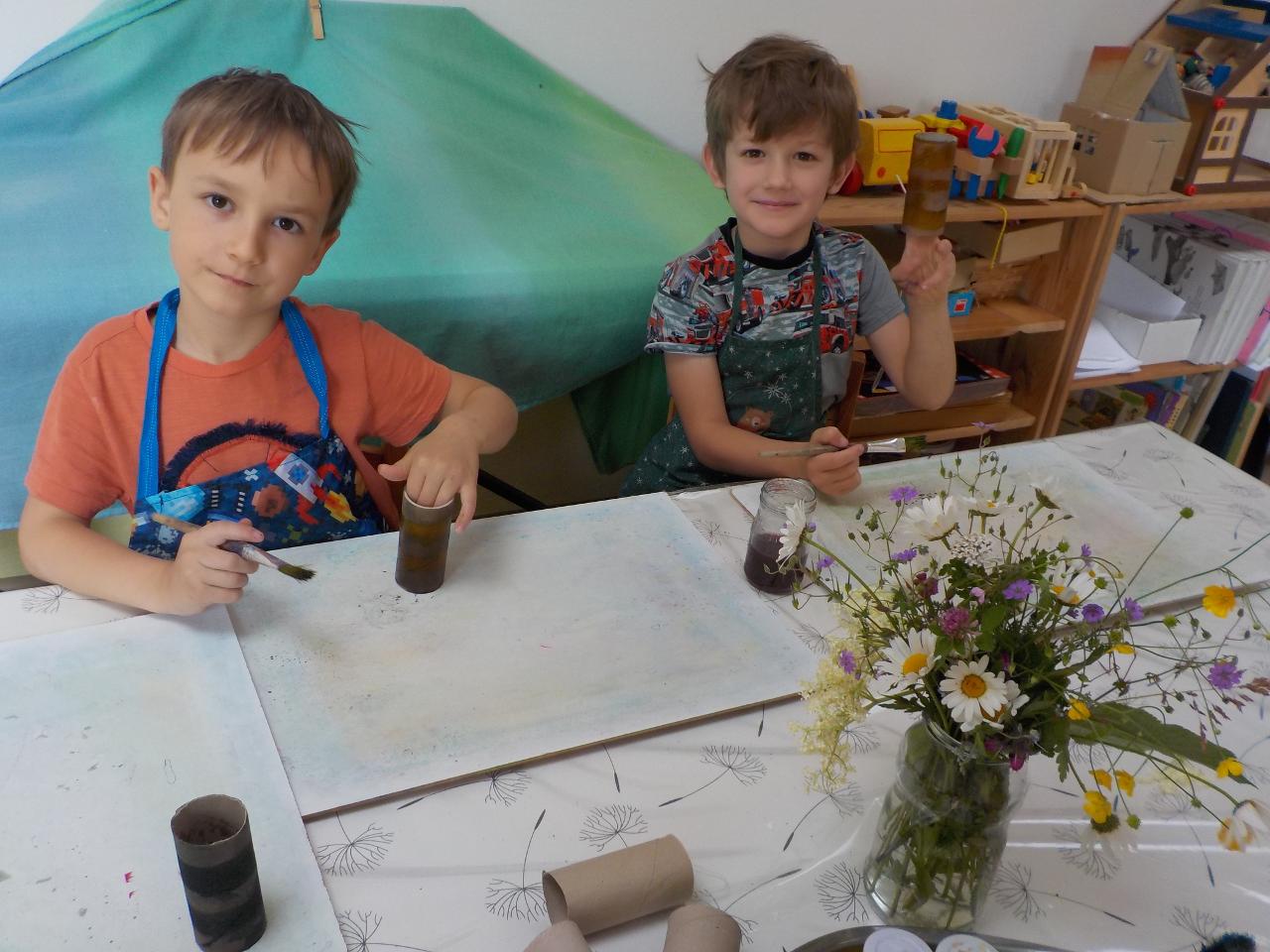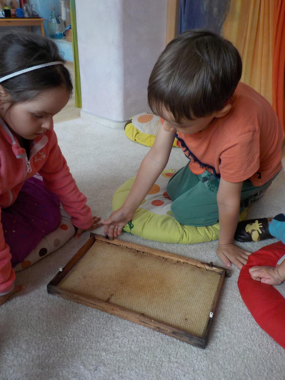 Kde se to v těch dětech bere, ta neutuchající energie, chuť stále tvořit, běhat, smát se, bez zastavení. Tak jako ty včelky, které stále létají a pracují. Pozorovali jsme je tento týden pozorně, náš kamarád Vítek nám o nich dost znale vyprávěl, přinesl ukázat dětem rámeček s voskovými komůrkami. Upekli jsme si medové sušenky, zahráli jsme si na bzučivé kazu a zazpívali si. Každý si zkusil brčkem zasosat jako ta včelka a ještě mu na něm rozkvetla barevná kytička. A dokonce jsme s jednou včelkou z papíru odletěli i domů. A jak je to s tou pracovitostí - vydali jsme se k potůčku a neúnavně hledali vzácné kamení, ve vrbovém domečku stavěli střechu, aby do něj nezatékalo. A aby toho nebylo málo, stihli jsme oslavit jedny krásné šesté narozeniny.