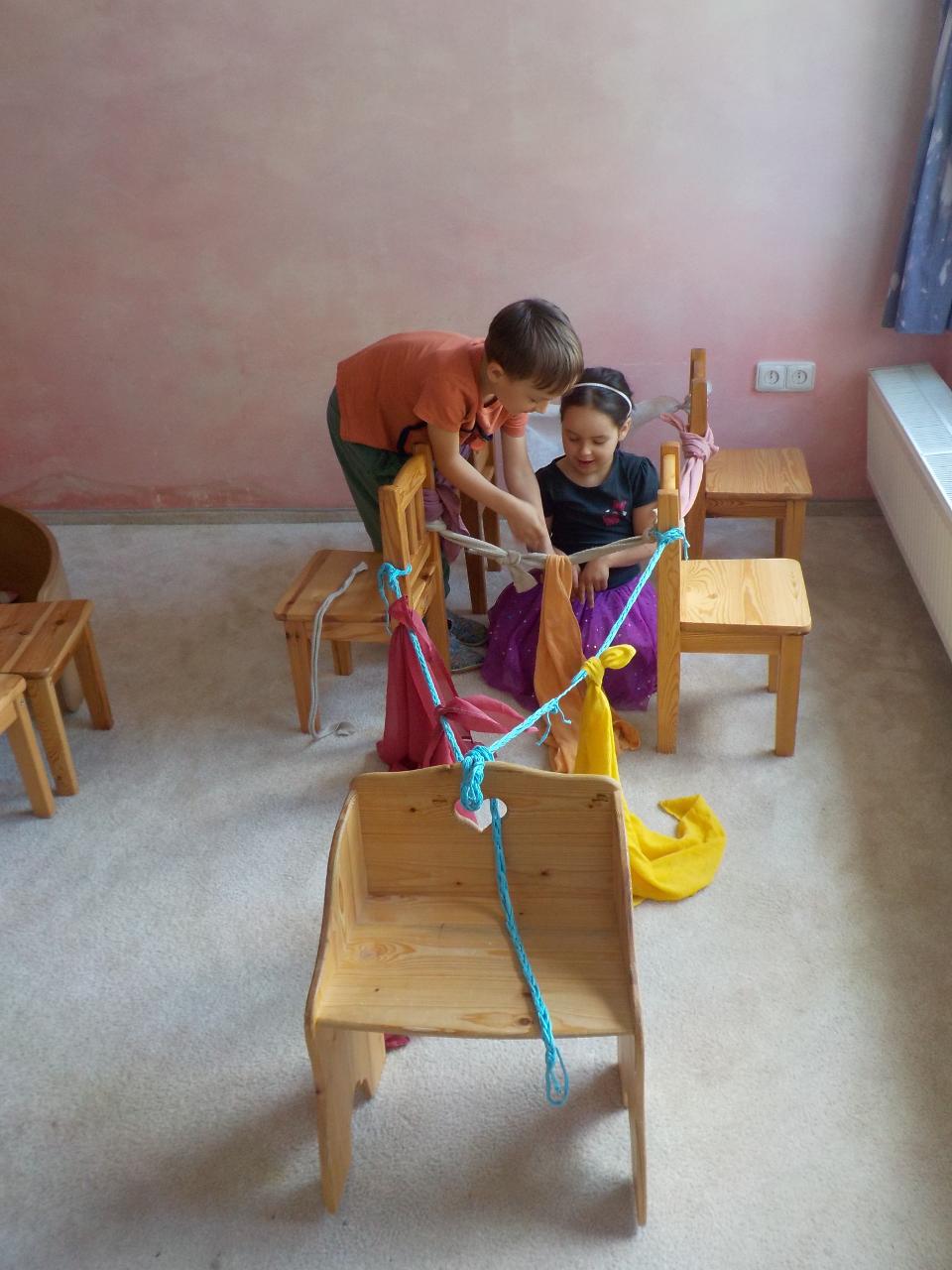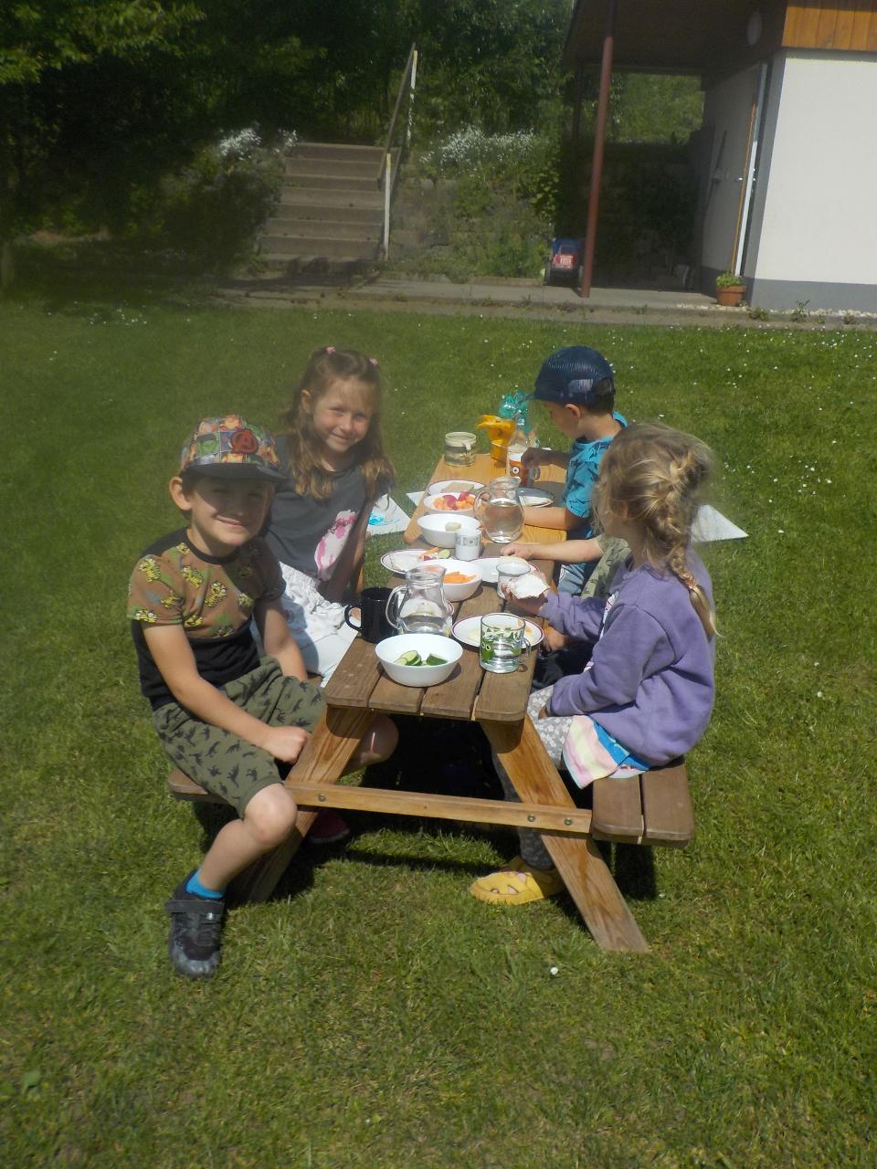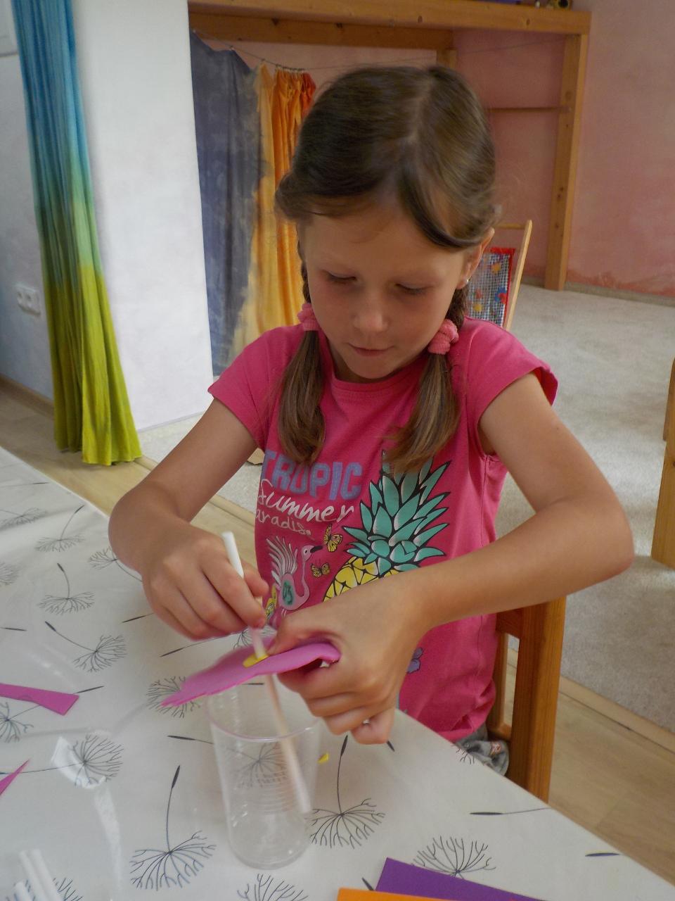 Kde se to v těch dětech bere, ta neutuchající energie, chuť stále tvořit, běhat, smát se, bez zastavení. Tak jako ty včelky, které stále létají a pracují. Pozorovali jsme je tento týden pozorně, náš kamarád Vítek nám o nich dost znale vyprávěl, přinesl ukázat dětem rámeček s voskovými komůrkami. Upekli jsme si medové sušenky, zahráli jsme si na bzučivé kazu a zazpívali si. Každý si zkusil brčkem zasosat jako ta včelka a ještě mu na něm rozkvetla barevná kytička. A dokonce jsme s jednou včelkou z papíru odletěli i domů. A jak je to s tou pracovitostí - vydali jsme se k potůčku a neúnavně hledali vzácné kamení, ve vrbovém domečku stavěli střechu, aby do něj nezatékalo. A aby toho nebylo málo, stihli jsme oslavit jedny krásné šesté narozeniny.