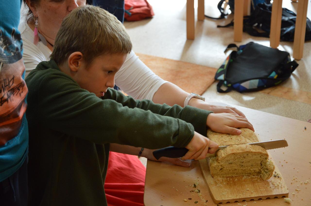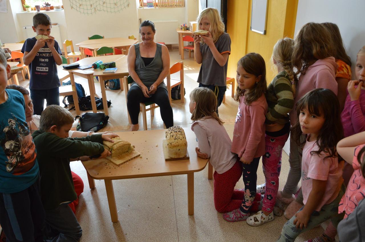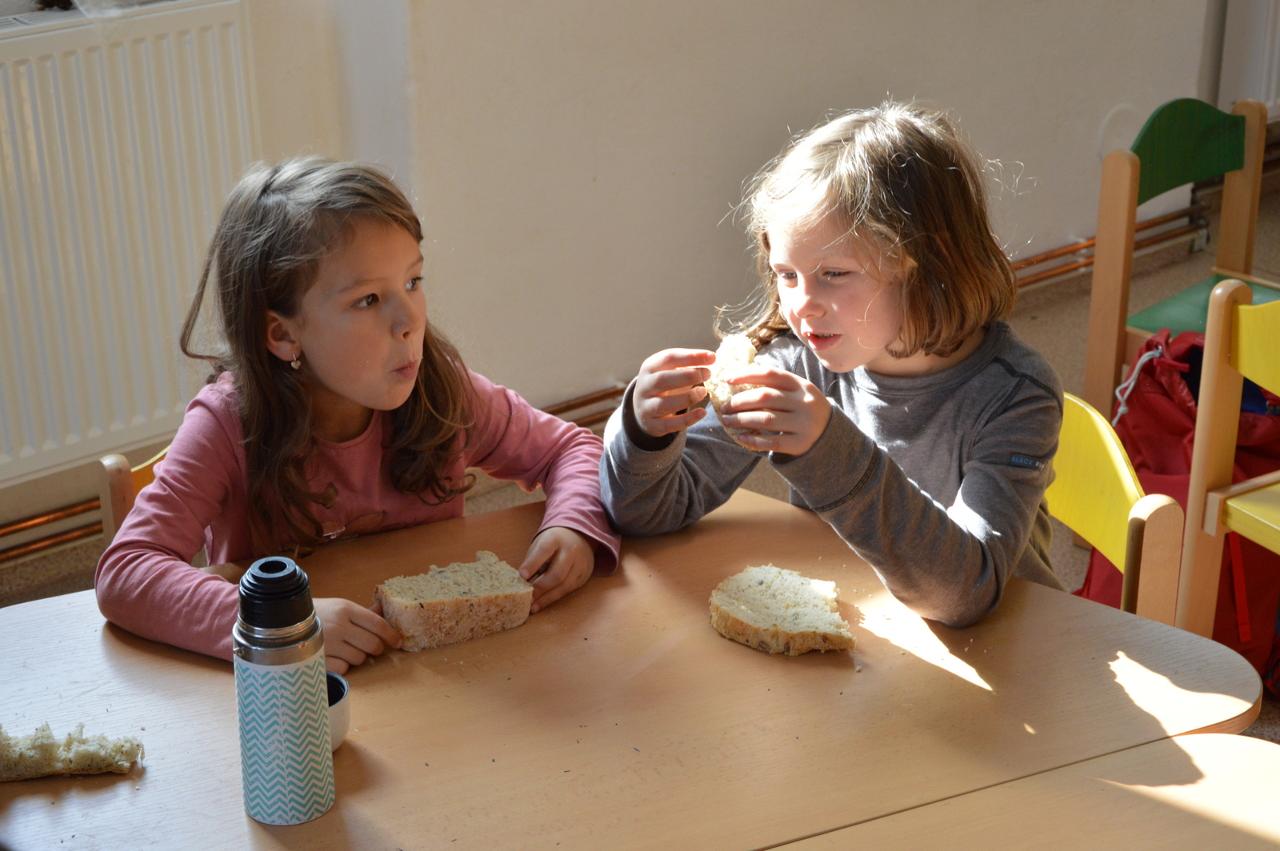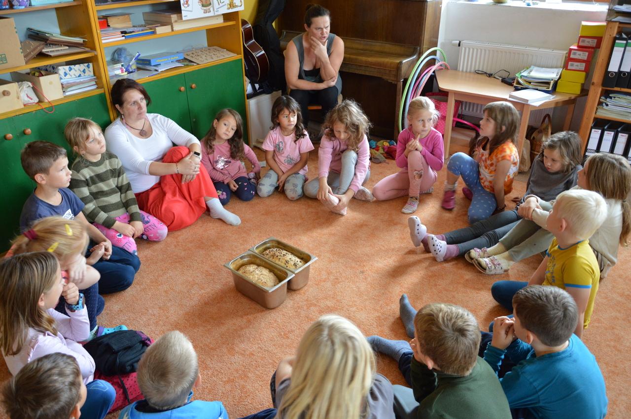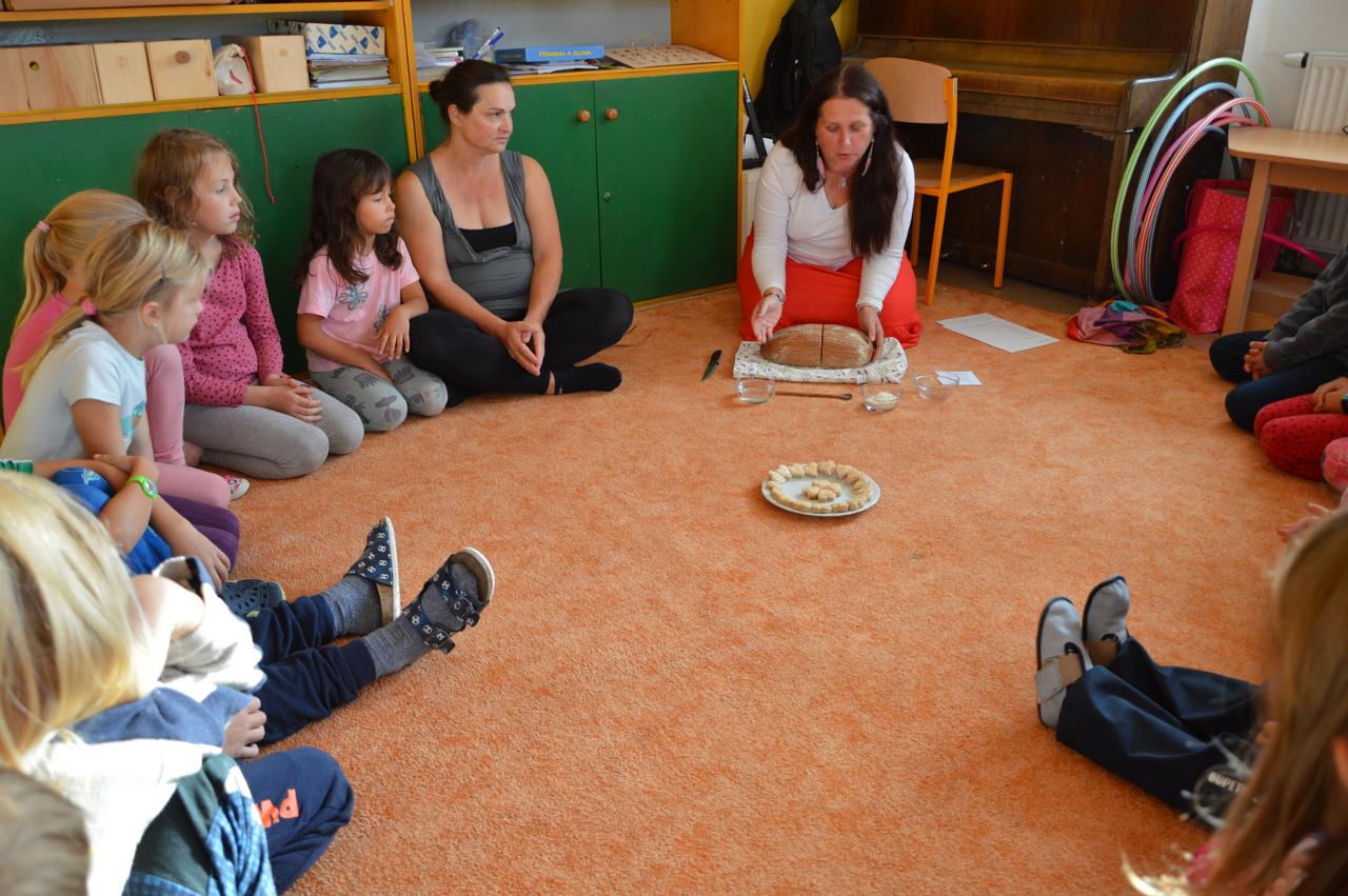 Podzim plyne v plném proudu, stromy se krásně barví a my máme to štěstí, že to můžeme pozorovat v tak krásném okolí, jaké Mraveniště má. V tomto týdnu navazujeme na dary přírody a rozhodli jsme se, že si upečeme chléb. Bylo však potřeba zjistit více, abychom věděli, jak na to.. Dozvěděli jsme se, že pekaři věří, že chléb má svoji duši. Zaujala nás historie chleba. Víte jak to bylo? Nejprve se žvýkala zrna, pak se pražila, o něco později se drtila, čímž vznikla první mouka, ze které se začaly dělat kaše a placky. Díky náhodě se v Egyptě zjistilo, že sluníčko má tu schopnost množit bakterie a vznikl kvásek. My jsme si také zkusili chlebík upéct. Těšili jsme se na to, že si zkusíme mlít obilná zrna. Náš mlýnek nás však vůbec neposlouchal. Mouku jsme naštěstí měli, tak jsme se vrhli do pečení. Chlebíky se nám vydařily znamenitě. To byla dobrůtka. Po pečení na nás už čekala naše mravenčí zahrada. Celou jsme jí prošli, ukázali jsme si, kde co roste a zjistili jsme co je potřeba udělat před zimou. Práce bylo dost. Děti si vybraly, že vyplejeme jeden záhon. Kluci přivezli kolečko, rýč a motyky. Vrhli jsme se na to. Práce nám šla hezky od ruky. Našli jsme dlouhatánské kořeny, ale také mnoho žížal. Jedna byla tak tlustá, jako malíček dospěláka. A v kolik žížal jsme teprve objevili v kompostu! Brzy bylo hotovo, mnoho ručiček zvládlo velký kus práce během chvilky. Je radost s vámi být.