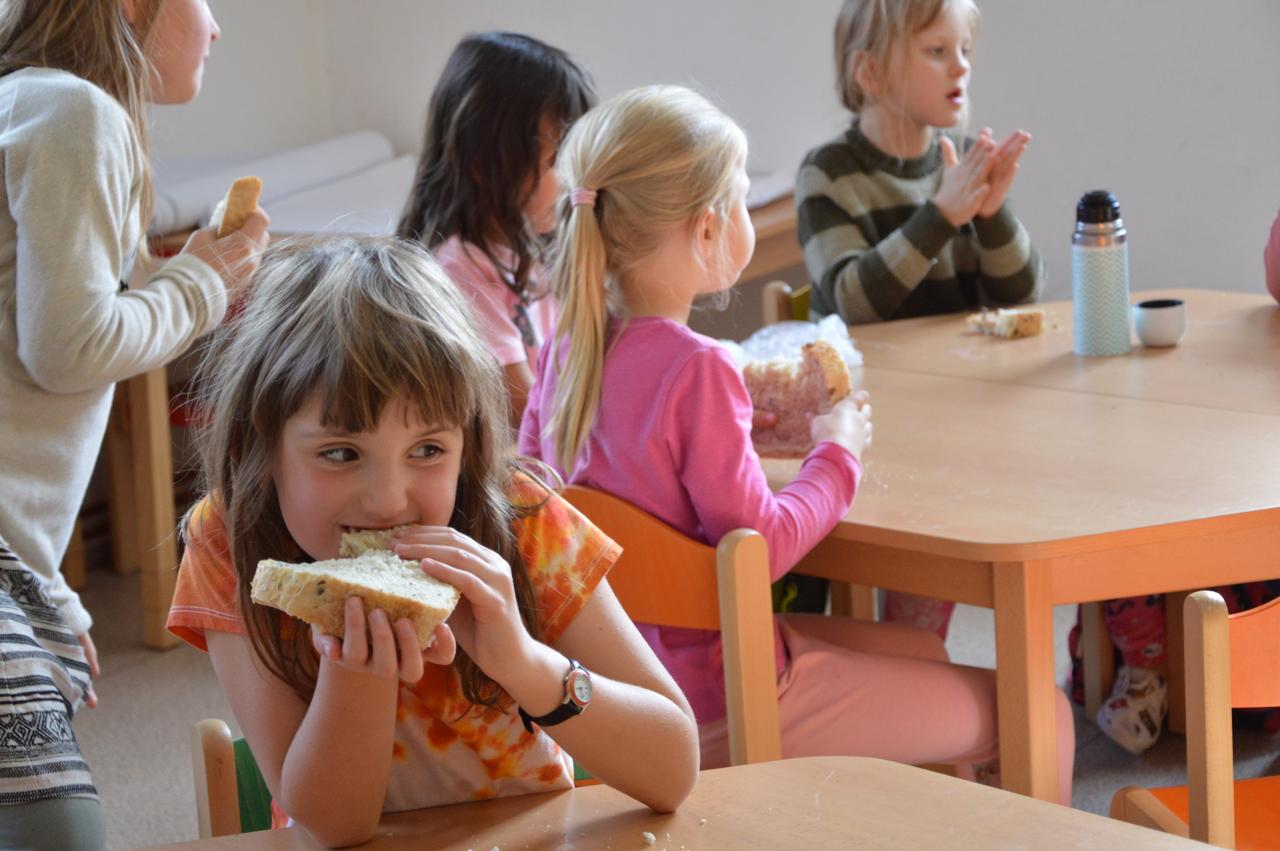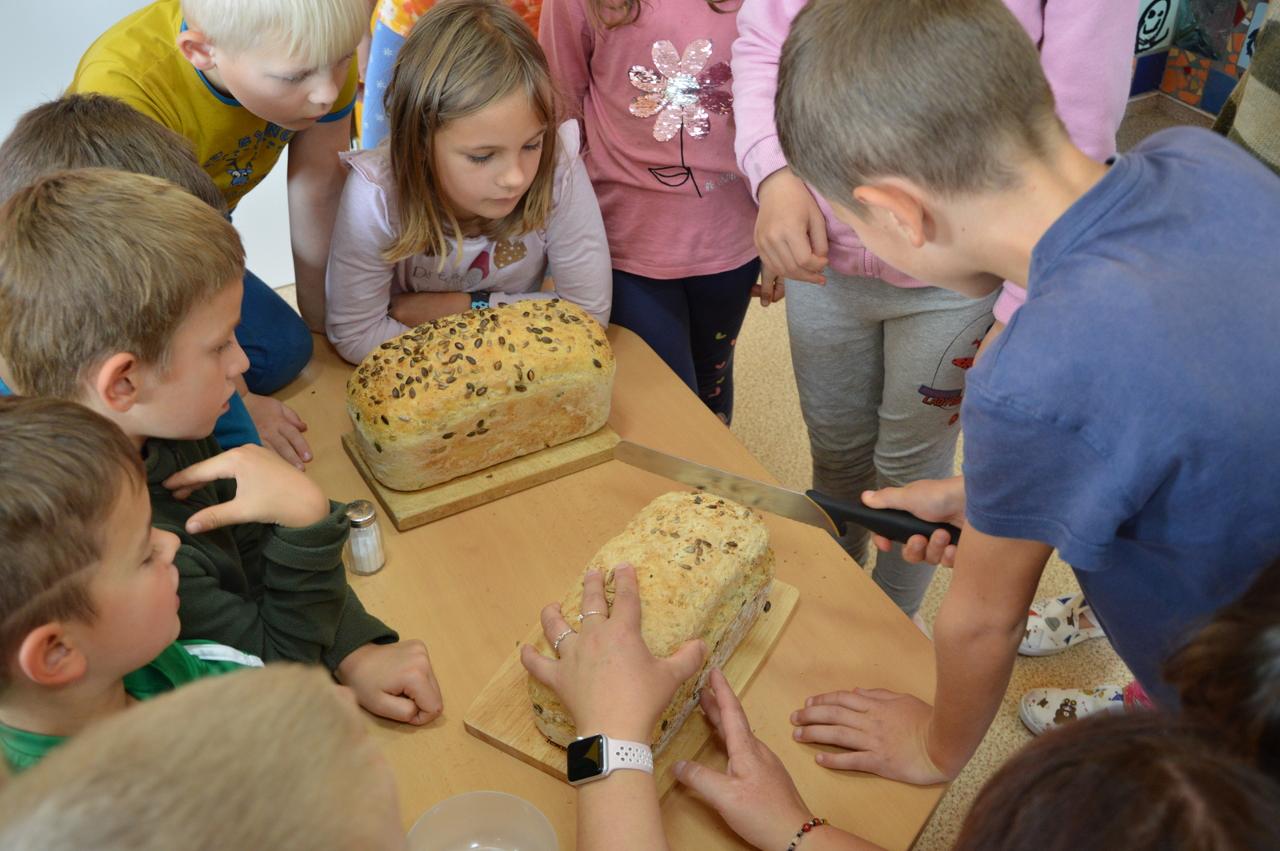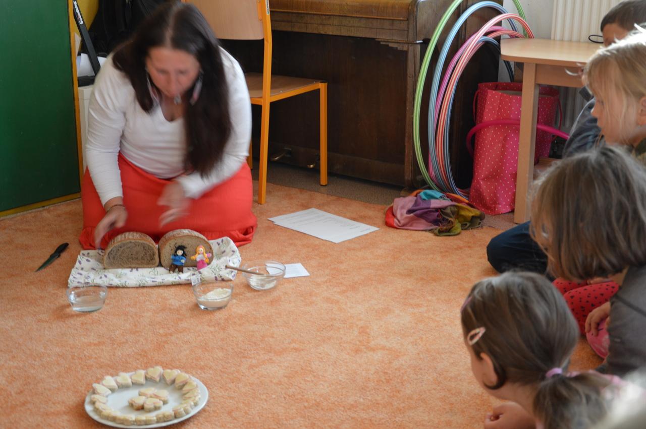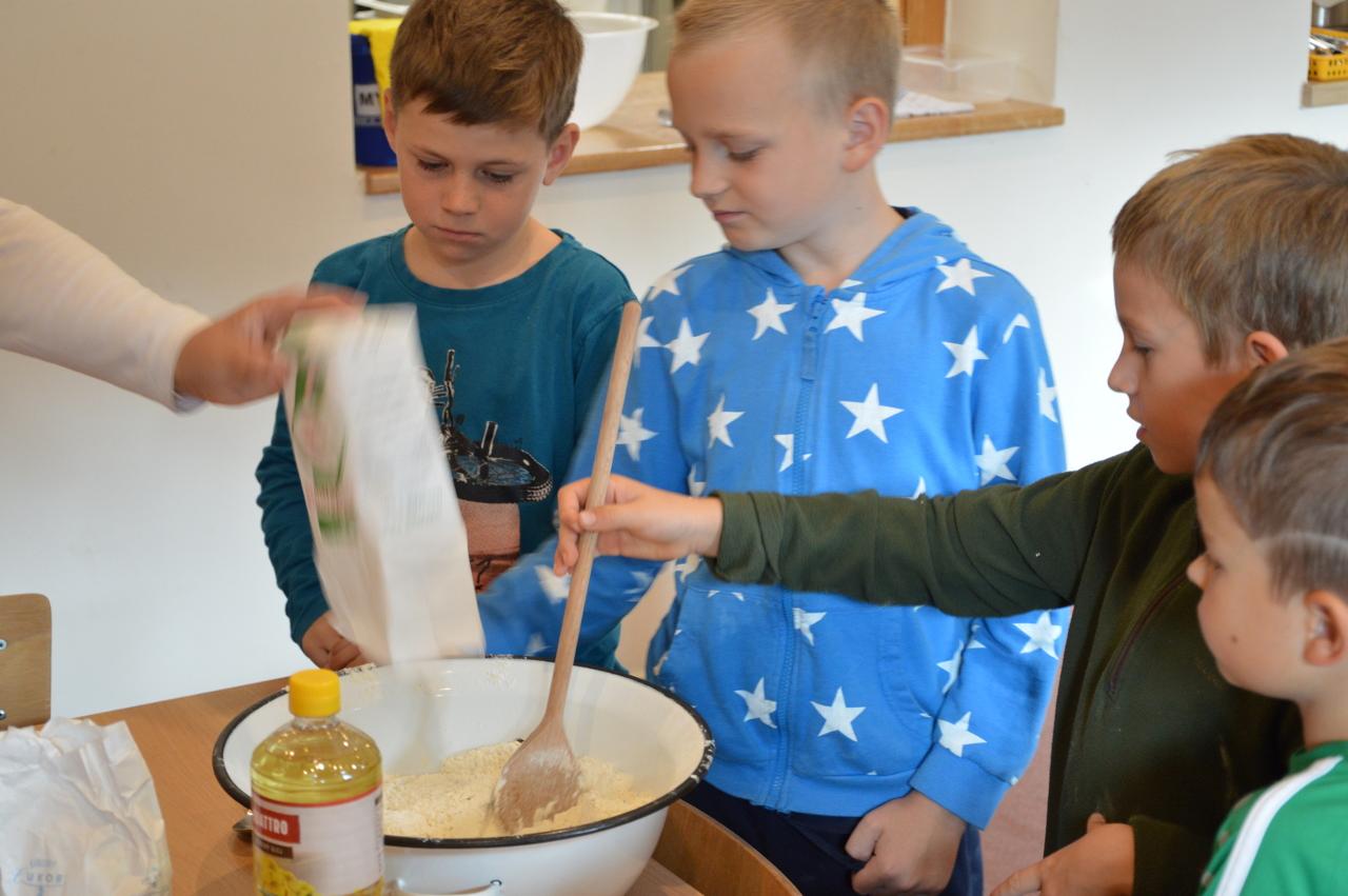 Podzim plyne v plném proudu, stromy se krásně barví a my máme to štěstí, že to můžeme pozorovat v tak krásném okolí, jaké Mraveniště má. V tomto týdnu navazujeme na dary přírody a rozhodli jsme se, že si upečeme chléb. Bylo však potřeba zjistit více, abychom věděli, jak na to.. Dozvěděli jsme se, že pekaři věří, že chléb má svoji duši. Zaujala nás historie chleba. Víte jak to bylo? Nejprve se žvýkala zrna, pak se pražila, o něco později se drtila, čímž vznikla první mouka, ze které se začaly dělat kaše a placky. Díky náhodě se v Egyptě zjistilo, že sluníčko má tu schopnost množit bakterie a vznikl kvásek. My jsme si také zkusili chlebík upéct. Těšili jsme se na to, že si zkusíme mlít obilná zrna. Náš mlýnek nás však vůbec neposlouchal. Mouku jsme naštěstí měli, tak jsme se vrhli do pečení. Chlebíky se nám vydařily znamenitě. To byla dobrůtka. Po pečení na nás už čekala naše mravenčí zahrada. Celou jsme jí prošli, ukázali jsme si, kde co roste a zjistili jsme co je potřeba udělat před zimou. Práce bylo dost. Děti si vybraly, že vyplejeme jeden záhon. Kluci přivezli kolečko, rýč a motyky. Vrhli jsme se na to. Práce nám šla hezky od ruky. Našli jsme dlouhatánské kořeny, ale také mnoho žížal. Jedna byla tak tlustá, jako malíček dospěláka. A v kolik žížal jsme teprve objevili v kompostu! Brzy bylo hotovo, mnoho ručiček zvládlo velký kus práce během chvilky. Je radost s vámi být.