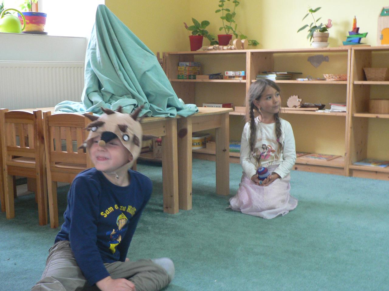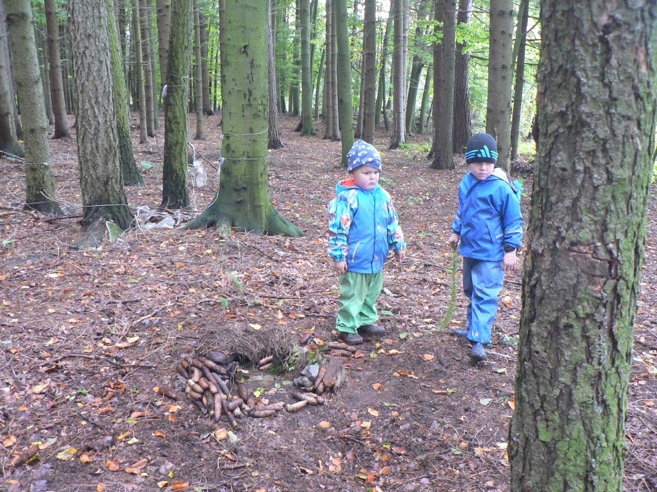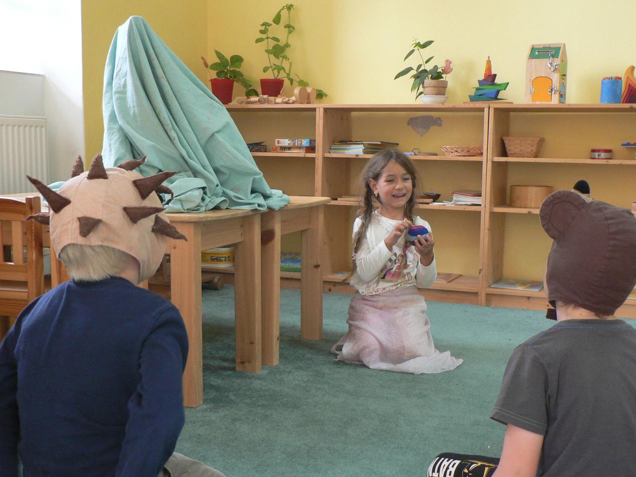 Pohádka „Jak víla Amálka pomáhala ježčí tlapce“ nás zavedla do podzimního lesa, na jehož kraji právě dozrávala planá jablíčka. A takové napůl uzrálé jablíčko je pro vílu velmi důležité… a také je důležité umět požádat o pomoc ve chvíli, kdy na něco sami nestačíme. Víle v pohádce pomohli ježečci, poraněná ježčí tlapka byla uzdravena a všechno dobře dopadlo. A ježci nás provázeli i při tvoření, lepili jsme bodlinky, skládali ježky z papíru, vytrhávali a nalepovali jablůňky i víly. O ježcích jsme se také dozvěděli hodně zajímavého, třeba to, kde je můžeme najít, jak přezimují, čím se živí nebo jak jim vytvořit vhodné prostředí na zahrádce. Naučili jsme se novou písničku a připomněli si i jiné, které už známe. Na začátku týdne nám přálo pěkné počasí, které jsme znovu využili a vyrazili na delší cestu za hledáním kaštanů, odměnou v cíli nám byly nejen krásné kaštany na další tvoření, ale i nová místa na hraní, která jsme cestou potkali. A ve čtvrtek se děti na chvíli proměnily na víly, ježky, sojku či měsíček a celou pohádku si samy zahrály.
