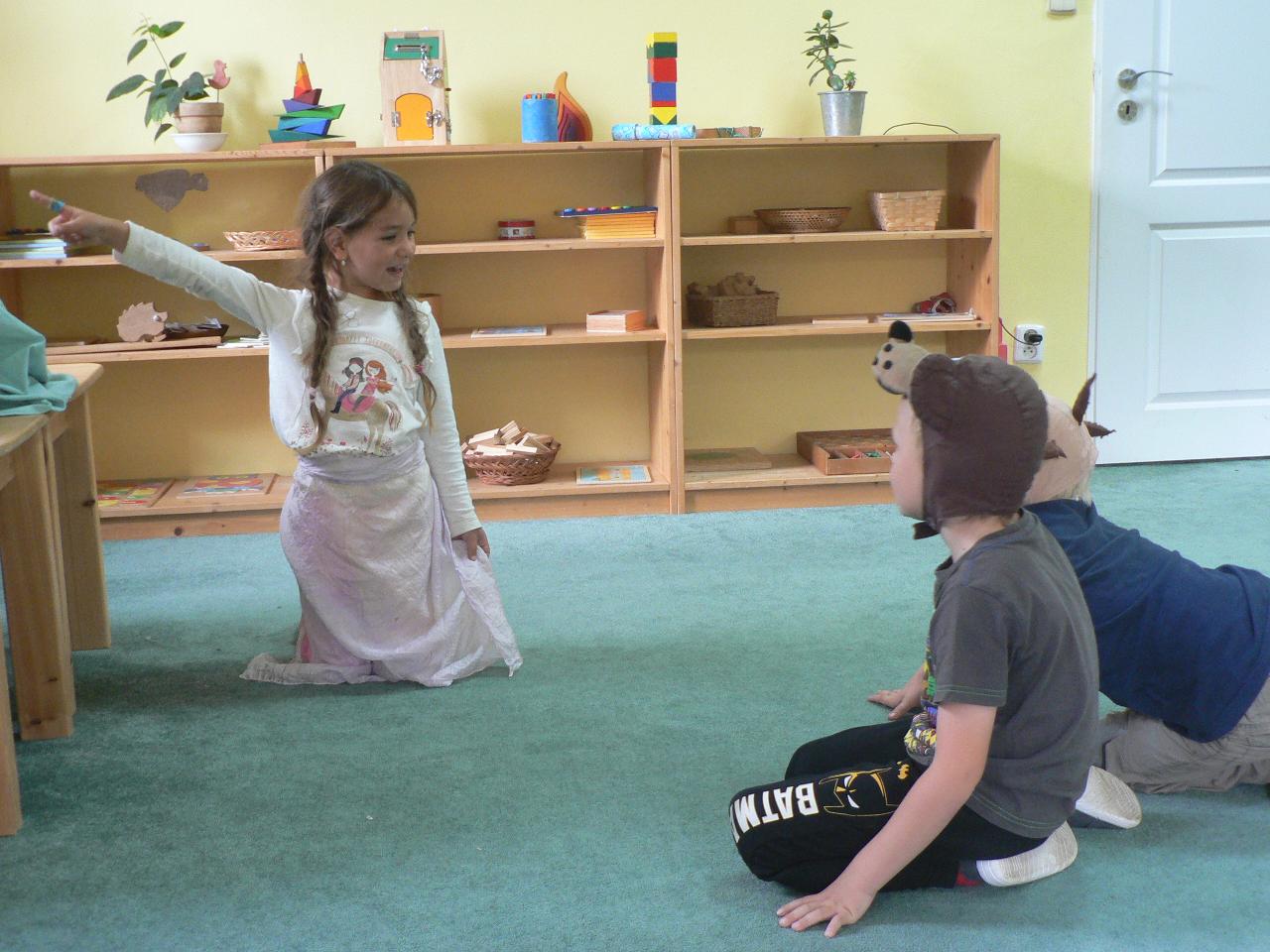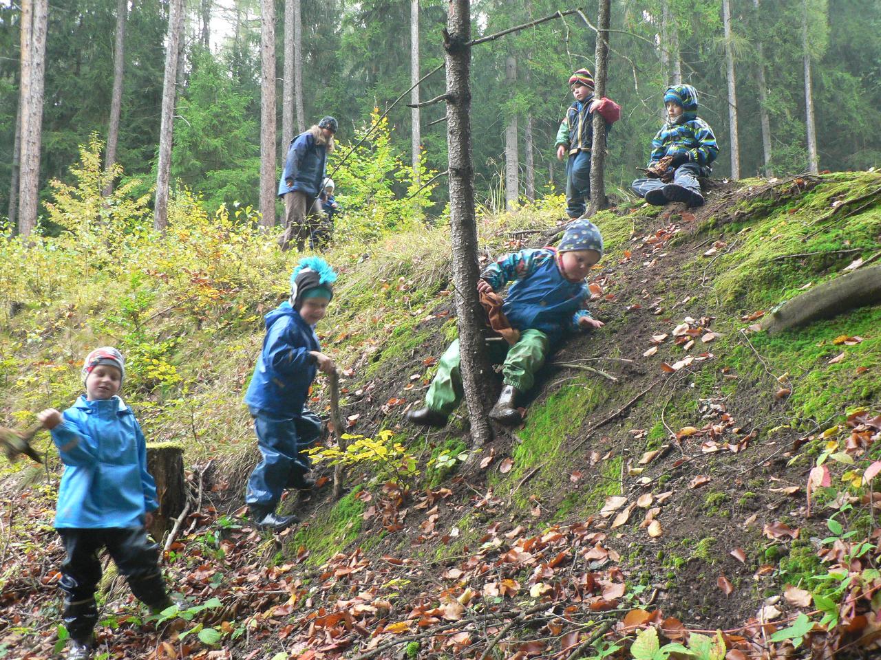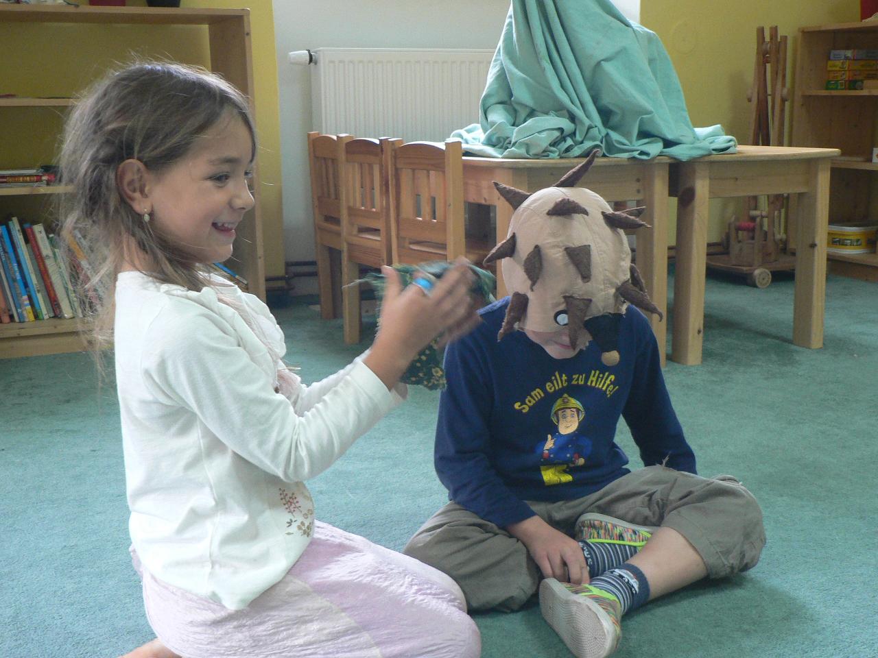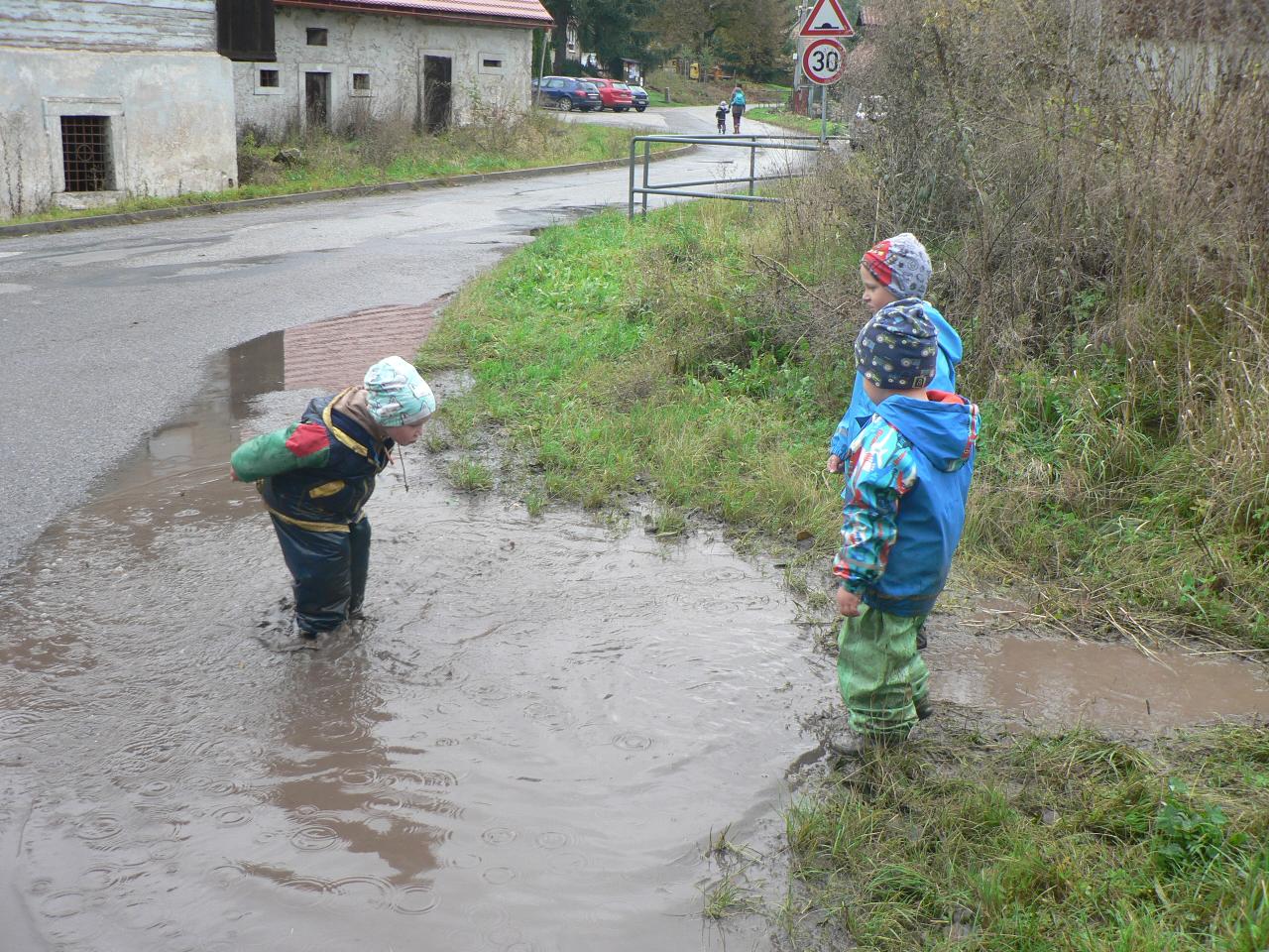 Pohádka „Jak víla Amálka pomáhala ježčí tlapce“ nás zavedla do podzimního lesa, na jehož kraji právě dozrávala planá jablíčka. A takové napůl uzrálé jablíčko je pro vílu velmi důležité… a také je důležité umět požádat o pomoc ve chvíli, kdy na něco sami nestačíme. Víle v pohádce pomohli ježečci, poraněná ježčí tlapka byla uzdravena a všechno dobře dopadlo. A ježci nás provázeli i při tvoření, lepili jsme bodlinky, skládali ježky z papíru, vytrhávali a nalepovali jablůňky i víly. O ježcích jsme se také dozvěděli hodně zajímavého, třeba to, kde je můžeme najít, jak přezimují, čím se živí nebo jak jim vytvořit vhodné prostředí na zahrádce. Naučili jsme se novou písničku a připomněli si i jiné, které už známe. Na začátku týdne nám přálo pěkné počasí, které jsme znovu využili a vyrazili na delší cestu za hledáním kaštanů, odměnou v cíli nám byly nejen krásné kaštany na další tvoření, ale i nová místa na hraní, která jsme cestou potkali. A ve čtvrtek se děti na chvíli proměnily na víly, ježky, sojku či měsíček a celou pohádku si samy zahrály.