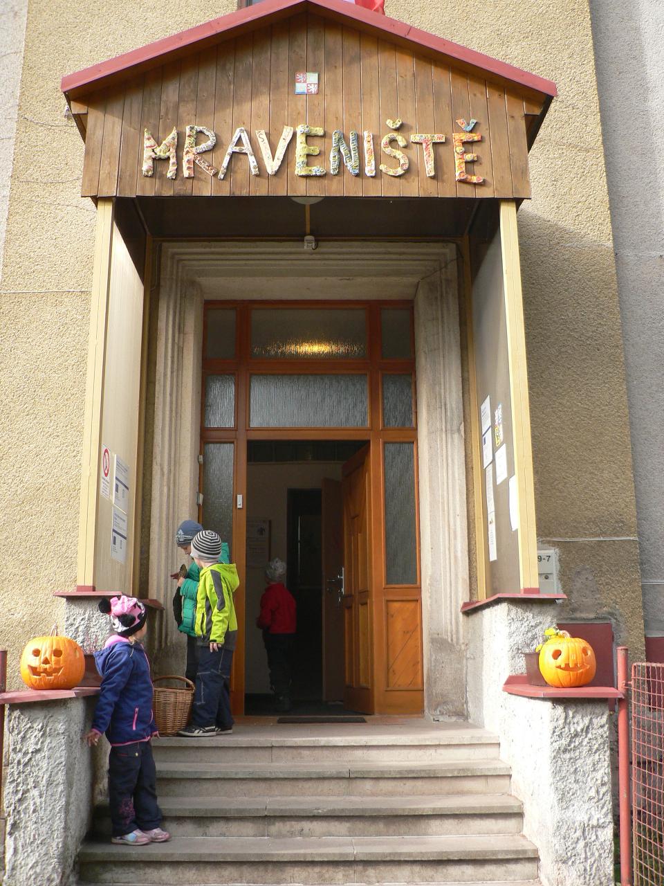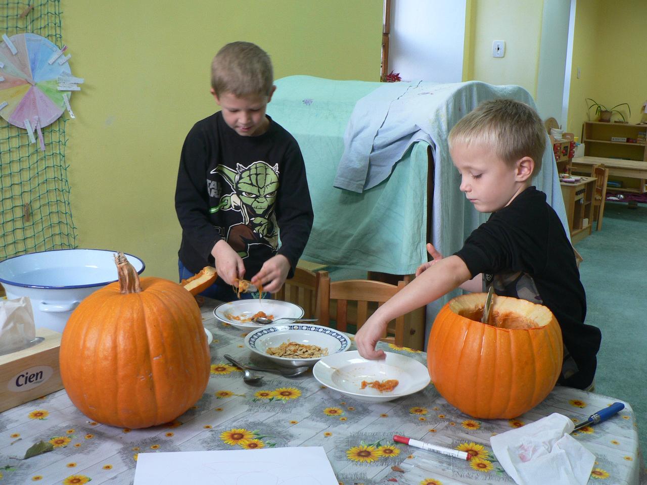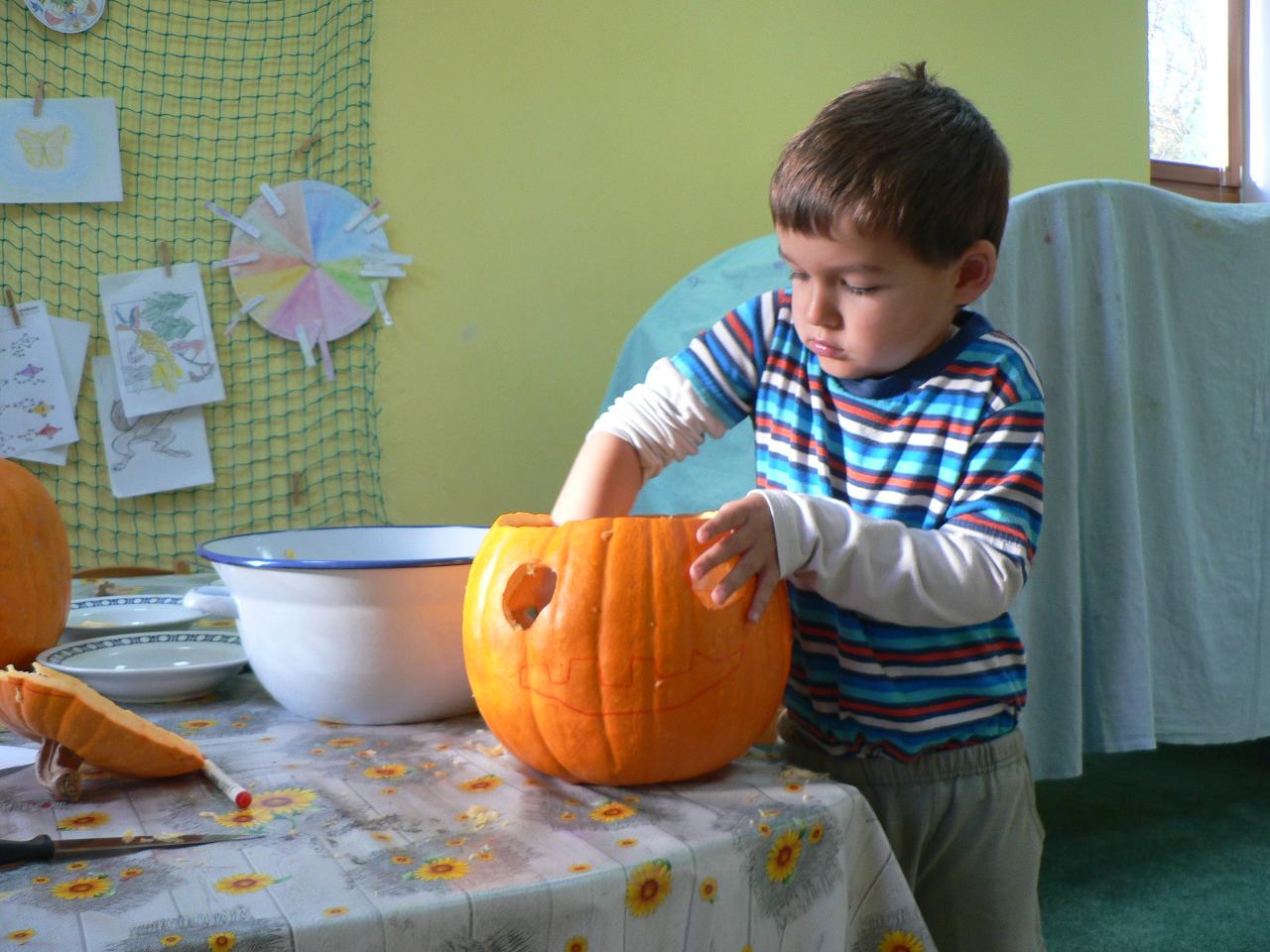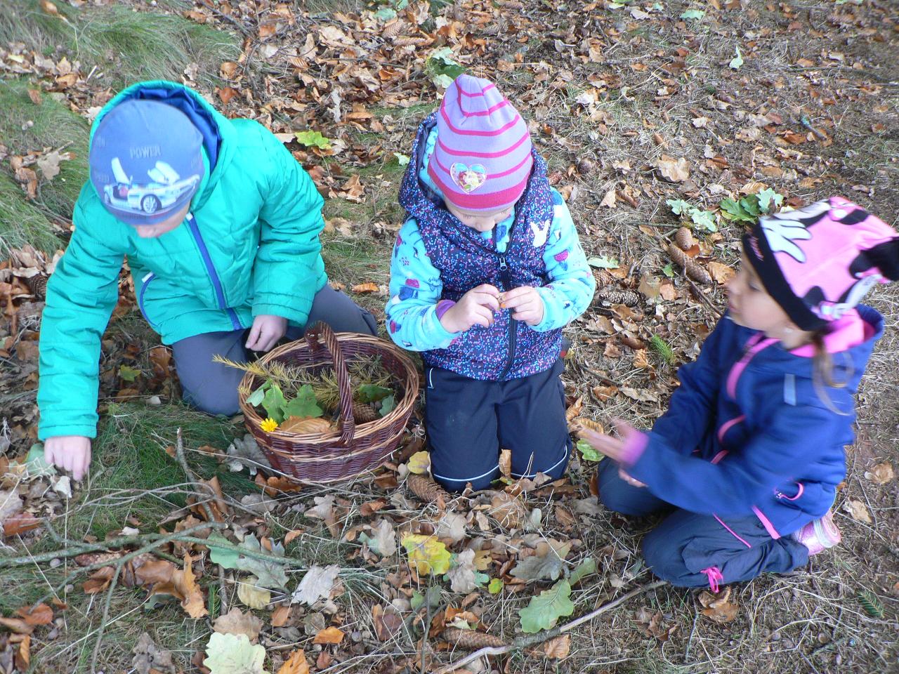 je úvodní říkačka k naší podzimní hře a my jsme tentokrát prožili další nádherný a barevný podzimní týden s pohádkou o skřítkovi Podzimníčkovi a víle Salvince. S pohádkou o tom, jak velkou sílu má skutečné přátelství a že na každý smutek existuje lék. A také o kouzlu, které způsobilo, že se nám stromy každý podzim tak krásně zbarvují. Celý týden byl plný barev a kouzel. Děti zkoušely barevné listy ještě víc obarvit a obtiskávat na papír, v lese jsme nasbírali spoustu materiálu na výrobu skřítků Podzimníčků a postavili jim v lese hodně domečků. Abychom si vše naplno užili, do listí jsme padali, skákali a někteří se do listí pokoušeli zahrabat úplně celí. A protože podzimní doba pokročila a venkovního světla začalo postupně ubývat, došlo i na dlabání dýňových luceren, které nám nyní zdobí vchod do školky. Z vnitřku vydlabaných dýní navíc byla v pátek k obědu vynikající polévka :)