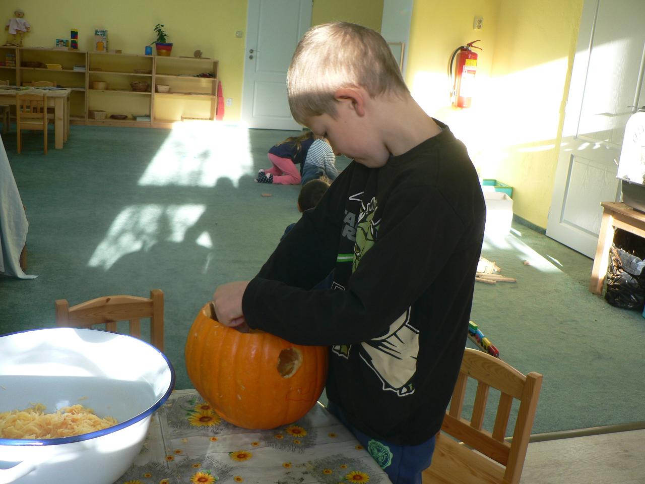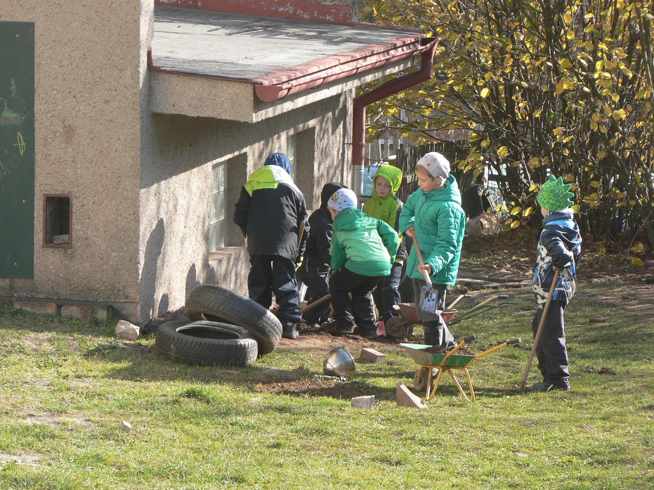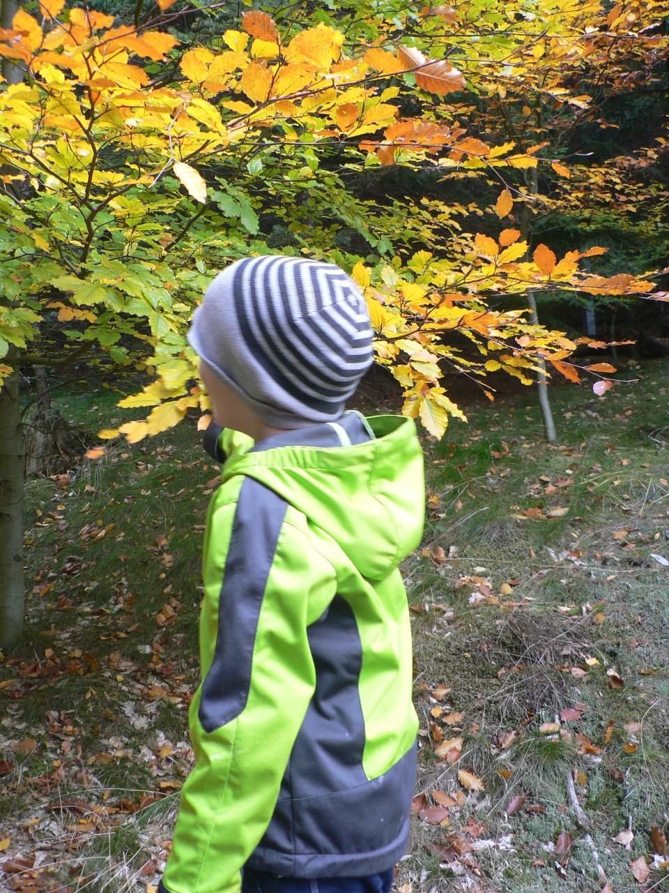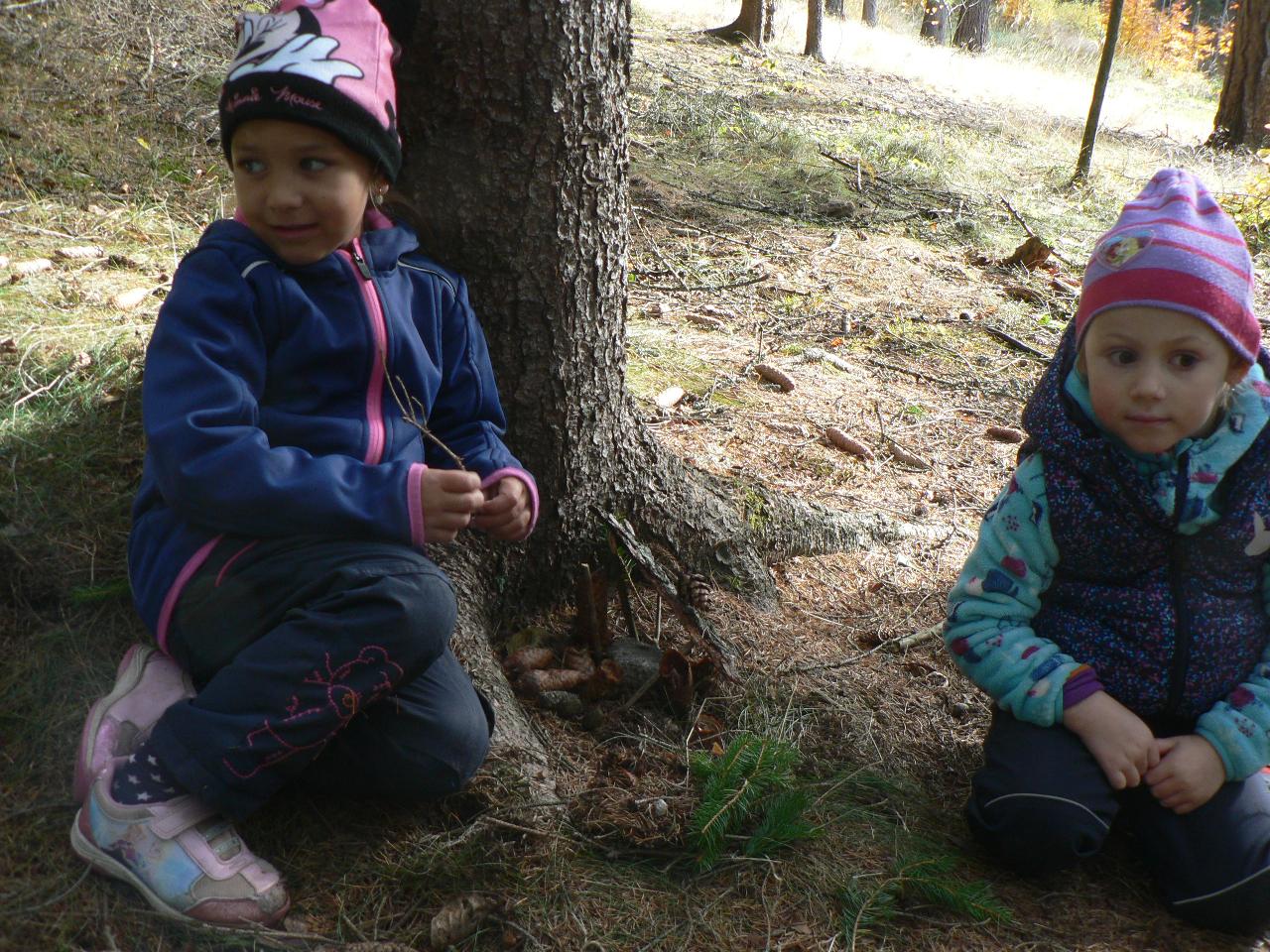 je úvodní říkačka k naší podzimní hře a my jsme tentokrát prožili další nádherný a barevný podzimní týden s pohádkou o skřítkovi Podzimníčkovi a víle Salvince. S pohádkou o tom, jak velkou sílu má skutečné přátelství a že na každý smutek existuje lék. A také o kouzlu, které způsobilo, že se nám stromy každý podzim tak krásně zbarvují. Celý týden byl plný barev a kouzel. Děti zkoušely barevné listy ještě víc obarvit a obtiskávat na papír, v lese jsme nasbírali spoustu materiálu na výrobu skřítků Podzimníčků a postavili jim v lese hodně domečků. Abychom si vše naplno užili, do listí jsme padali, skákali a někteří se do listí pokoušeli zahrabat úplně celí. A protože podzimní doba pokročila a venkovního světla začalo postupně ubývat, došlo i na dlabání dýňových luceren, které nám nyní zdobí vchod do školky. Z vnitřku vydlabaných dýní navíc byla v pátek k obědu vynikající polévka :)