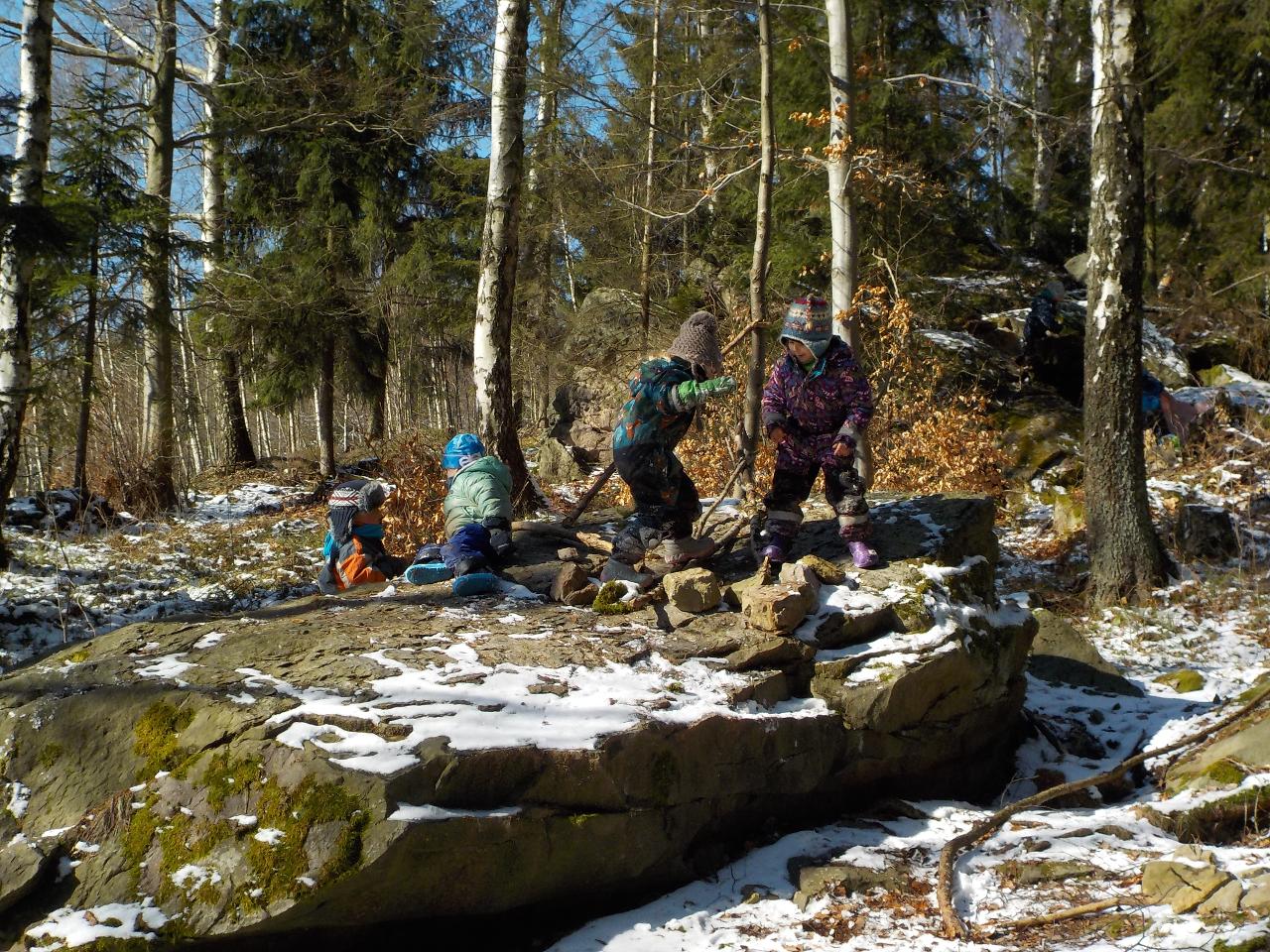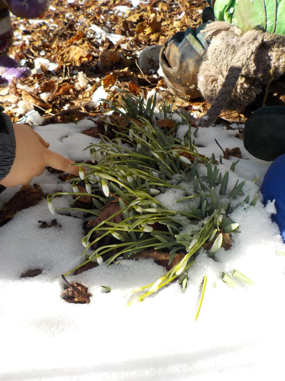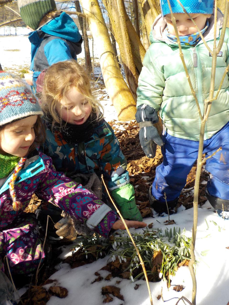 Už nastal ten spráný čas. Na první pohled se to nezdá, ale mezi sněhem už vykukují první kytičky, na svou cestu se musely nejprve pořádně připravit. Maminka Země je probudila, ony umyly, ušily si šatečky a odvážně vyrazily nahoru na zem. Sluníčko je svými paprsky hladí a ony se ledového větru a zbytků sněhu vůbec nebojí, vždyť mají sníh ve svém jméně. Našli jsme i první planou pažitku, a tak kluci neváhali a zamrazili si ji do ledových koulí, aby jim déle vydržela. Venku pozorujeme každou změnu, prní pupeny, tu příjemnou sluneční vůni, která nás láká svlékat čepice a rozepínat kombinézy. Jak nadějné to je. Jsme hodně venku a užíváme si to. A ve školce si na takové malé probouzející kytičky hrajeme a nejen na ně. Naposledy zkousíme, jak hraje harmonička, zkoumáme další skvělé vynálezy jako je foťák, hrajeme si na piloty a nasazujeme přilby. Jak krásné je spojení větších a menších dětí, kdy to vše ladí a doplňuje se, nikdo nikým neopovrhuje a radostně je bere k sobě a vše se vzájemně učí.