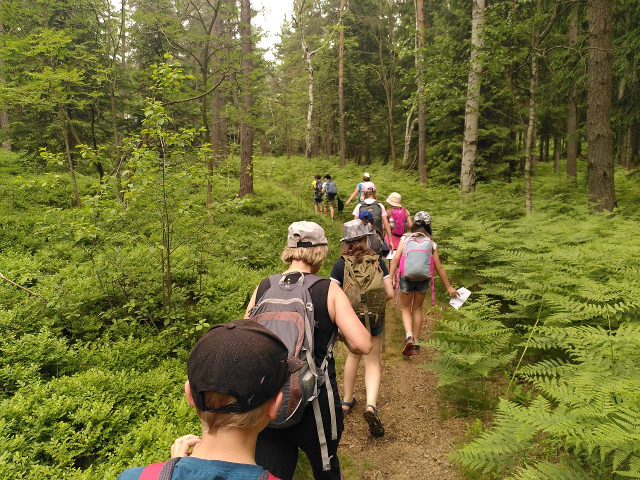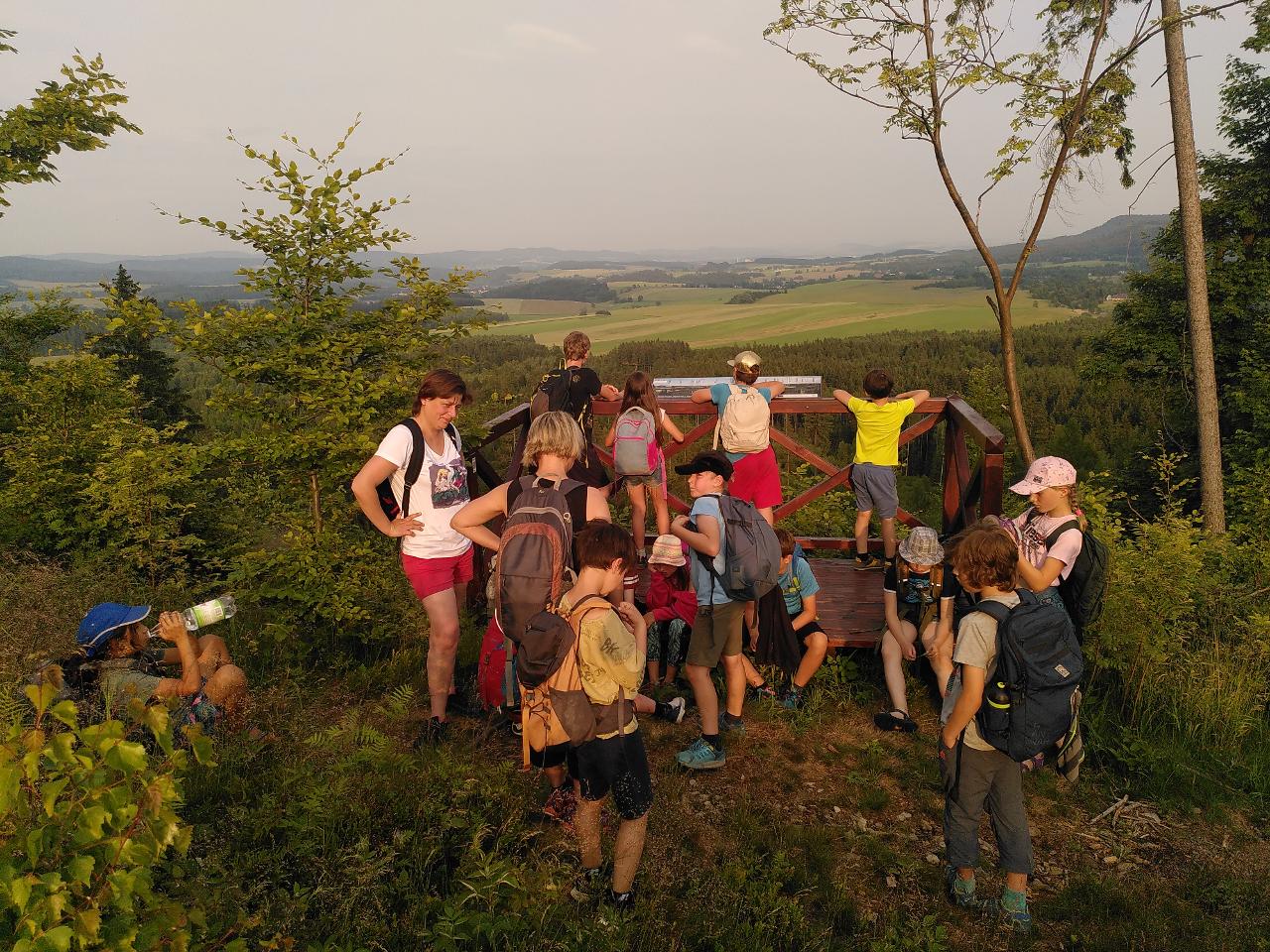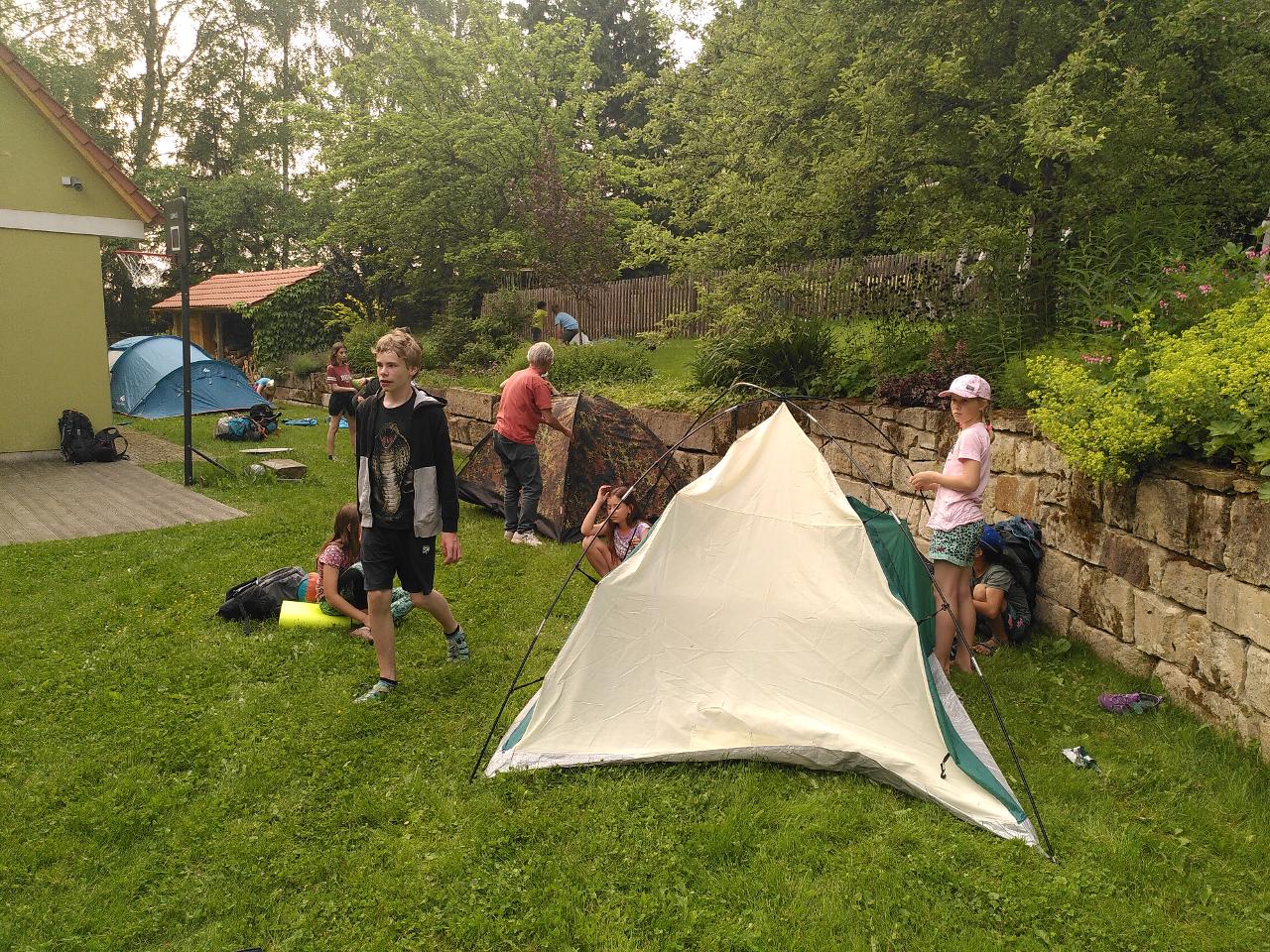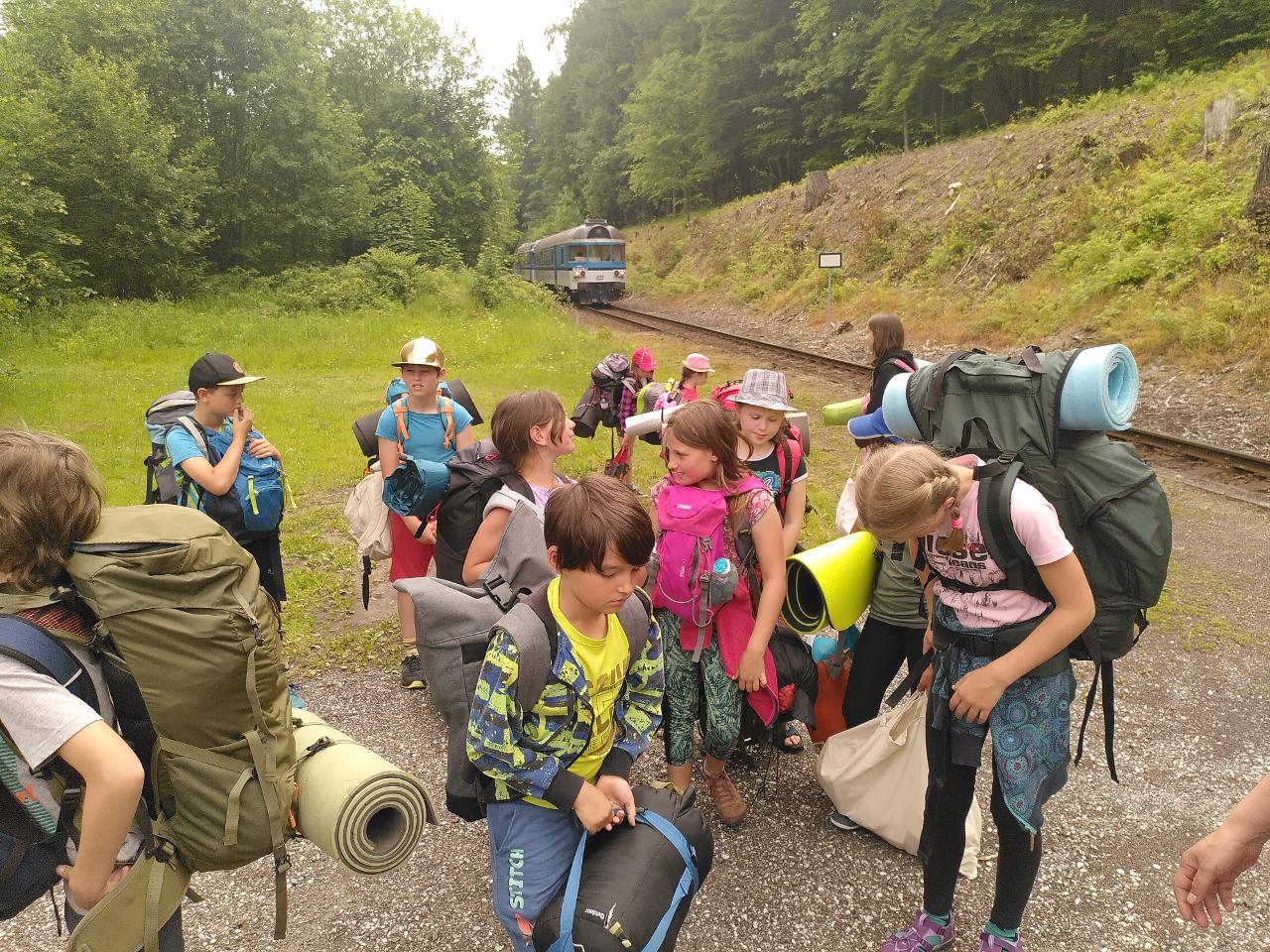 Na konci školního roku jsme i letos vyrazili na třídní výlet. Společně se školáky jsme dali dohromady, co by kdo chtěl během výletu zažít a snažili jsme se najít takovou možnost, která by splnila největší část přání. Před odjezdem vlaku v pondělí ráno jsme měli čas si po skupinkách nakoupit naplánovaného jídlo a rozpočítat peníze. Dále jsme už vyrazili na Horní Adršpach k Saše, kde jsme si pohráli na hřišti, domácím boulderu či v bazéně. Velké batohy nám odvezl Bob, taťka Benjiho na místo kam jsme putovali. Posilněni domácí bramboračkou (od Saši) i zmrzlinou, vyrazili jsme na odpolední putování. Část jsme šli přímo po hranicích, jednou nohou v Polsku, jednou v Česku. Viděli jsme rozpukané pískovce, prošli jsme vysídlenou obec Libnou, přes výhledy z Mirošovických stěn a kolem smírčího kříže na Bukové hoře jsme po skoro 20 km došli až k Benjimu domů, na nejvzdálenější konec Horních Teplic. Každá skupinka si uvařila večeři, postavila stan. Druhý den jsme si užili hřiště, někdo i motorku. Taktéž jsme prohodili pár slov “in English” s Bobem “from the USA”. Pak nás už čekala jen cesta do Teplic na zmrzlinu a vlak. V další části týdne jsme se ve škole věnovali zejména přípravě zahradní slavnosti. Školáci vymýšleli, dělili si role, připravovali kulisy a zkoušeli a zkoušeli.