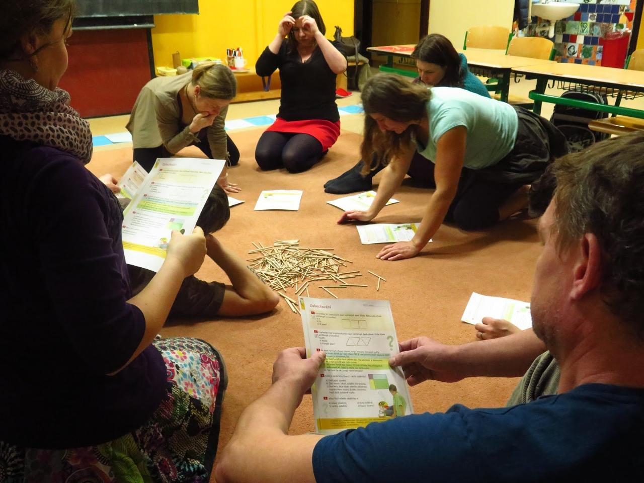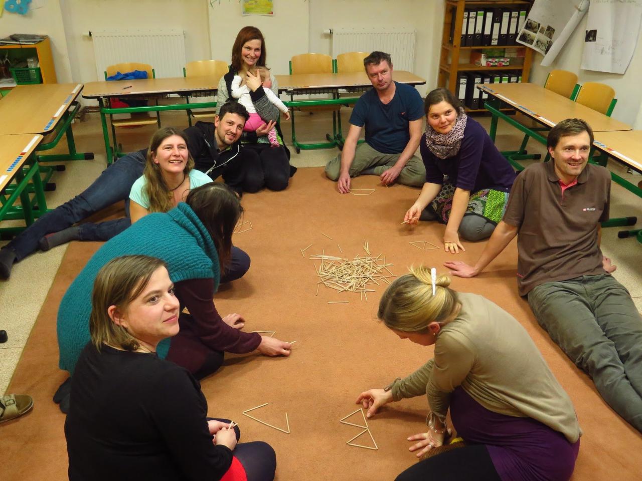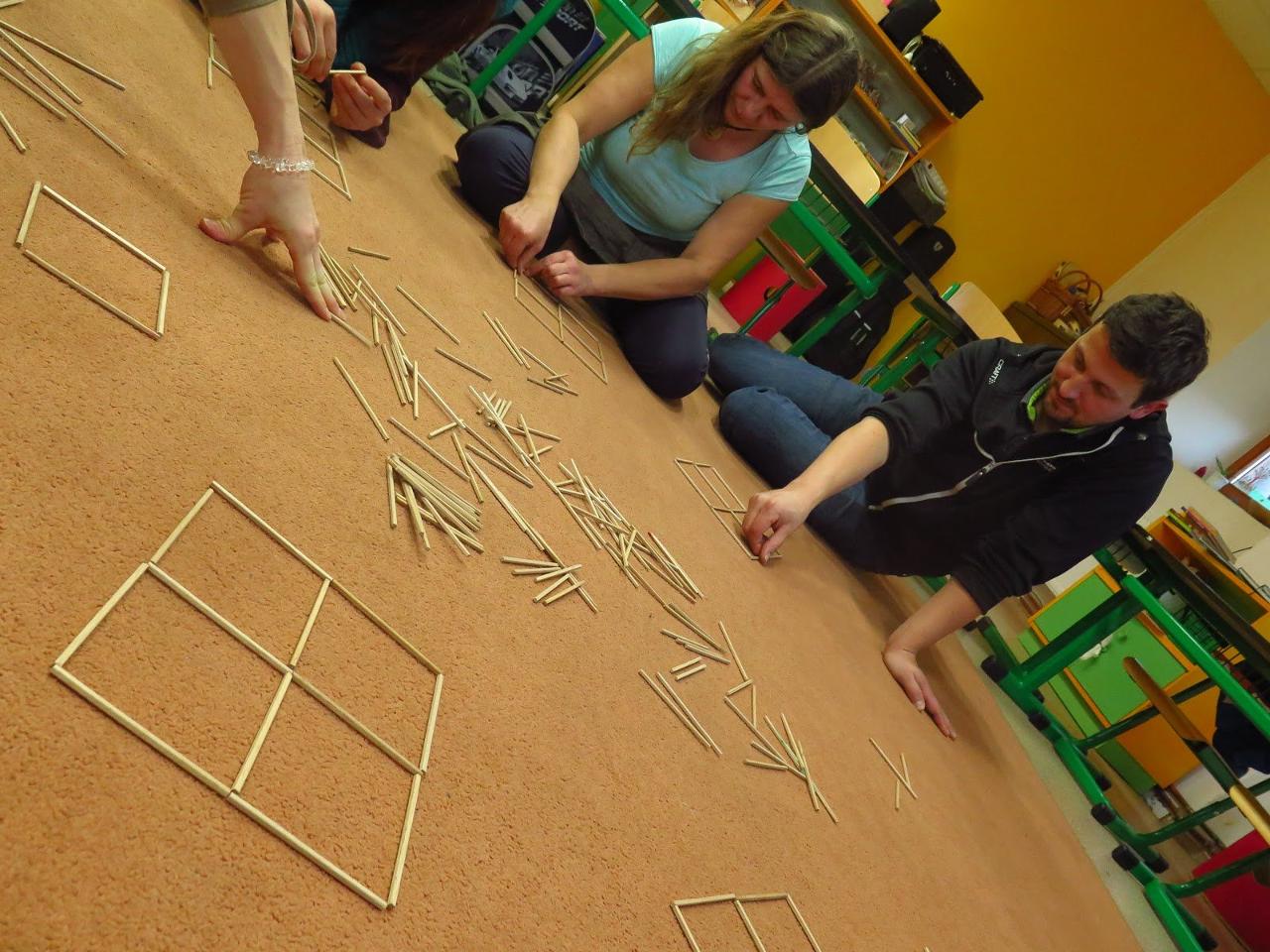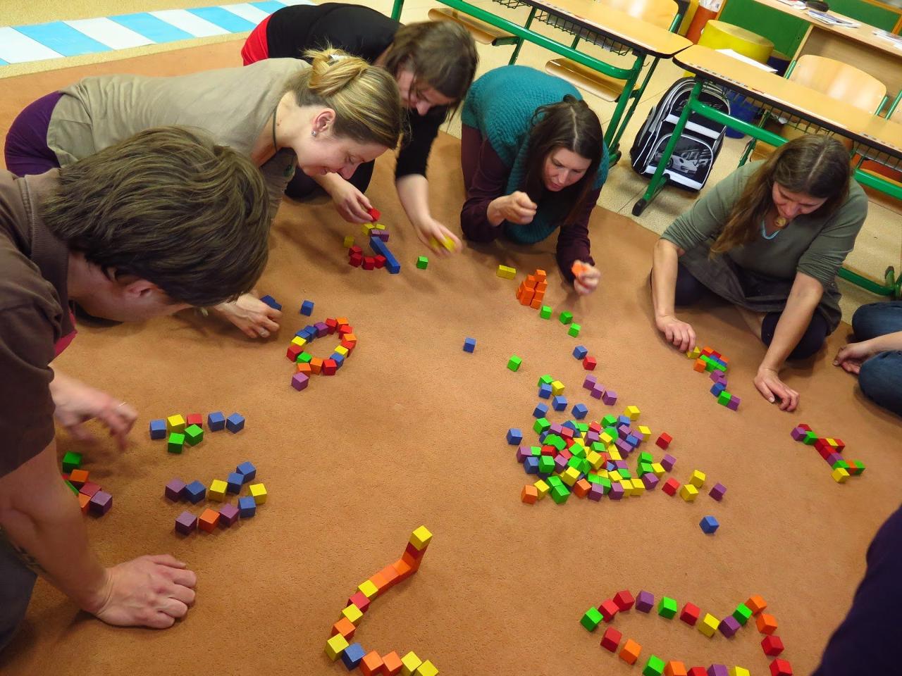 Dále jsme si vyzkoušeli samotnou práci žáků - způsob práce v prostředí krychlových staveb a dřívek. Stavěli jsme volné stavby, zvířata, řešili jsme, co bylo pro nás obtížné. Došli jsme ke gradaci náročnosti úloh, vzájemně jsme sdíleli, inspirovali se a hledali odpovědi na vznikající otázky. Dřívka nás dovedla k tvorbě geometrických tvarů v rovině i nám pomohla k pochopení posloupnosti a následnému vyvození vzorečku. Společně prožité tři hodiny nám umožnily objevit radost, hru i učení zkušeností, kterou prožívají při matematice školáci. A to jsme opravdu jen na začátku možností, které Hejného matematika nabízí…