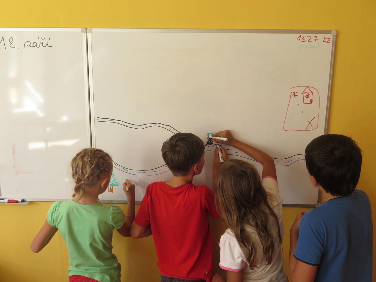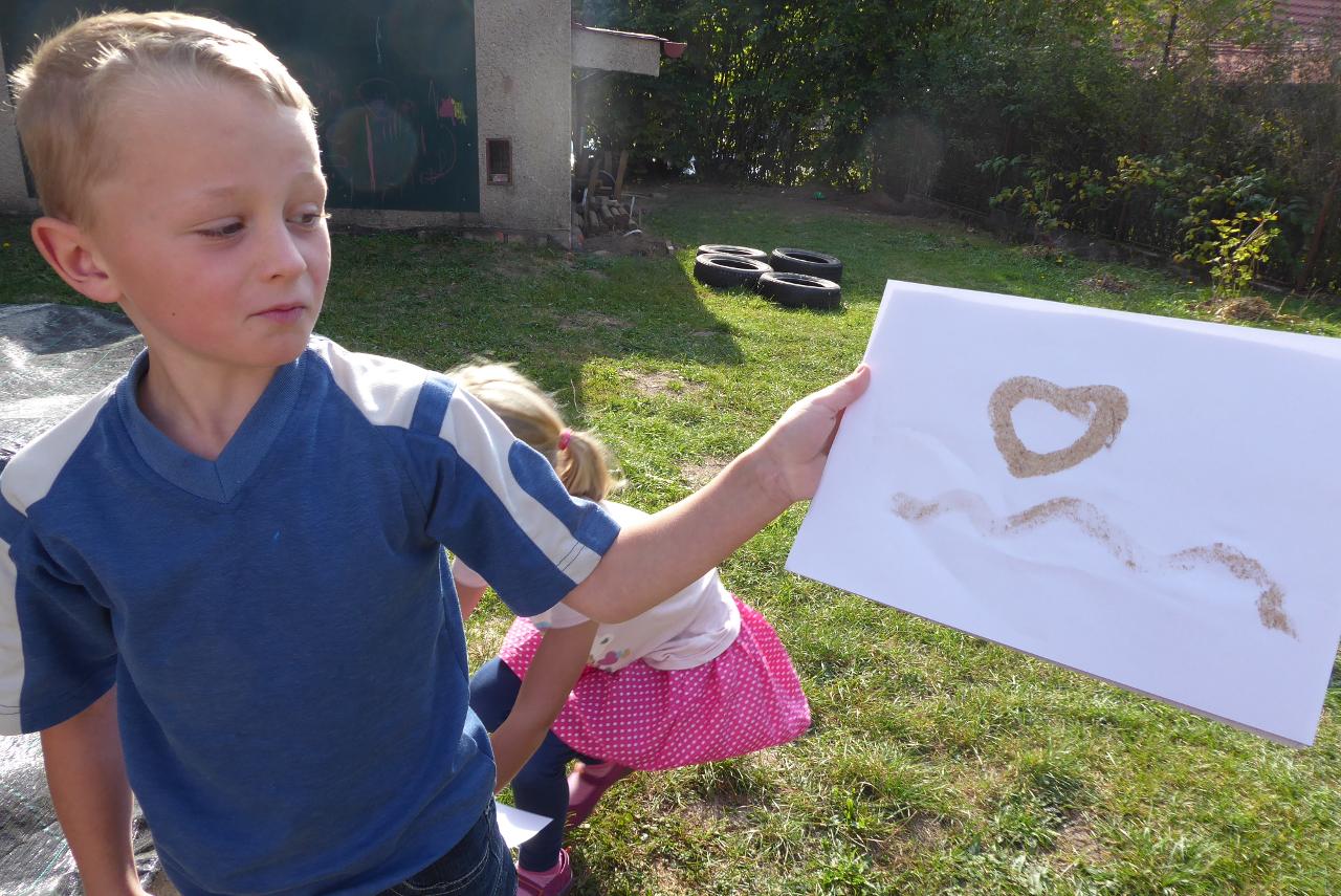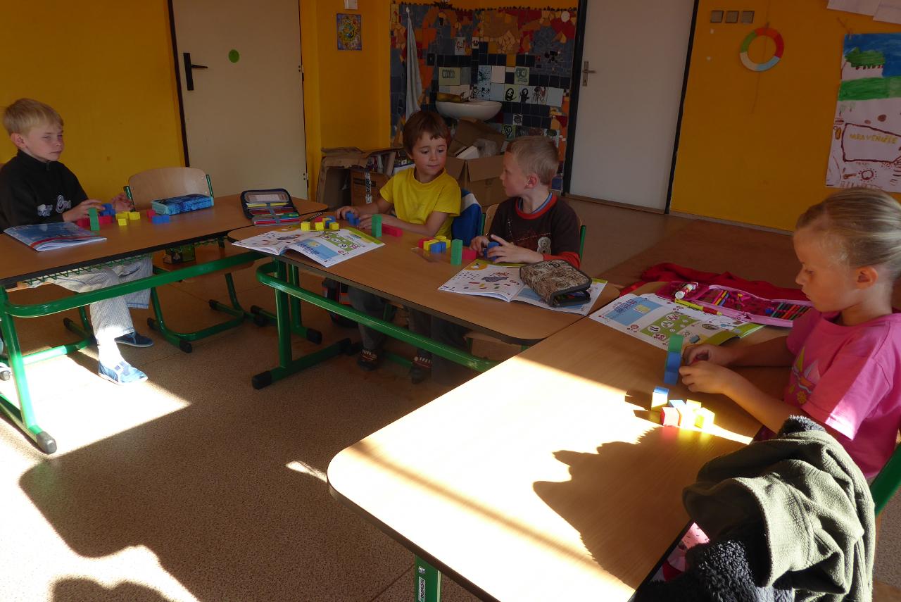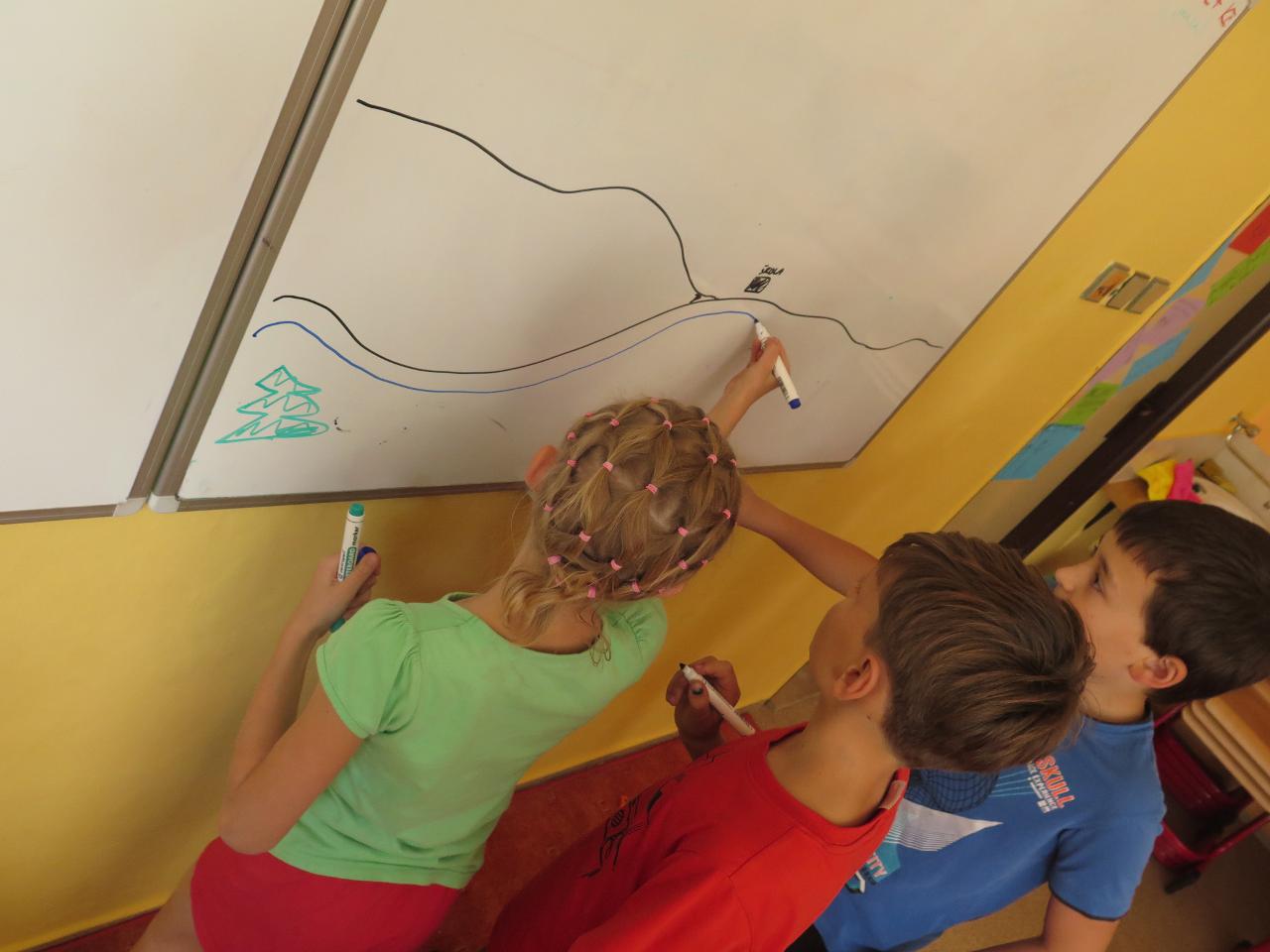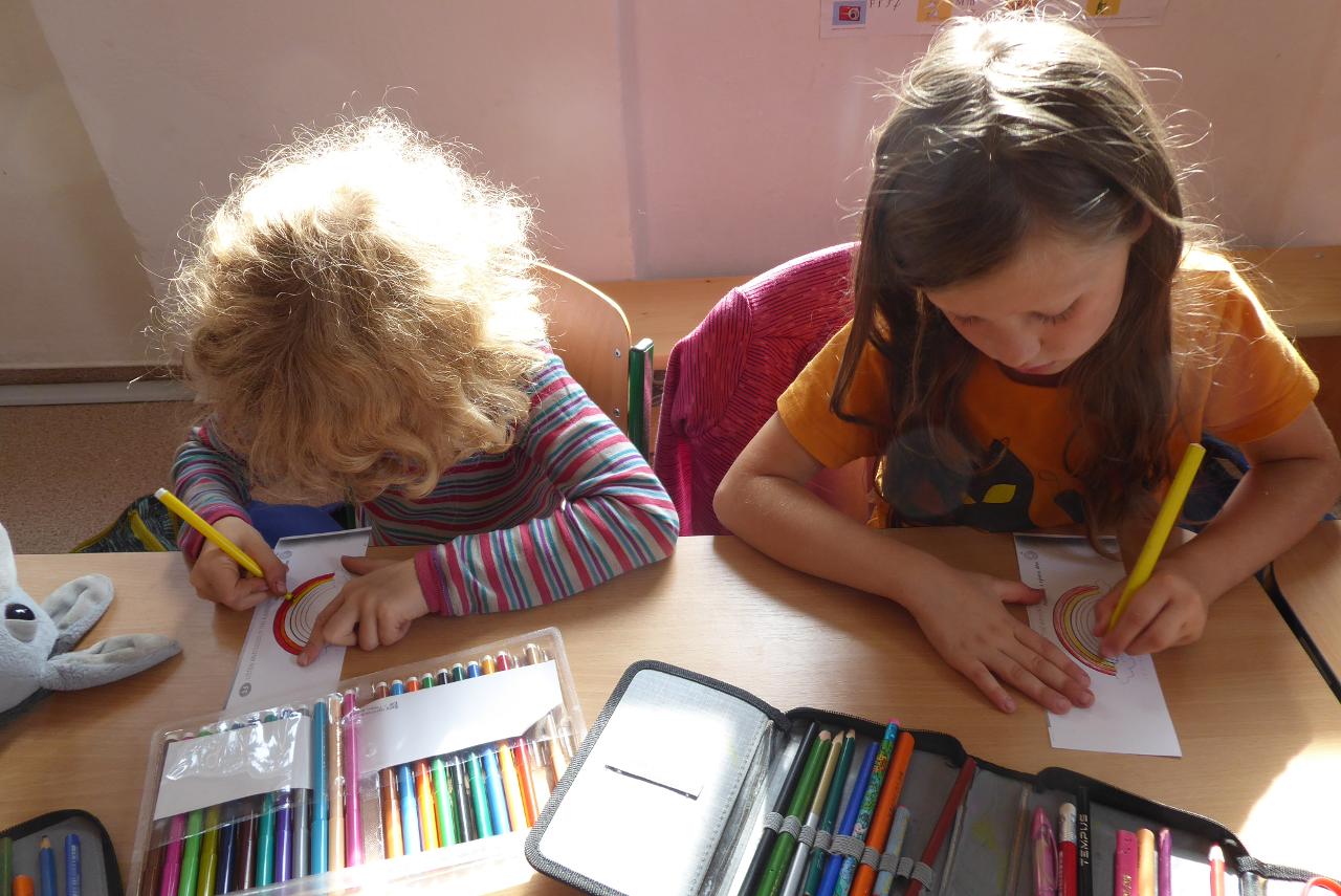 S menšími dětmi jsme si pak vyrobili model školy, kostela a blízkého okolí. V českém jazyce jsme objevovali dřevěná písmenka nebo jsme si parádně uvolnili ruce malováním pískových obrázků. V matematice jsme s nejmenšími objevovali nová matematická prostředí Hejného matematiky, a to hlavně vláčky a krychlové stavby. A v angličtině jsme si písničkou i s pastelkami zopakovali barvy a moc nás to bavilo.