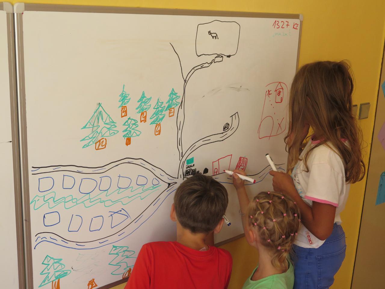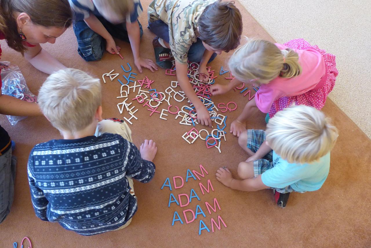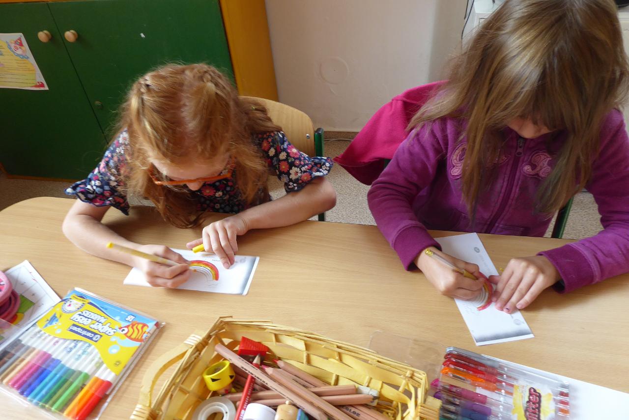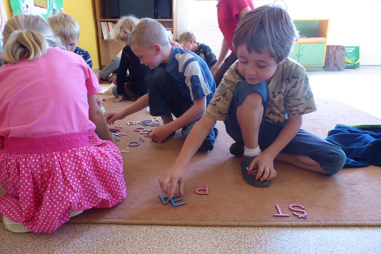 S menšími dětmi jsme si pak vyrobili model školy, kostela a blízkého okolí. V českém jazyce jsme objevovali dřevěná písmenka nebo jsme si parádně uvolnili ruce malováním pískových obrázků. V matematice jsme s nejmenšími objevovali nová matematická prostředí Hejného matematiky, a to hlavně vláčky a krychlové stavby. A v angličtině jsme si písničkou i s pastelkami zopakovali barvy a moc nás to bavilo.