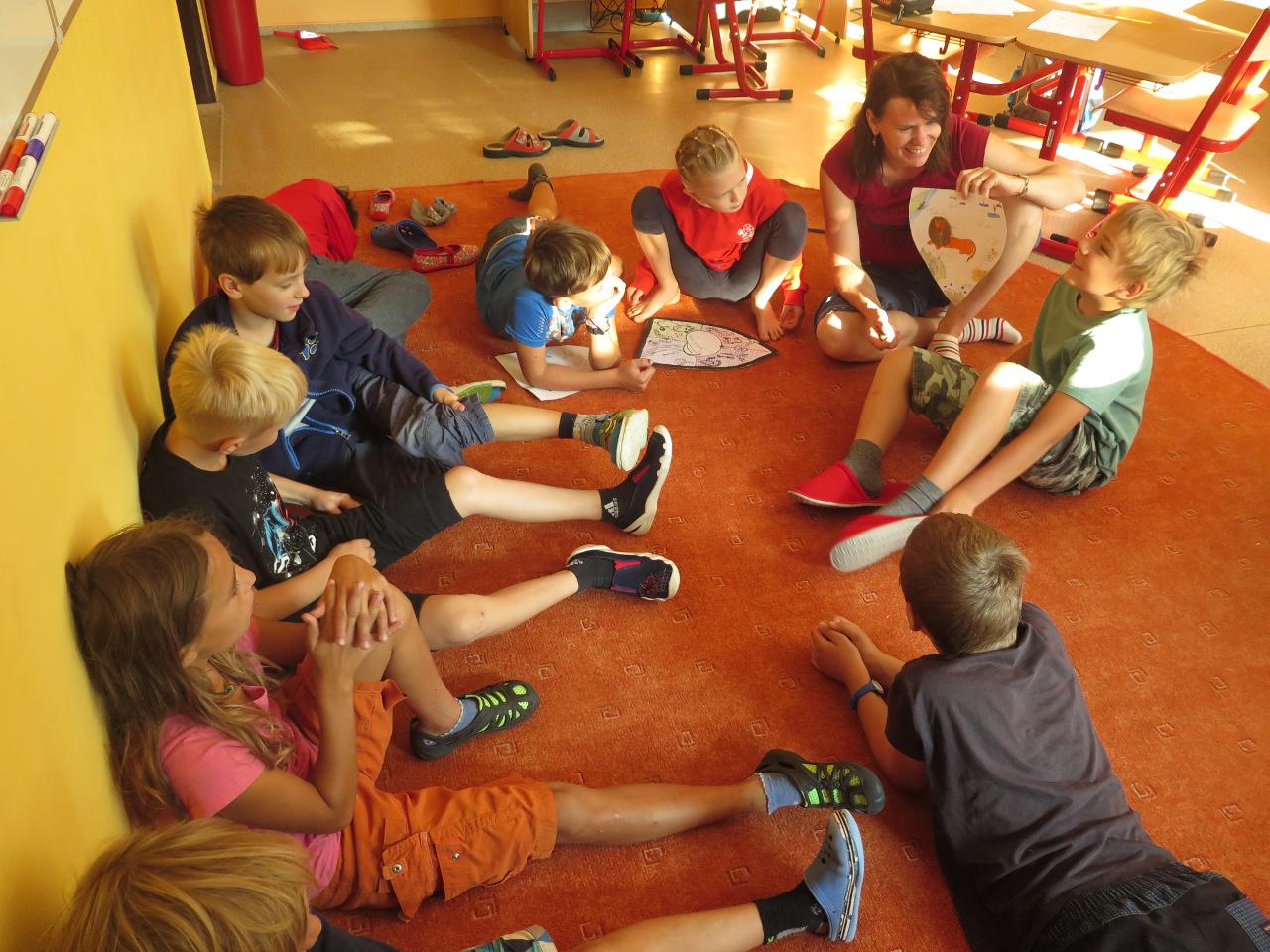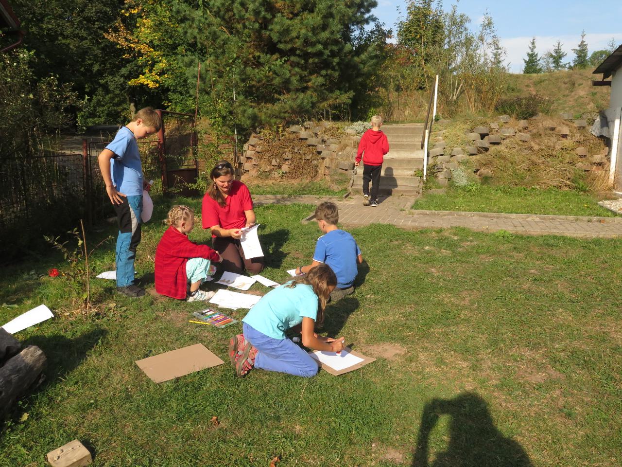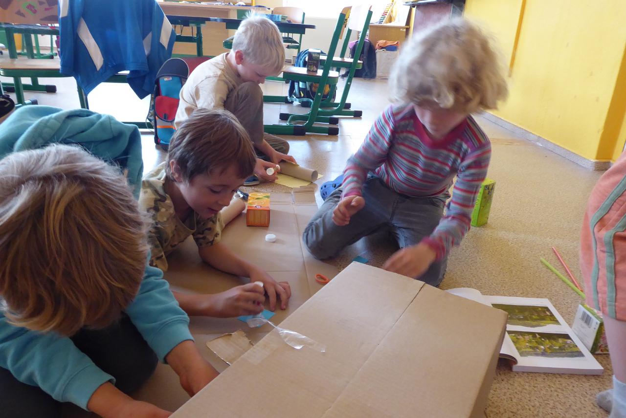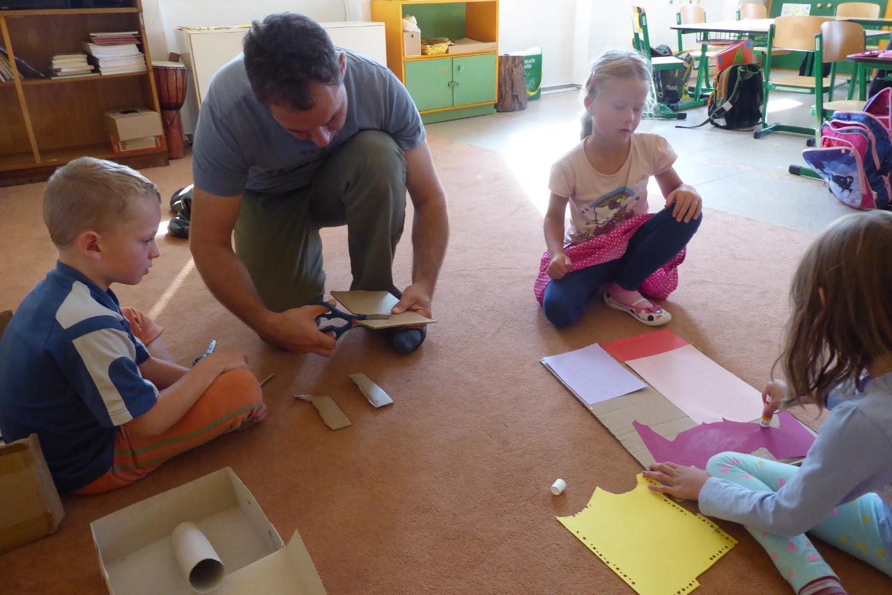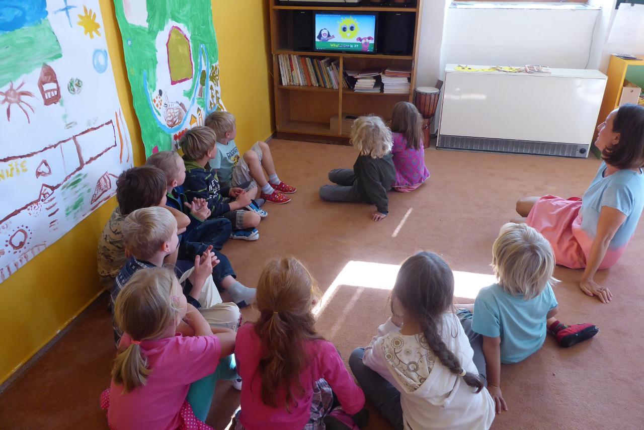 S menšími dětmi jsme si pak vyrobili model školy, kostela a blízkého okolí. V českém jazyce jsme objevovali dřevěná písmenka nebo jsme si parádně uvolnili ruce malováním pískových obrázků. V matematice jsme s nejmenšími objevovali nová matematická prostředí Hejného matematiky, a to hlavně vláčky a krychlové stavby. A v angličtině jsme si písničkou i s pastelkami zopakovali barvy a moc nás to bavilo.