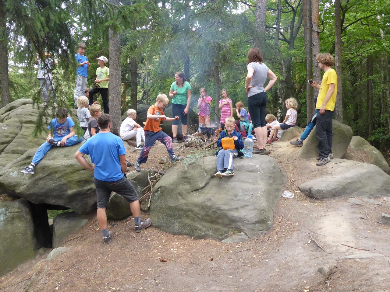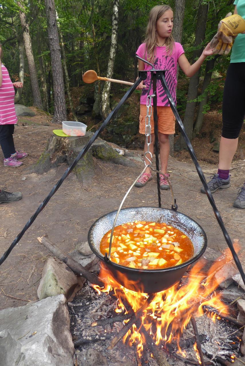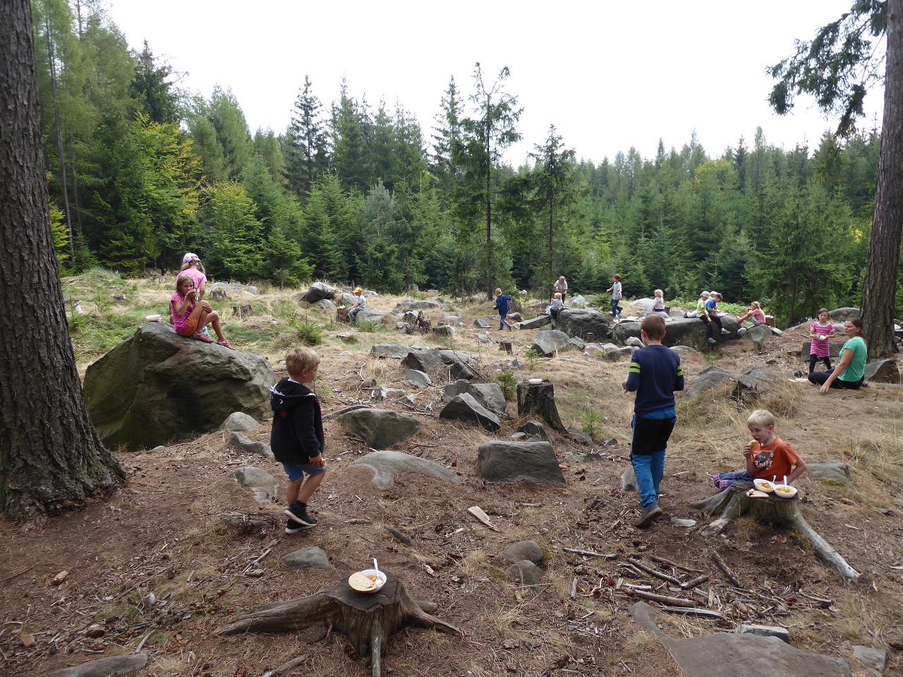 V rámci venkovního dne jsme vyrazili na Čížkovy kameny za poznáním širšího přírodního okolí školy a díky společné přípravě oběda od přinesení surovin a jejich krájení přes sbírání dřeva až po míchání kotlíku jsme posilovali spolupráci. Rozmanité hry nás zase vedly k posilování vzájemné důvěry a užili jsme si i skalní prolézačky.