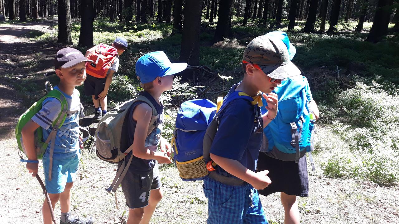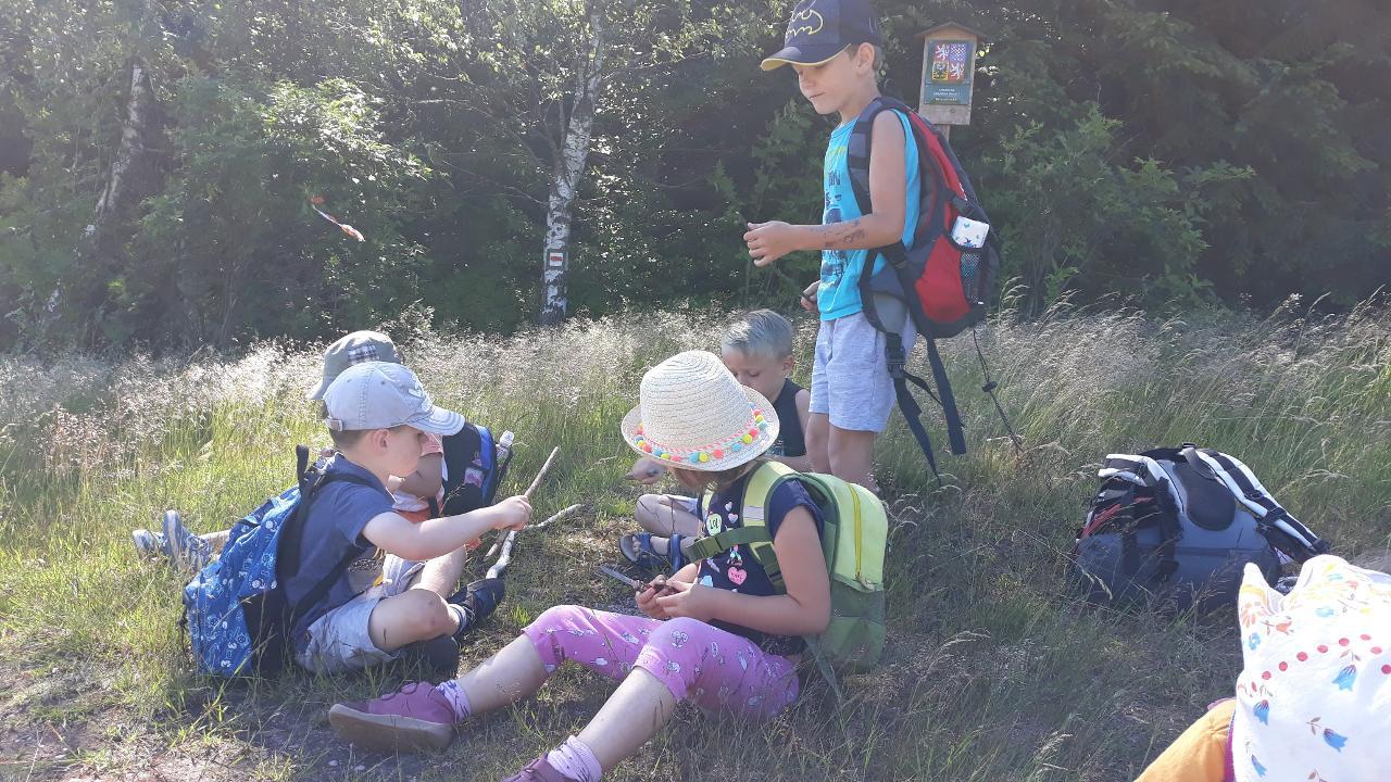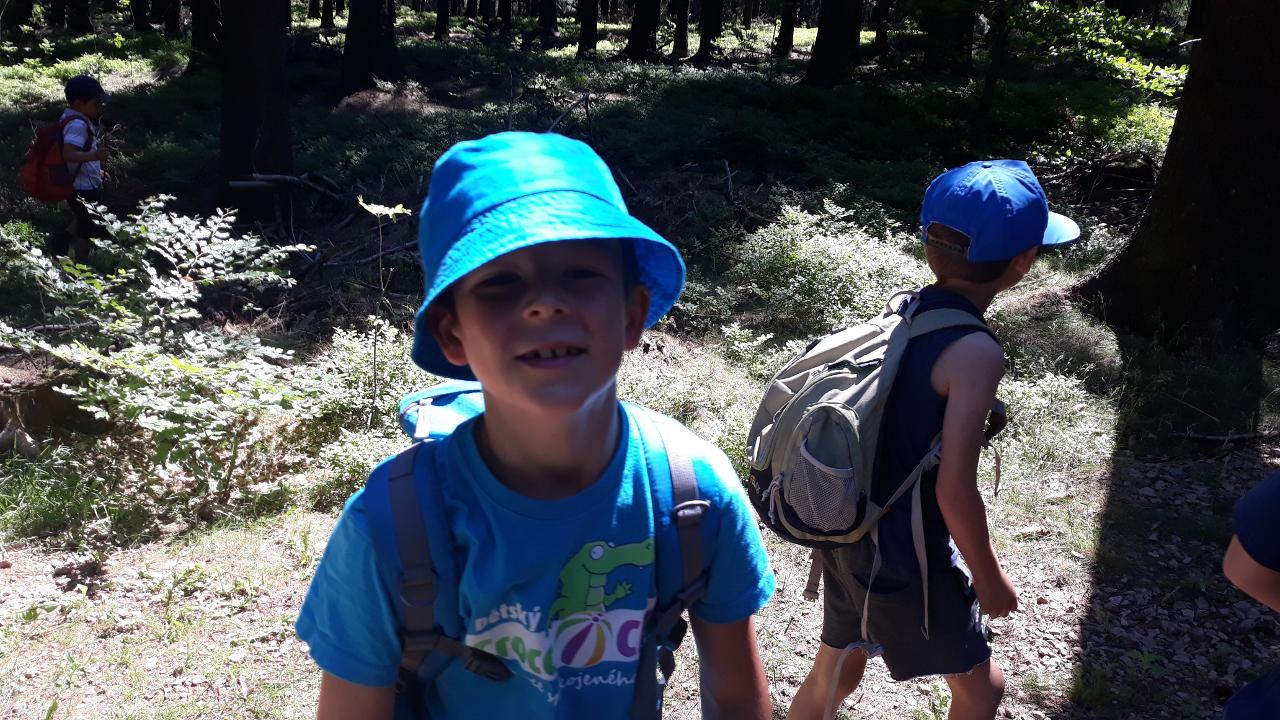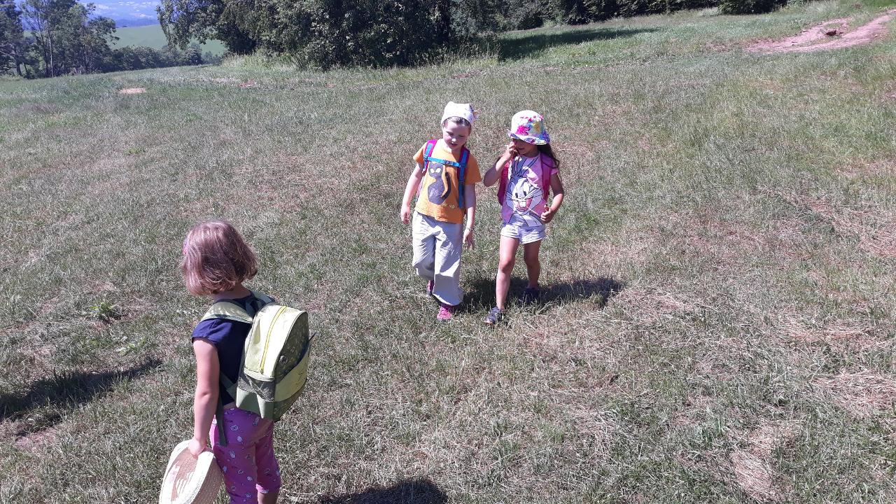 Hned v pondělí jsme s dětmi vyrazili na putování za poznáním. Naší cestou nás provázel příběh o malých indiánech z jedné daleké vesnice, kteří se vydali na cestu na vysokou horu, na cestu za poznáním sebe sama. S dětmi jsme cestou plnili různé úkoly, při kterých se projevila naše zručnost, šikovnost, také vytrvalost a schopnost překonávat překážky. Podívali jsme se do loupežnické jeskyně, sbírali dřevo na oheň, ořezávali si klacky na opékání, pochutnali si na čerstvých borůvkách a objevovali krásy okolní přírody. Všechny děti prokázaly velkou statečnost během celé cesty a také to, že umí táhnout za jeden provaz a navzájem si pomáhat, když je potřeba. Celý týden bylo velmi horké počasí, a tak jsme se také znovu vyrazili zchladit do potoka, naposledy navštívili naše oblíbená místa a společně si zahráli oblíbené hry nebo zpívali písničky, které jsme se společně během roku naučili. Poslední den školky jsme se také rozloučili s našimi předškoláčky.