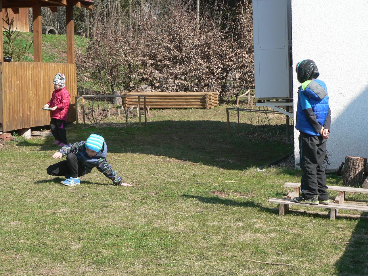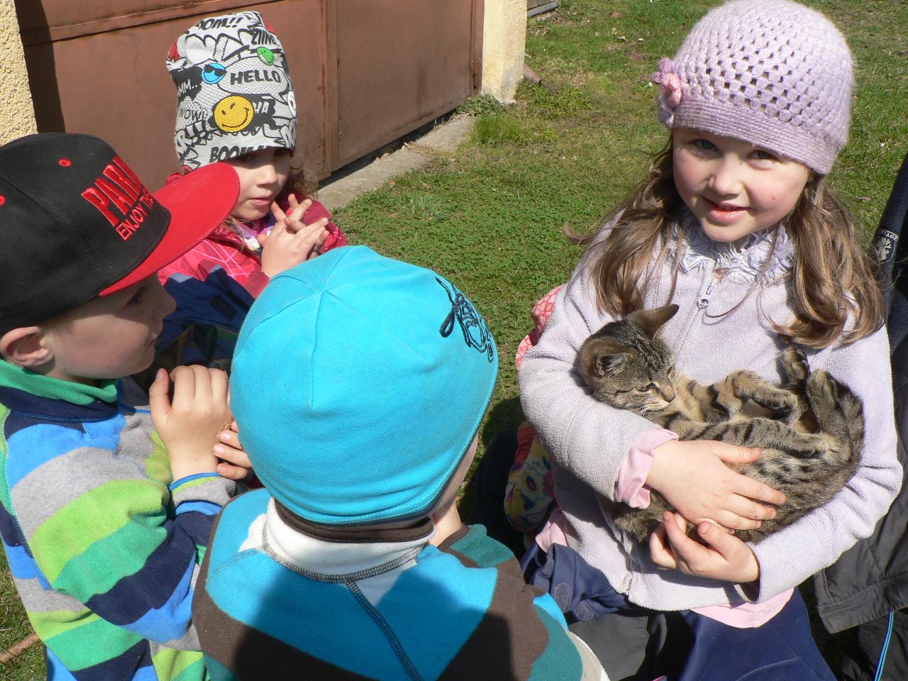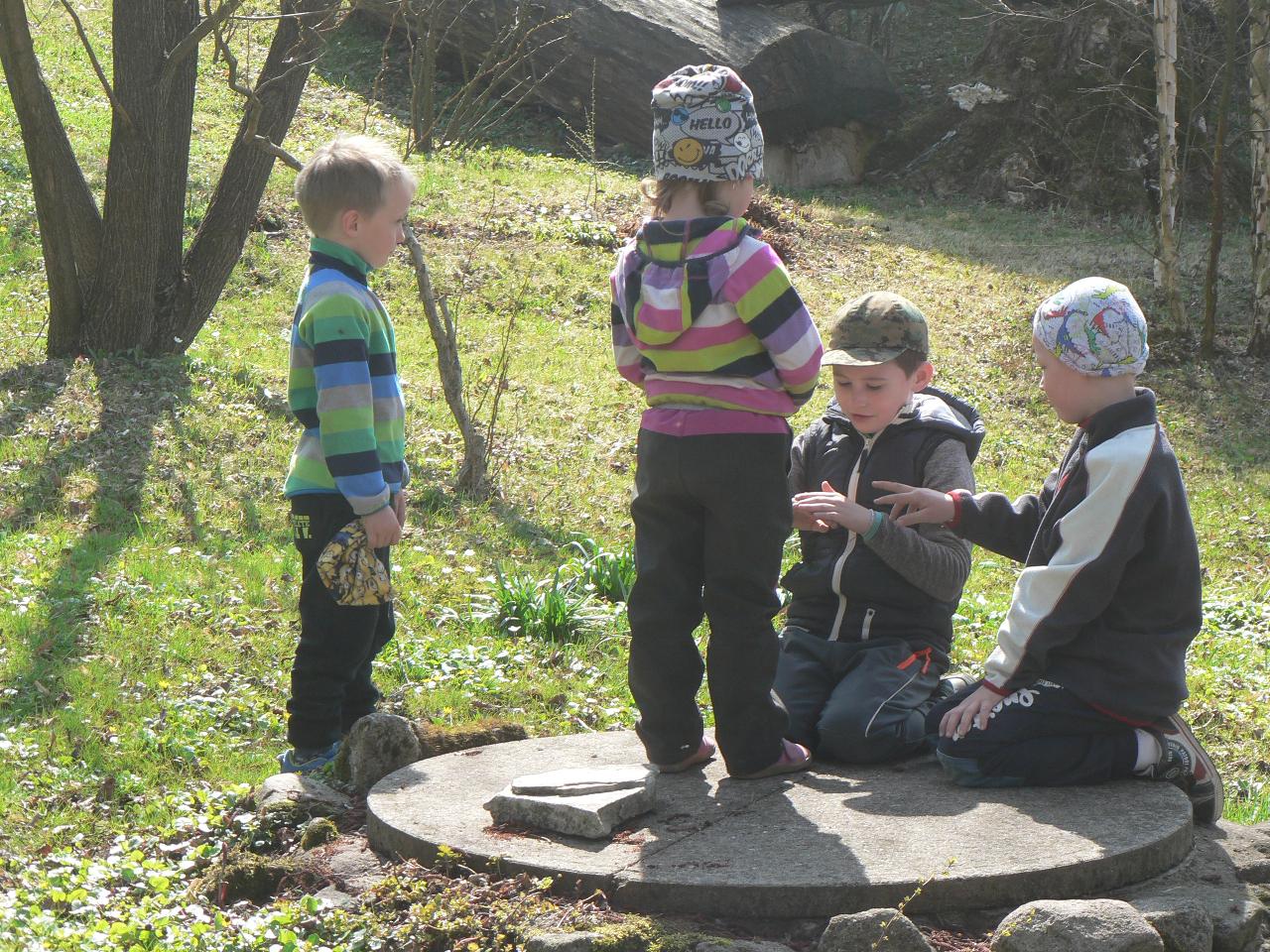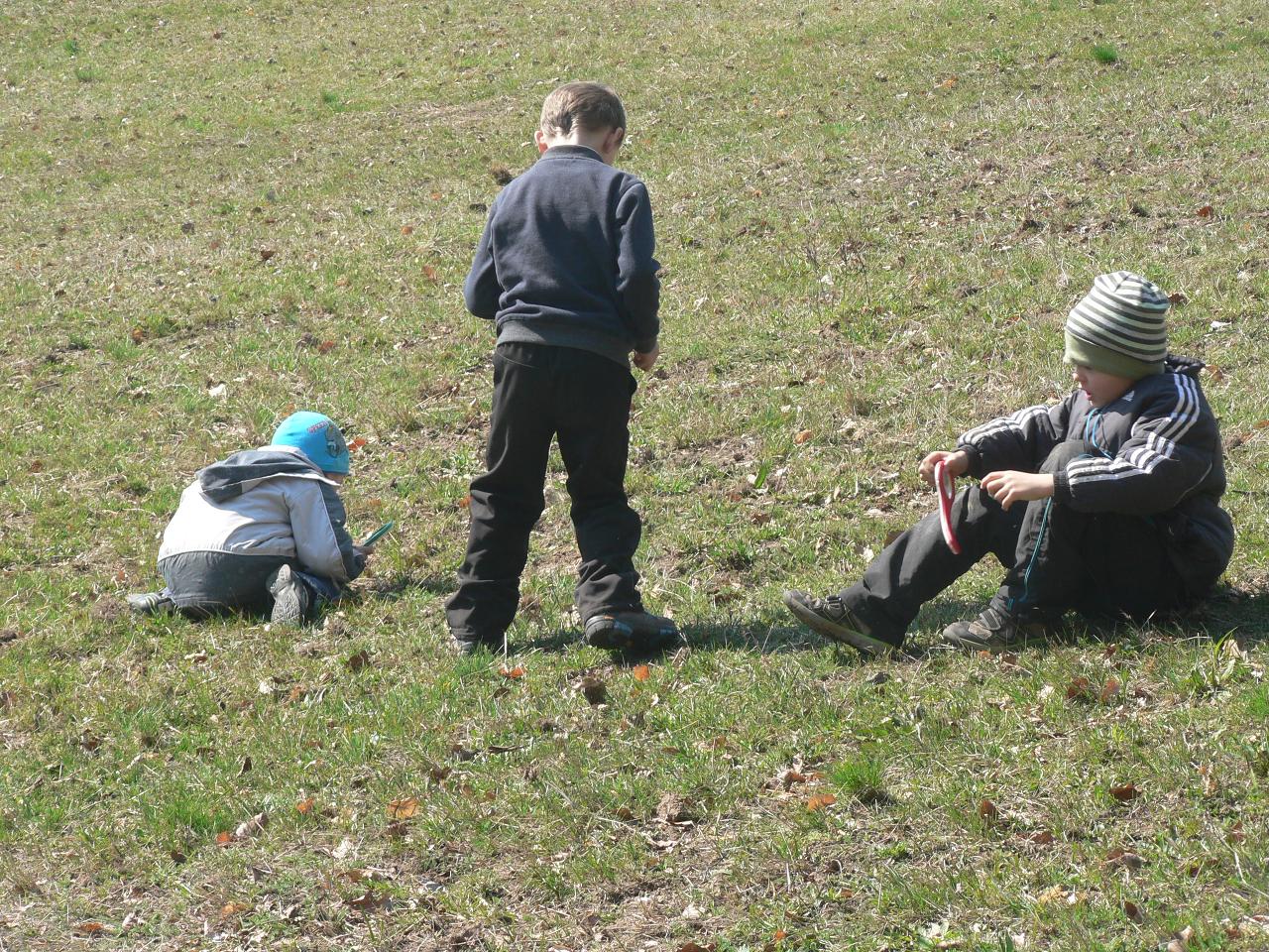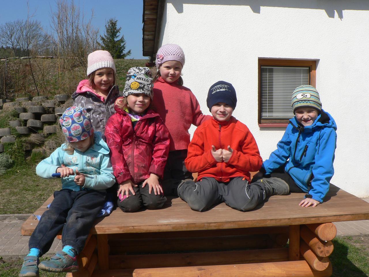 Týden plný krásného slunečného počasí a bláznivého větru. Vyprávěli jsme si aprílovou pohádku Jak se sluníčku zdál veselý sen, ve které sluníčko vrací světu ztracený smysl pro humor. Vesele tvoří, maluje, hraje si a směje se tak, až mu od smíchu ryskají slzy. Také naše tvoření proto bylo velmi pestré a barevné. Stříhali jsme a lepili sluníčka, seli jarní osení, za pomoci vodovek a štětců vymalovali opravdu spoustu barevných motýlů a šili jsme i pytlíčky na kuličky. Stejně jako děti v pohádce, i my jsme pak venku vyráběli důlky a cvrnkali kuličky. A protože bylo celý týden krásné slunečné počasí, měli jsme celou řadu příležitostí pozorovat probouzející se přírodu. Poznávali jsme nově vykukující květiny, v trávě se honili za brouky a pavouky a na procházce jsme potkali prvního slepýše. Skákali jsme přes potok, lezli po stromech, skákali panáka, na písku stavěli, tvořili i vařili. Také jsme se naučili nové říkačky, zpívali jsme, hráli hry, při kterých jsme trénovali rychlost, postřeh i spolupráci a zkoušeli jsme si naslouchat a dobře si porozumět. A protože to byl i týden prvních zápisů do školy, prožívali jsme s našimi předškoláky jejich první setkání se školou a sdíleli s nimi jejich velké zážitky.