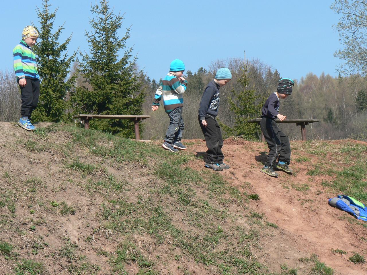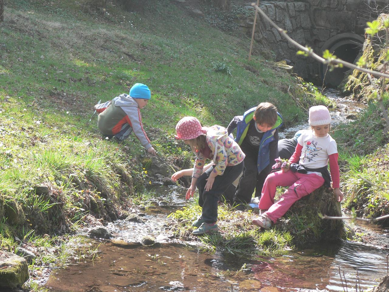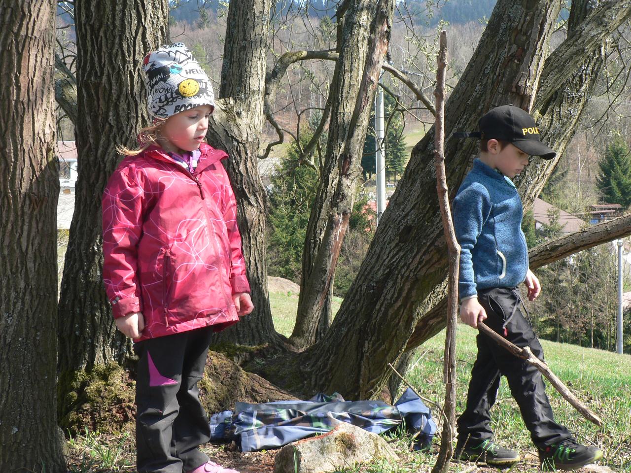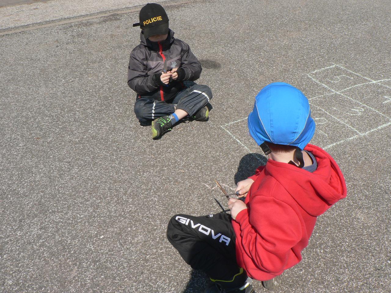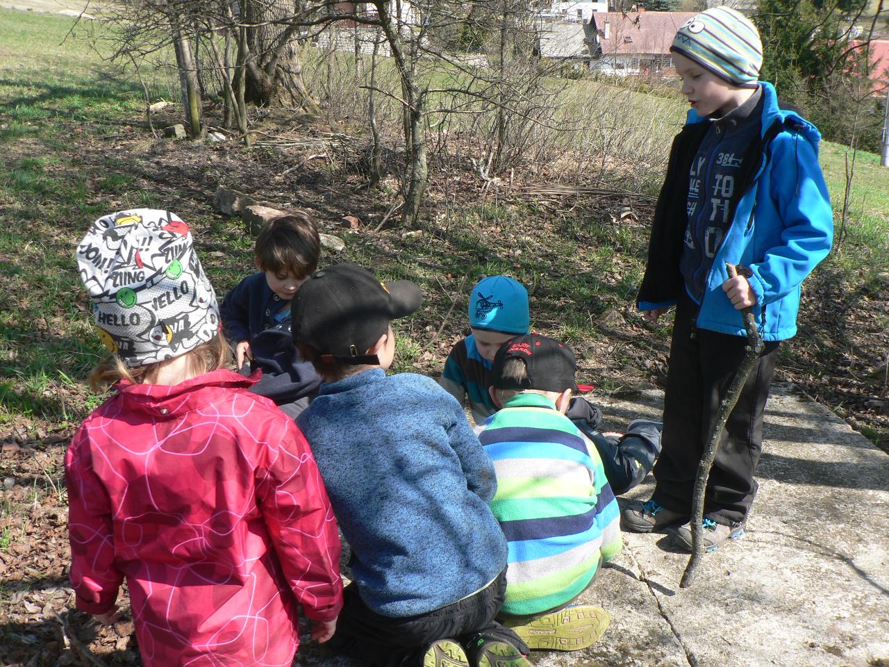 Týden plný krásného slunečného počasí a bláznivého větru. Vyprávěli jsme si aprílovou pohádku Jak se sluníčku zdál veselý sen, ve které sluníčko vrací světu ztracený smysl pro humor. Vesele tvoří, maluje, hraje si a směje se tak, až mu od smíchu ryskají slzy. Také naše tvoření proto bylo velmi pestré a barevné. Stříhali jsme a lepili sluníčka, seli jarní osení, za pomoci vodovek a štětců vymalovali opravdu spoustu barevných motýlů a šili jsme i pytlíčky na kuličky. Stejně jako děti v pohádce, i my jsme pak venku vyráběli důlky a cvrnkali kuličky. A protože bylo celý týden krásné slunečné počasí, měli jsme celou řadu příležitostí pozorovat probouzející se přírodu. Poznávali jsme nově vykukující květiny, v trávě se honili za brouky a pavouky a na procházce jsme potkali prvního slepýše. Skákali jsme přes potok, lezli po stromech, skákali panáka, na písku stavěli, tvořili i vařili. Také jsme se naučili nové říkačky, zpívali jsme, hráli hry, při kterých jsme trénovali rychlost, postřeh i spolupráci a zkoušeli jsme si naslouchat a dobře si porozumět. A protože to byl i týden prvních zápisů do školy, prožívali jsme s našimi předškoláky jejich první setkání se školou a sdíleli s nimi jejich velké zážitky.