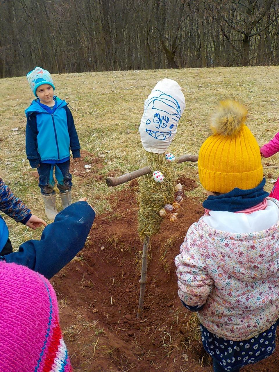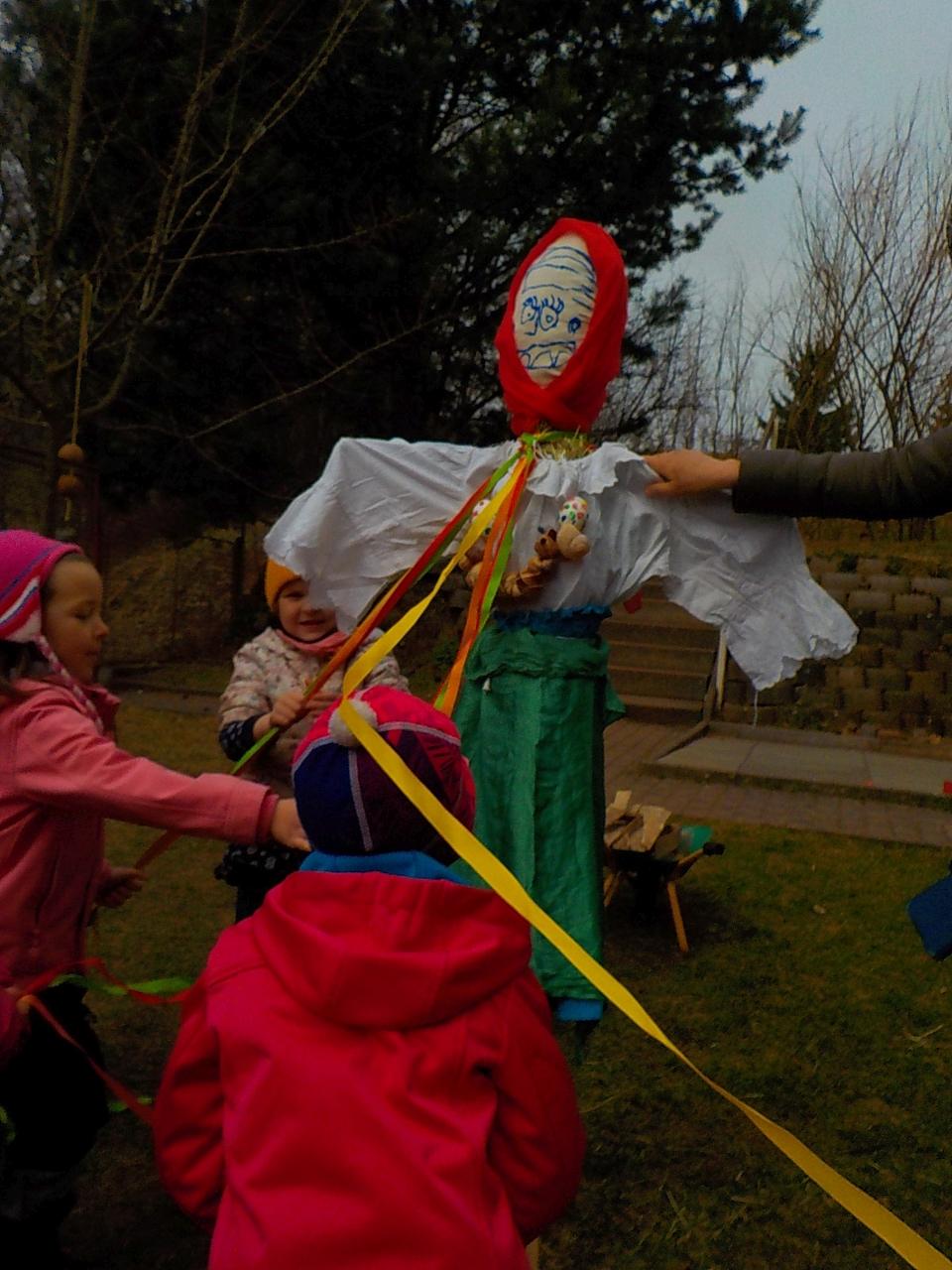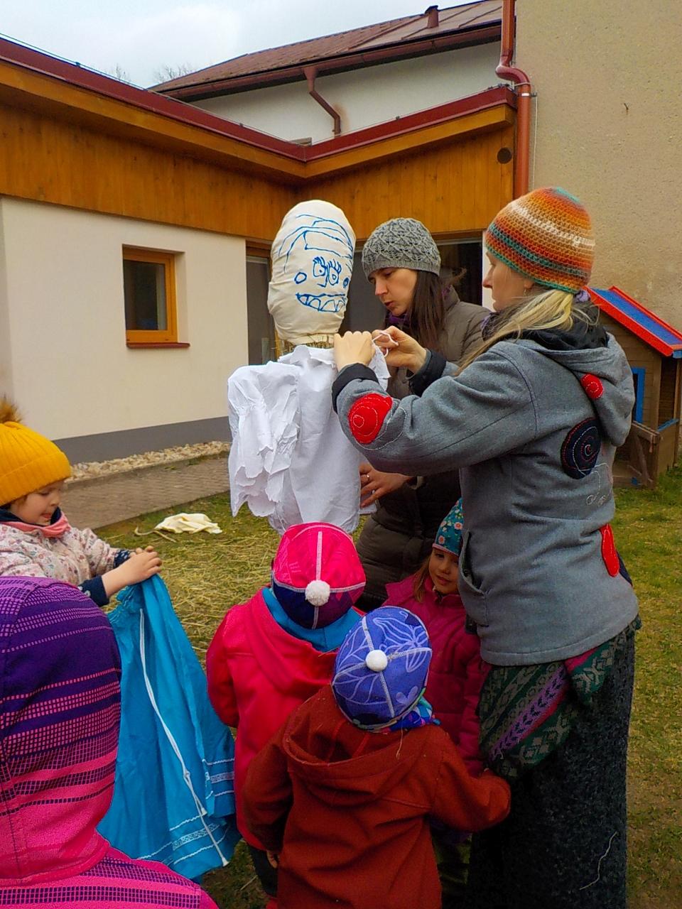 Velké příprava, velké prožitky, velká akce, doufáme, že i povedené následky - takový byl náš týden. O ničem jiném se nemluvilo, jen o té Moraně, Zimnici, která tu ještě straší, zebe, chladí, fouká i sněží. Té se teď chceme zbavit. Pěkně jsme si ji vyrobili, vystrojili, na pěkná slůvka ji nalákali, zazpívali, zatančili i zahráli - a pak jsme s ní skoncovali. Všechny čtyři živly nám s ní pomohly. Ohněm jsme ji podpálili, větřík nám pomáhal při hoření, do země jsme ji zakopali a nakonec jemné kapky deště z nebe ji pokropily. Takové to bylo. A ke všemu jsme ji ke svačině snědli. Každý si pak mohl vyrobit ještě svoji maličkou Moranu a tu si odnést domů. Tak doufáme, že je pro letošek s ní amen.