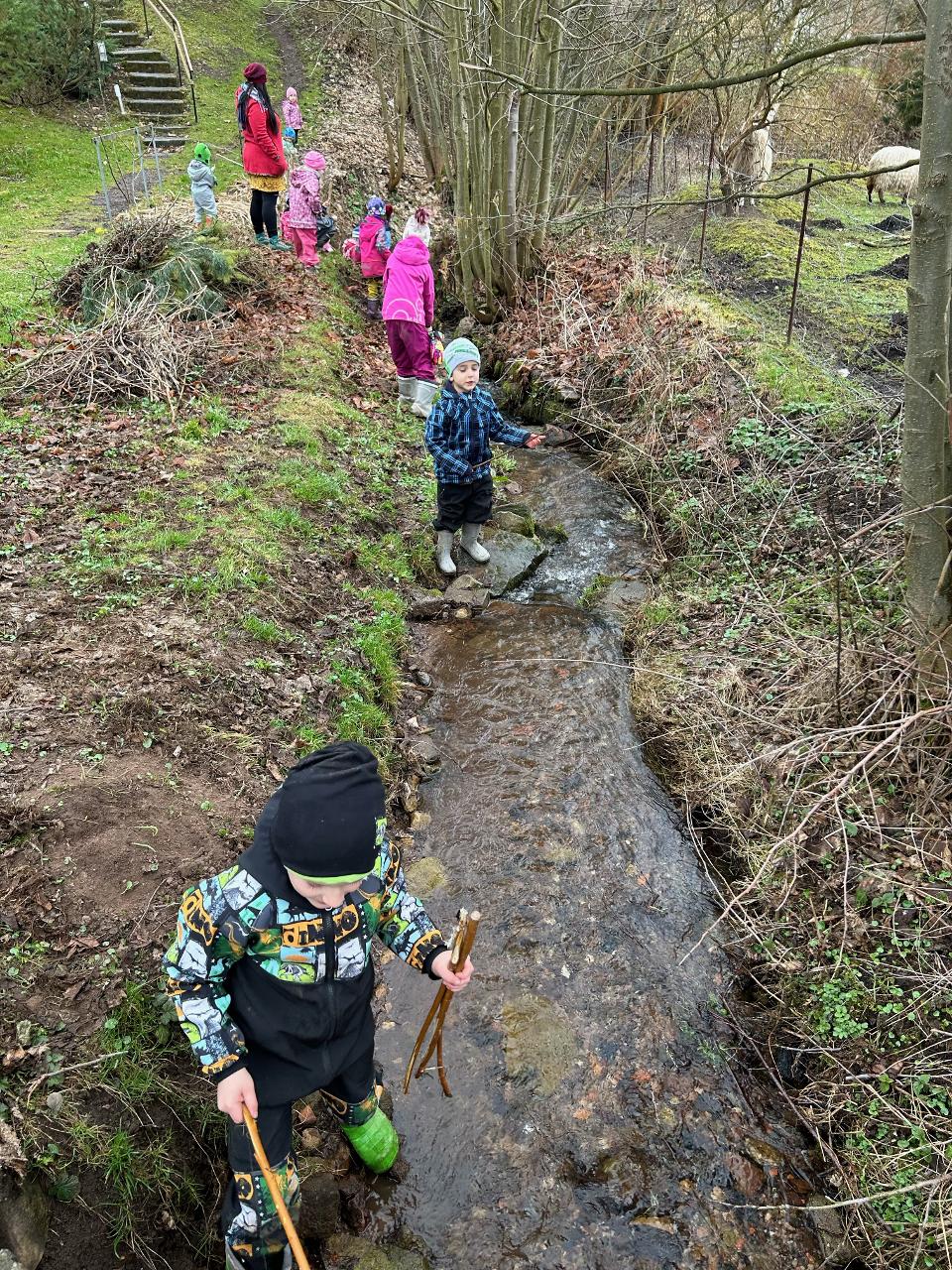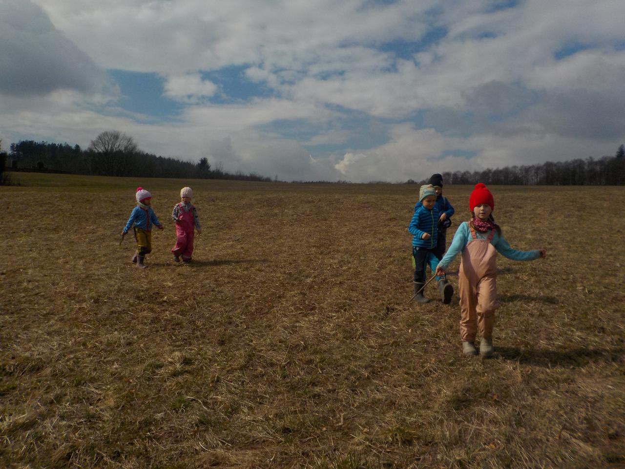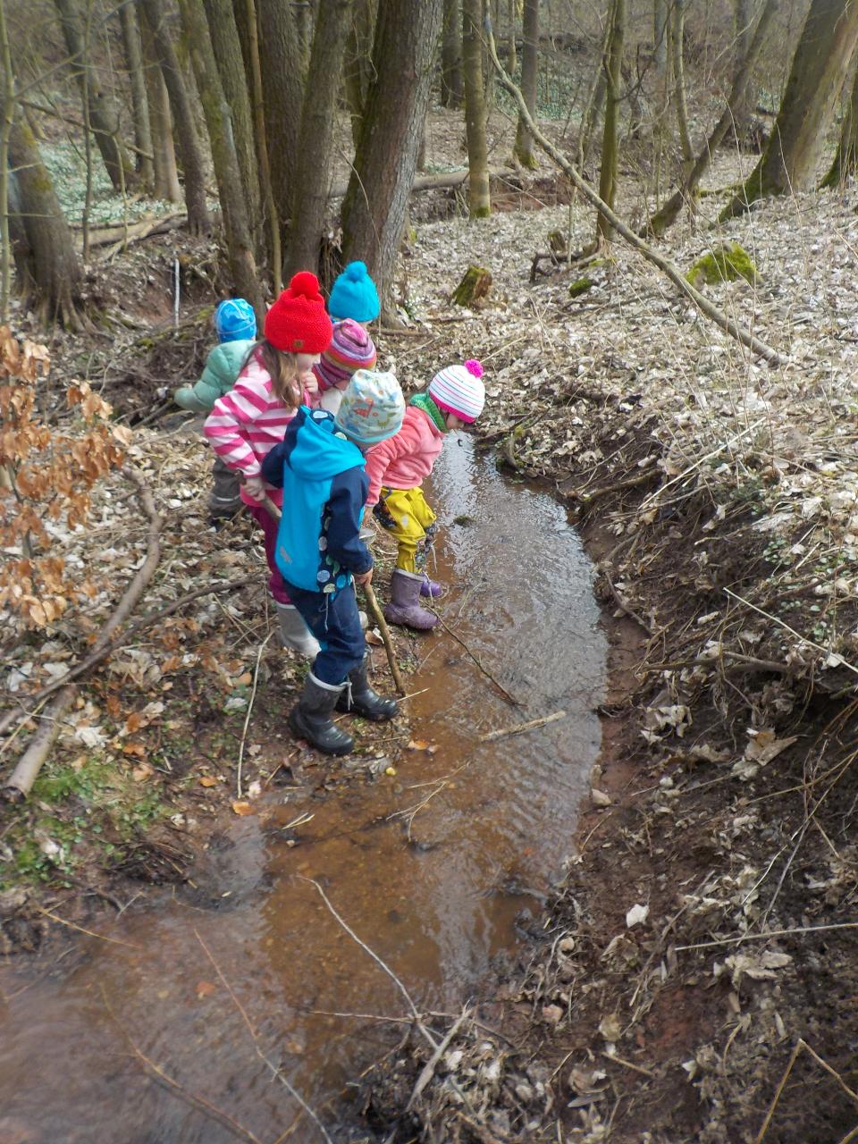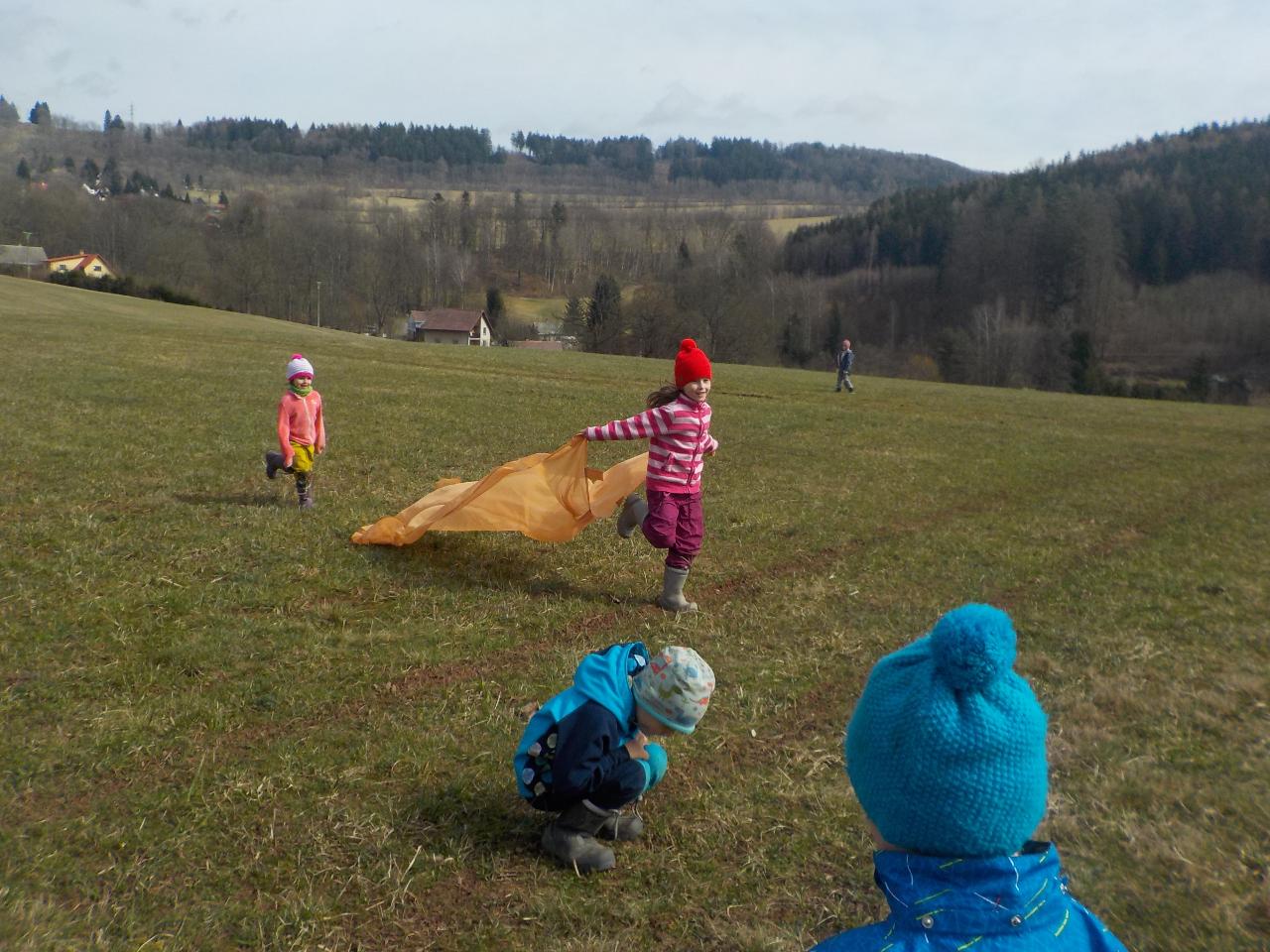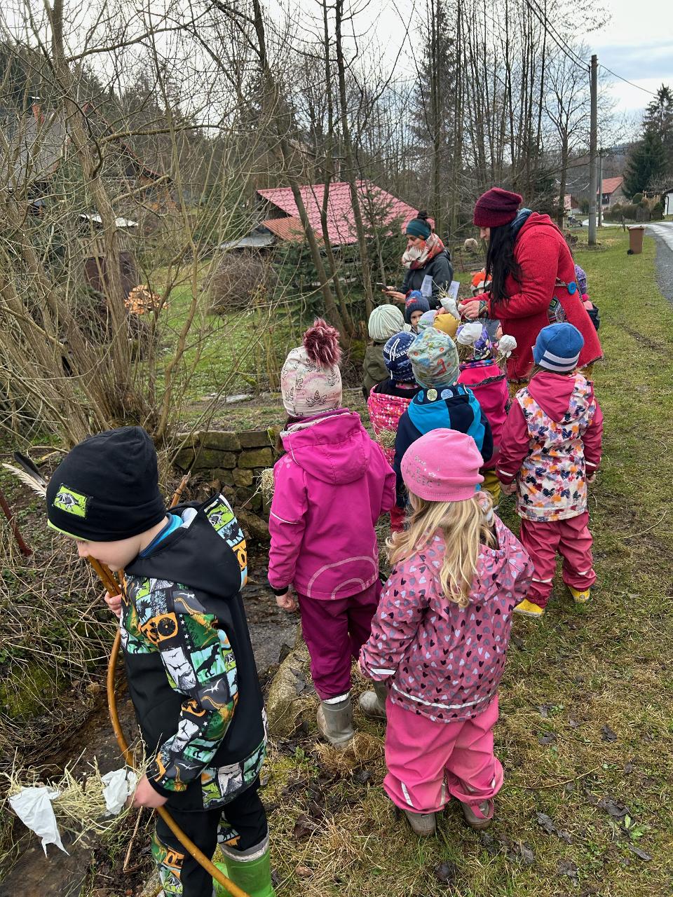 Pár vzpomínek jsme tento týden věnovali ještě neděli liščí, dopékali jsme preclíky, zkoušeli je kreslit, zahráli si pohádku z minulého týdne o zvířátkách, jak vyzrála na lišce. Ale hlavní téma bylo loučení se se zimou. Každý z dětí si vyrobil malou Moranku, naučili jsme se písničky, které nám pomohli při loučení a vhození Moranek do potoka. Počasí nám ukázalo, že jaro je už opravdu tady - poprvé jsme vyběhli ven jen v mikinkách a radostně procházeli "jarní branou", nedílnou součástí krásných dní byla i návštěva potůčku.