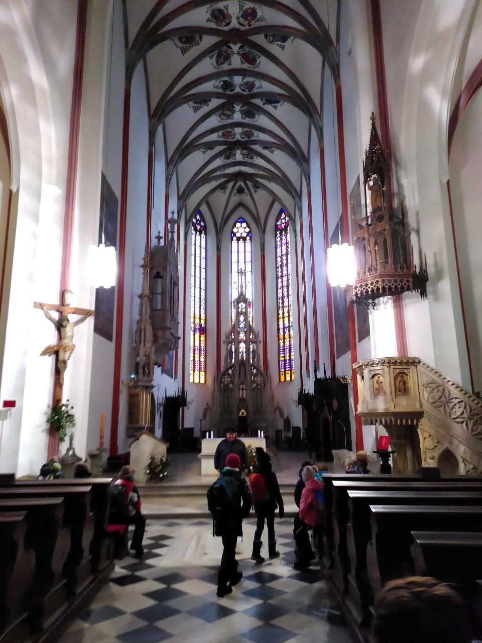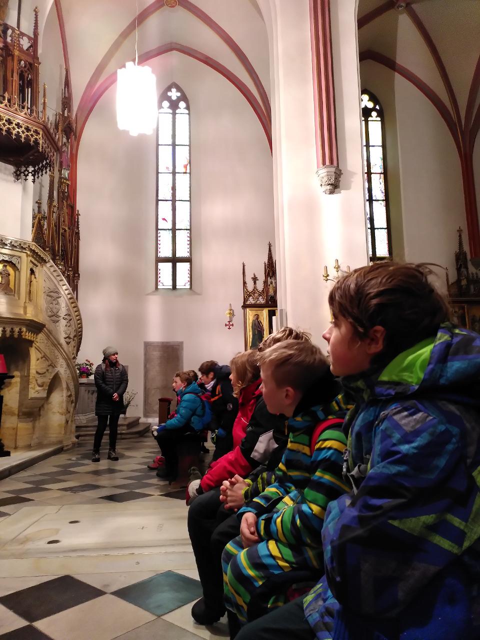 Středověké putování pokračuje. Vyrážíme do Reginogradeciua, nebo-li Hradce Králové. První zastávkou je Bílá věž (72m), kde se nachází třetí největší zvon v České republice se jménem Augustin. V útrobách věže je původní hodinový stroj, unikátní skleněný model věže, která se začala stavět v roce 1574. O několik málo desítek metrů nás čekala další neméně zajímavá stavba a to gotický cihlový katedrální kostel Svatého Ducha, založen roku 1307 královnou Eliškou Rejčkou, manželkou Václava II., avšak za dokončení vděčí Hradec Králové jiné ženě a to Alžbětě Pomořanské, poslední manželce Karla IV. Školáci se dozvěděli mnoho zajímavého od paní kostelnice, se kterou byla i velká legrace. Poslední zastávkou bylo Muzeum východních Čech a program Cesty města. Expozice nás provedla středověkým Hradcem Králové, řemesly spolu s multimediálními interaktivními prvky, kde si školáci mohli vyzkoušet staré písmo, stavbu gotických prvků atd. Ve škole jsme pokračovali ve výrobě vlastních středověkých staveb a protože se také blíží pololetí, tématem také bylo sebehodnocení toho, jak se dařilo, co jsme se naučili a na co je potřeba se ještě zaměřit.