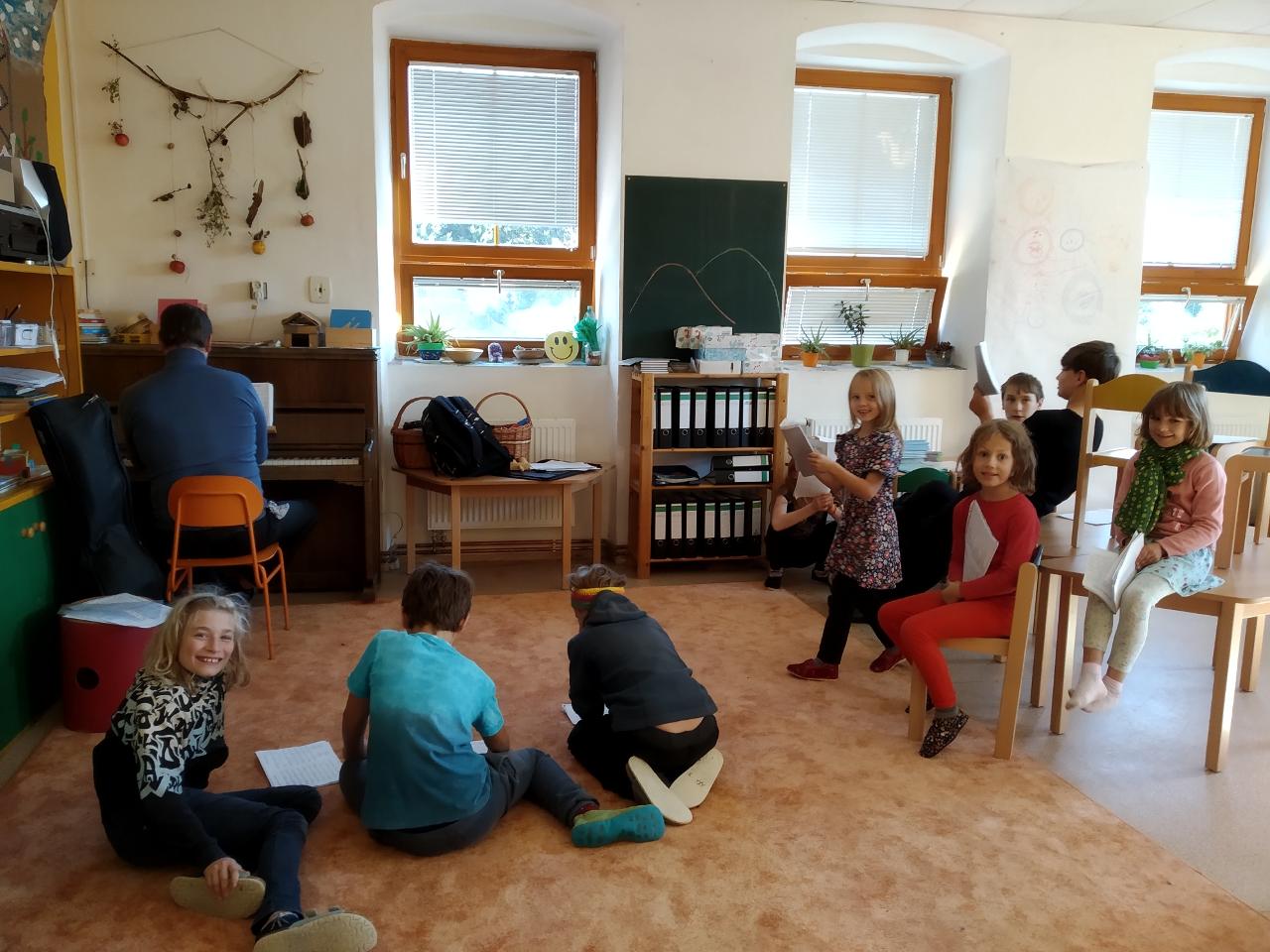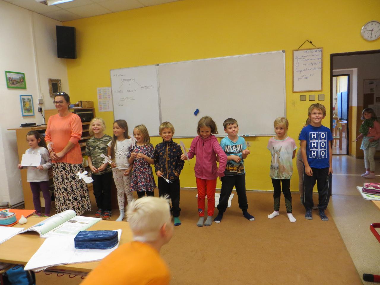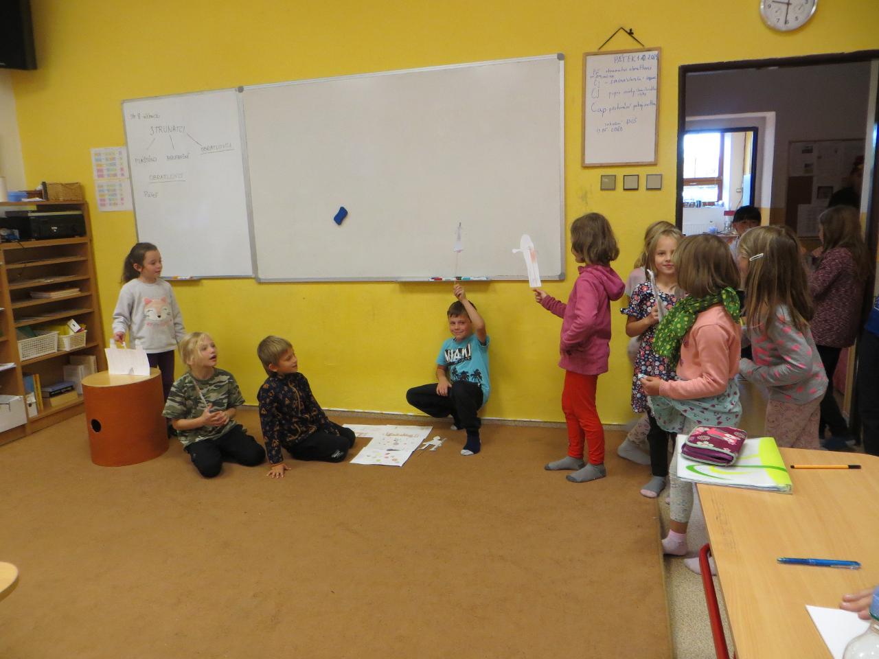 Bylo příjemné čtvrteční ráno a my se s nejmladšími školáky vydali po stopách Svatého Václava. Celou cestou nás doprovázel jeho příběh. Školáci si vytvořili skupinky, ve kterých postupně zakreslovali do mapy celou cestu a také kousek příběhu, který jsme si cestou četli. Úkol to nebyl nejsnadnější, ale po dohodě se vždy našel ten správný směr. Cestou jsme potkali vysoký posed, na který všichni postupně vylezli. Už tak velké dobrodružství Lenka posílila tím, že s posedem začala kývat. Během obědové pauzy poblíž kolejí ve Velkých Svatoňovicích jsme měli štěstí, několikrát viděný vlak rozzářil oči všem. Každý z dětí donesl něco z podzimních darů, takže jsme měli hostinu radost pohledět. Velkou diskuzi rozvířila také jedna stará bota - odkud sem asi přišla a kam kráčí? My jsme se nakonec vydali sadem ke kapličce, kde jsme potkali zamotanou kozu. Bylo jasné, že hned proběhne záchranná akce. Koza Stelle za to nesnědla mapu, kterou u ní zapomněla. Nedaleko byla ohrada pro kozičky, která mírně probíjela. Školáky to velmi přitahovalo a Míša se u ní dokonce dobil dosytosti, což byl největší zážitek z celého dne. U kapličky ve Velkých Svatoňovicích jsme si napsali výletníčky a příjemný slunečný den jsme ukončili hrou Opičí král. MravBus nás odvezl do školy, kde jsme spokojeni šli na hřiště, protože fotbal…. to je hra. Díky za bezvadné chvíle venkovního dne :-)
