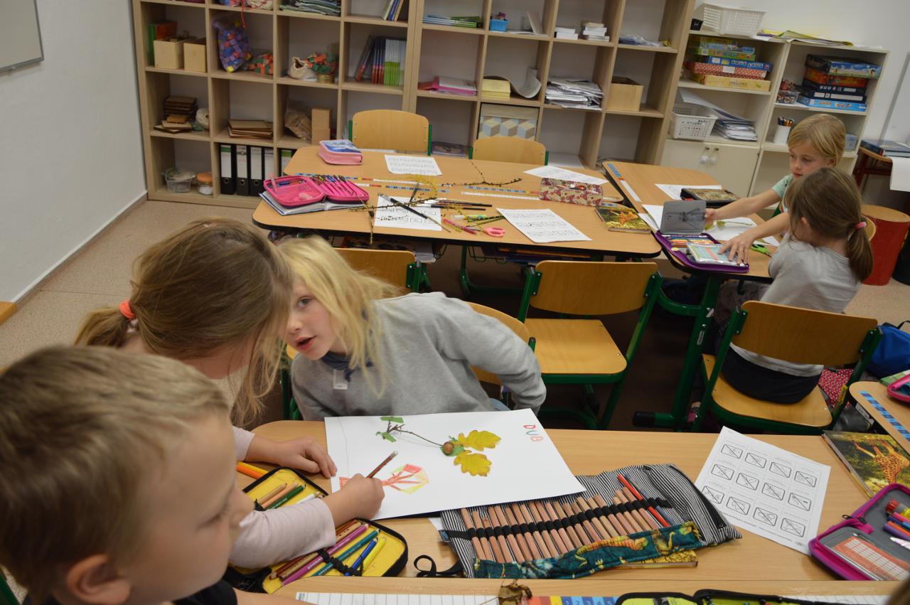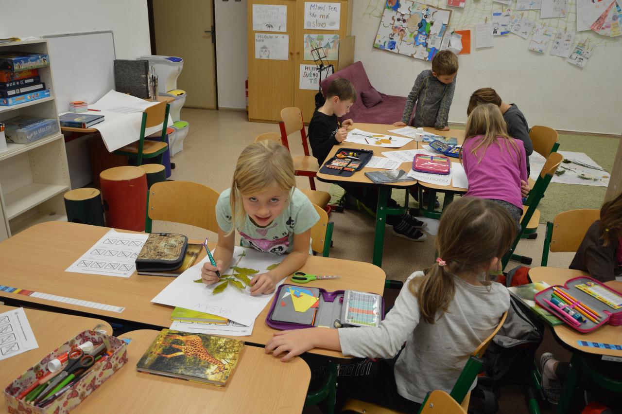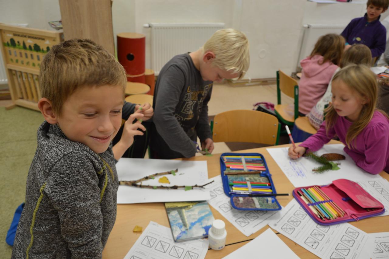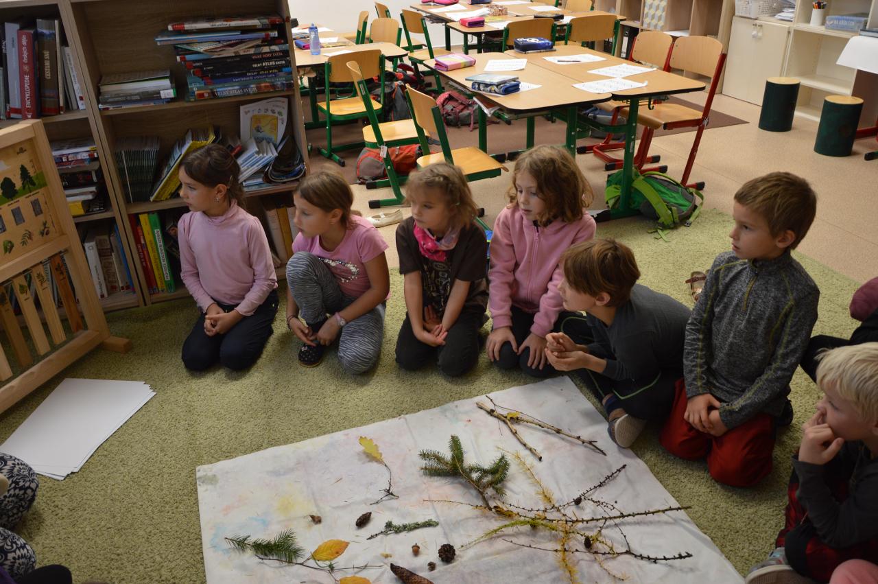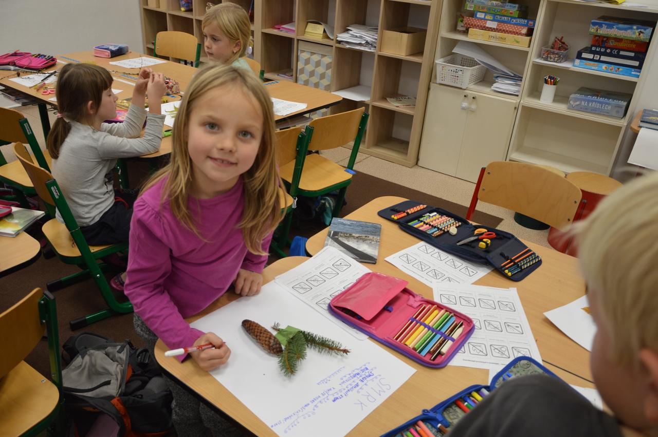 Tento týden se k nám už postupně vplížil chladný podzim. Přesto jsme se vydali během čtvrtečního venkovního dne za poznáním života v lese. Kromě zimy nás ani déšť neušetřil, a tak jsme nakonec vodu vylévali i z holínek. Ale zato jsme zjistili spousty zajímavých informacích o lese, především o stromech. Vydali jsme se kolem Tichošlápka a Hadího kopečku až k Německým lukám. Cestou jsme sbírali a určovali větve, listy a plody stromů. I když pršelo, přepadla nás žízeň. A měli jsme velké štěstí, protože jsme potkali jeden dub, ze kterého tekla malým proudem voda. Každý z nás ochutnal alespoň pár kapiček - to byla ale dobrůtka :-) Cestou z kopce dolů jsme zjistili, že mokrá tráva bezvadně klouže. A už se jezdilo jako po sněhu. Nejlépe to frčelo Páťovi. Po celou cestu nám pršelo, ale nám to vůbec nevadilo a užili jsme si to jak jen to šlo. Ve škole jsme po obědě měli také možnost se podívat, jak pracuje ladič klavírů, který nám přijel naladit školní pianina. Společně s ním jsme hledali odpovědi na to, co musí takový ladič klavírů umět. Poté jsme se rozdělili do skupin. Každá skupina si vzala na starosti jeden strom a na velkou čtvrtku jsme nalepili větev, listy a plod daného stromu. Měli jsme z toho radost takovou, že jsme se rozhodli vytvořit z naší práce také příspěvek do našeho školního Mravenčího časopisu. Nakonec jsme se rozloučili písničkovým ping pongem na téma LES. Díky za krásné chvíle.
