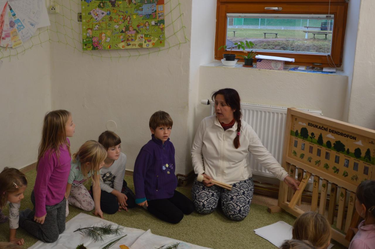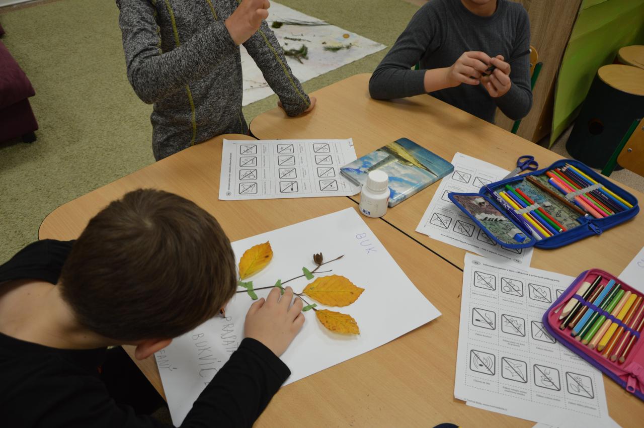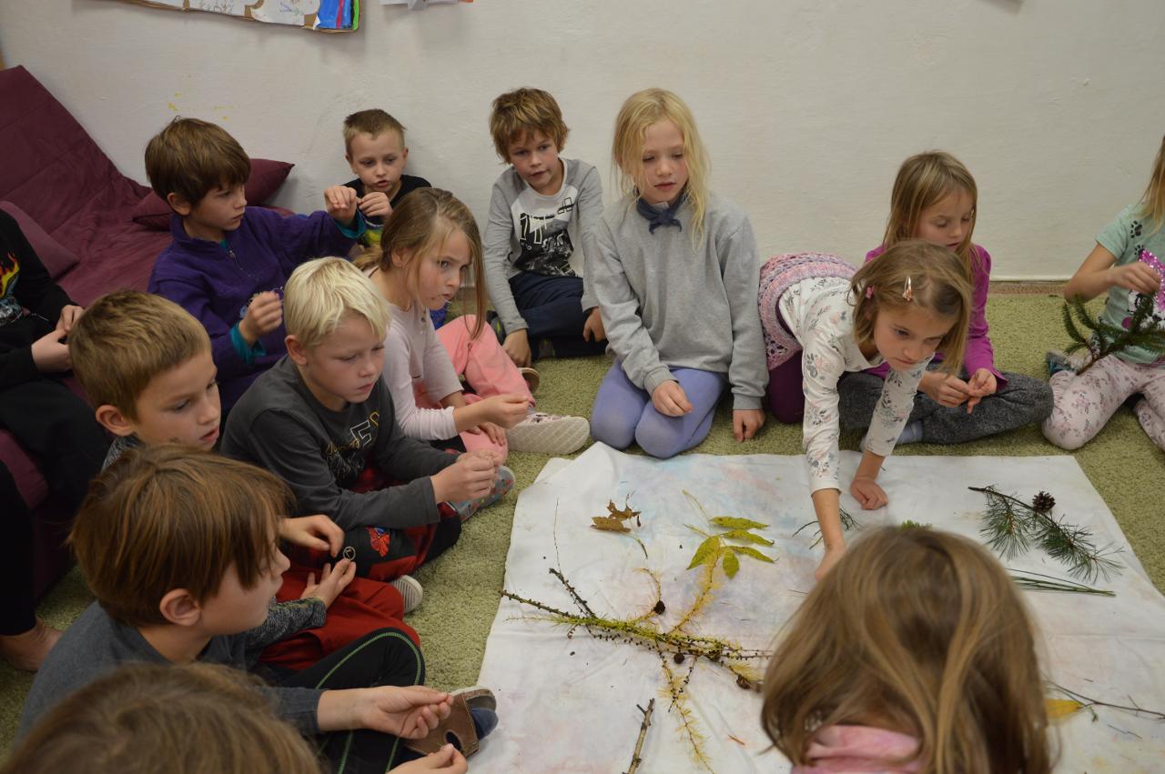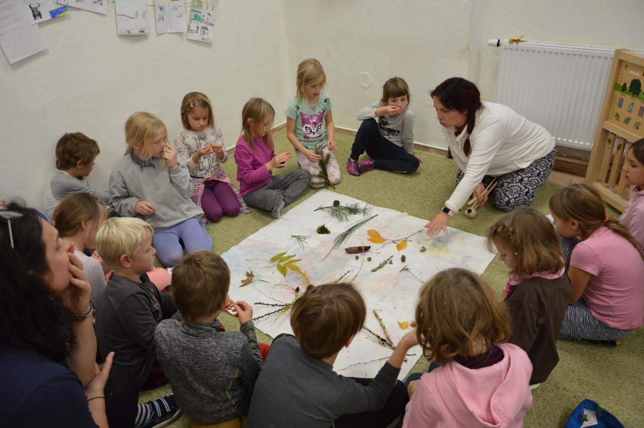 Tento týden se k nám už postupně vplížil chladný podzim. Přesto jsme se vydali během čtvrtečního venkovního dne za poznáním života v lese. Kromě zimy nás ani déšť neušetřil, a tak jsme nakonec vodu vylévali i z holínek. Ale zato jsme zjistili spousty zajímavých informacích o lese, především o stromech. Vydali jsme se kolem Tichošlápka a Hadího kopečku až k Německým lukám. Cestou jsme sbírali a určovali větve, listy a plody stromů. I když pršelo, přepadla nás žízeň. A měli jsme velké štěstí, protože jsme potkali jeden dub, ze kterého tekla malým proudem voda. Každý z nás ochutnal alespoň pár kapiček - to byla ale dobrůtka :-) Cestou z kopce dolů jsme zjistili, že mokrá tráva bezvadně klouže. A už se jezdilo jako po sněhu. Nejlépe to frčelo Páťovi. Po celou cestu nám pršelo, ale nám to vůbec nevadilo a užili jsme si to jak jen to šlo. Ve škole jsme po obědě měli také možnost se podívat, jak pracuje ladič klavírů, který nám přijel naladit školní pianina. Společně s ním jsme hledali odpovědi na to, co musí takový ladič klavírů umět. Poté jsme se rozdělili do skupin. Každá skupina si vzala na starosti jeden strom a na velkou čtvrtku jsme nalepili větev, listy a plod daného stromu. Měli jsme z toho radost takovou, že jsme se rozhodli vytvořit z naší práce také příspěvek do našeho školního Mravenčího časopisu. Nakonec jsme se rozloučili písničkovým ping pongem na téma LES. Díky za krásné chvíle.