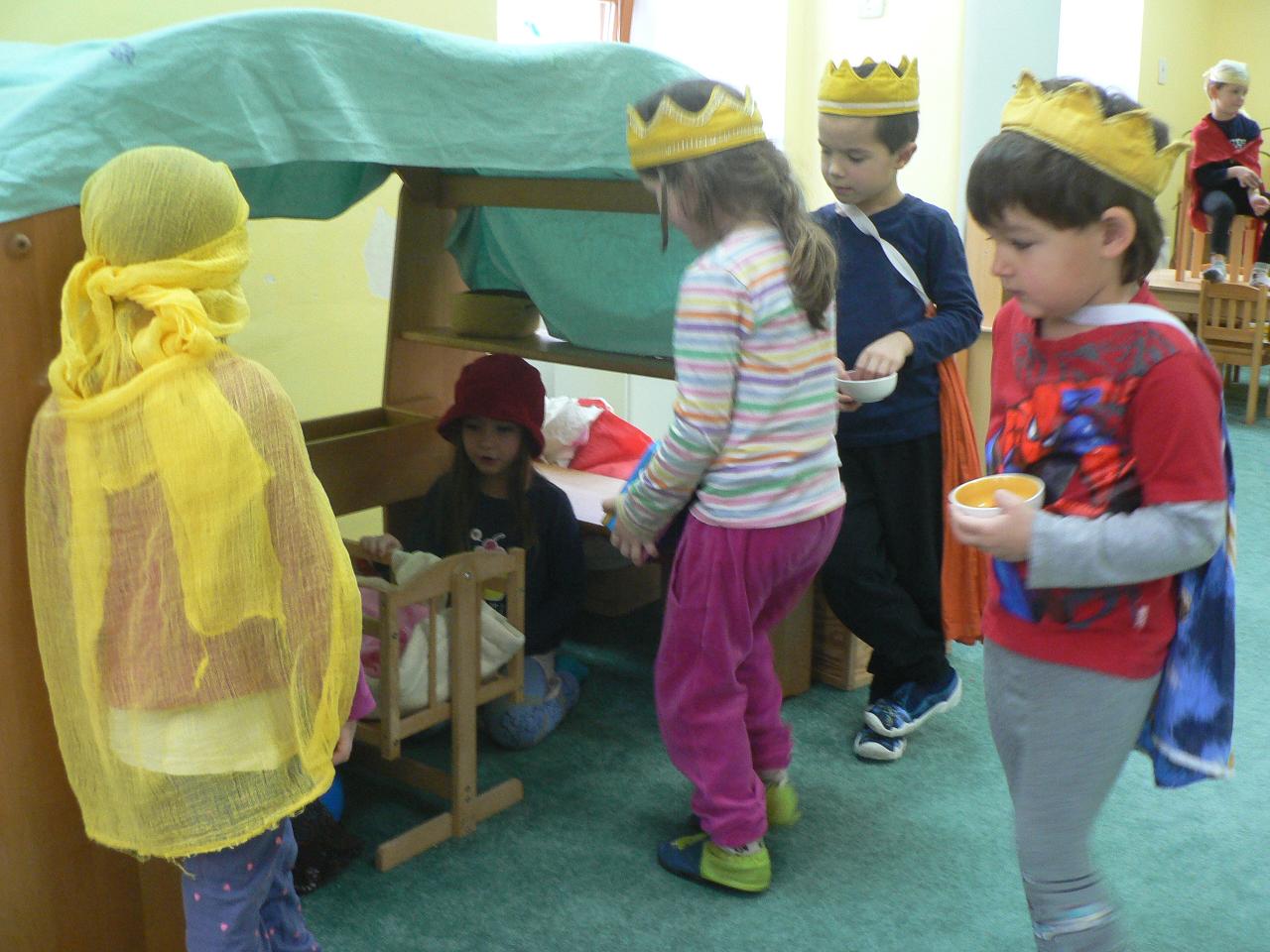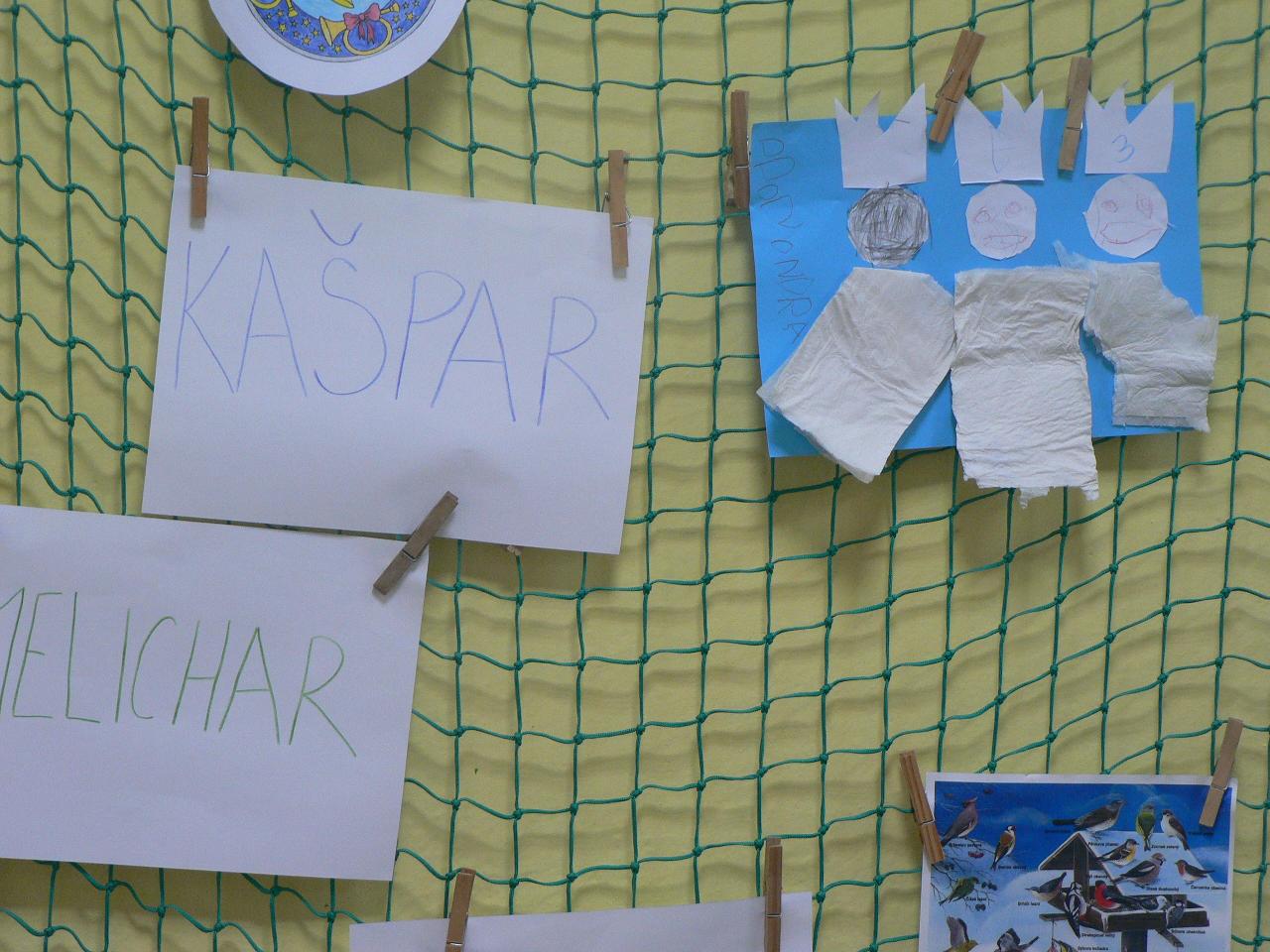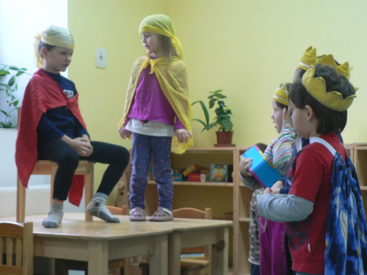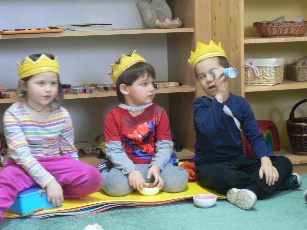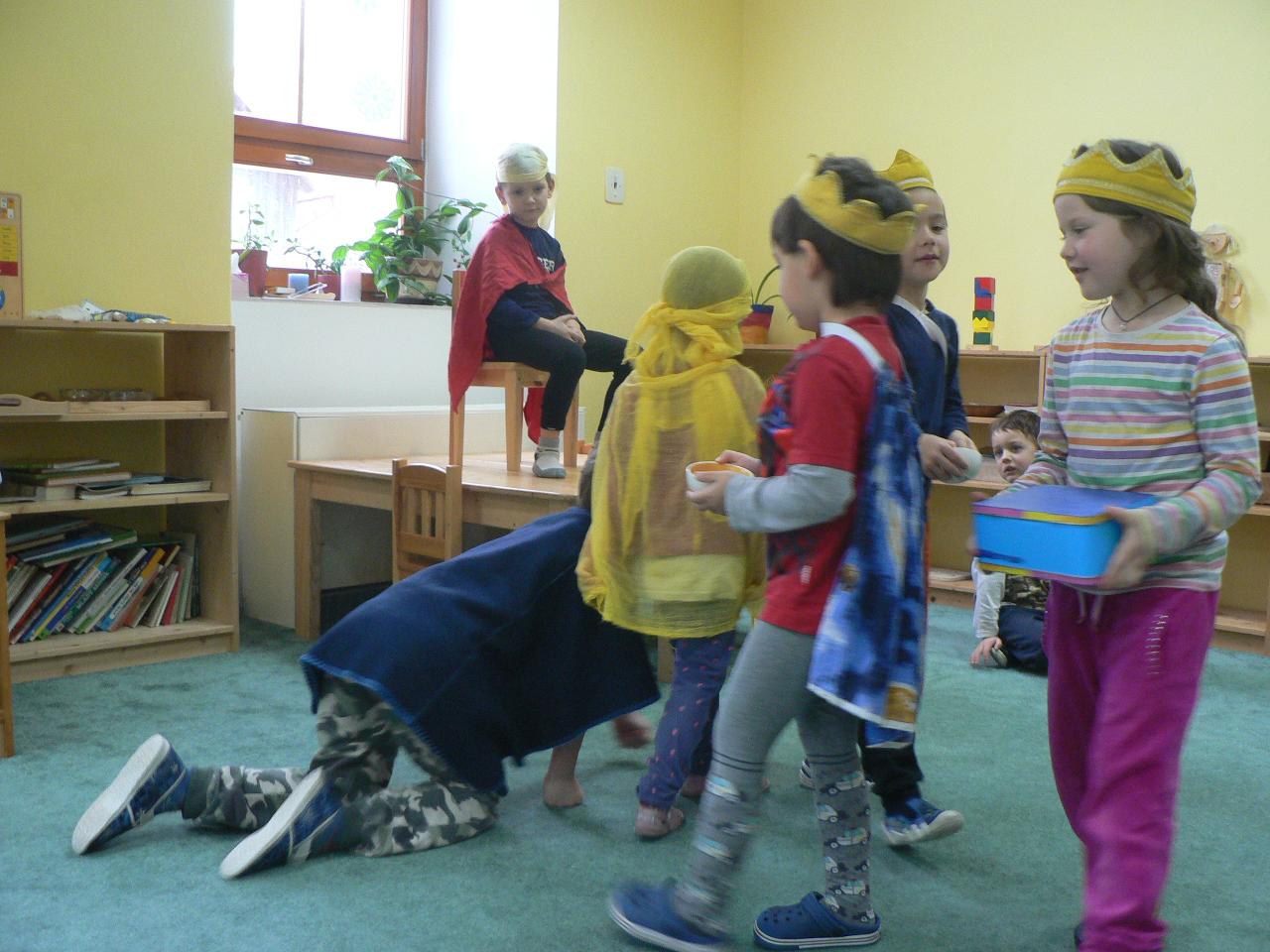 Vyprávíme si příběh O hvězdě a třech mudrcích. Příběh nás vede zpět do minulosti a společně s třemi mudrci se v představách vydáváme na putování za hvězdou. Připomínáme si, kam a proč putovali, jaká byla jejich cesta a jaké dary právě narozenému Ježíškovi nesli. Vyrábíme si tříkrálové koruny, malujeme a vystřihujeme velbloudy i svítící komety, tvoříme společně postavičky tří králů. Tento týden jsme také pekli speciální tříkrálový koláč, na jehož přípravě se všichni poctivě podíleli. Někdo strouhal mrkev a jablíčka, někdo válel těsto, další sekali oříšky nebo míchali náplň. Výsledkem byl opravdu vynikající koláč, který jsme pak společně spořádali ke svačině následující den. Ve čtvrtek nás pak čekalo tříkrálové divadýlko, do kterého se děti naplno ponořily a své role si opravdu užily, jak je ostatně vidět i na fotkách. A přitom všem nechyběly ani nové říkanky, zimní písničky a spousta zábavy na sněhu.
