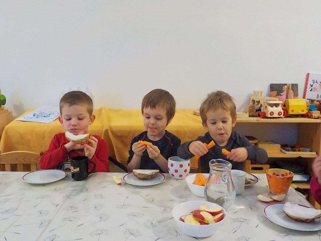 Tento týden jsme plní zážitků z Vánoc, však i v Mravenečkovi nám Ježíšek zanechal nějaké dárky. A jak to bylo s Ježíškem dál? Vyprávíme si o Třeh králích-mudrcích, kteří Ježíška navštívili a donesli mu svoje dary - zlato, kadidlo a myrhu. Hrajeme si o tom divadýlko, voníme ke kadidlu a jiným vůním, nasloucháme jak zpívá zlatá tibetská miska a pozorujeme, co se děje, je-li uvnitř voda. Pečeme třírálový koláč, vyrábíme si korunu, slavíme Kubíkovy narozeniny a konečně jsme se dočkali sněhu!