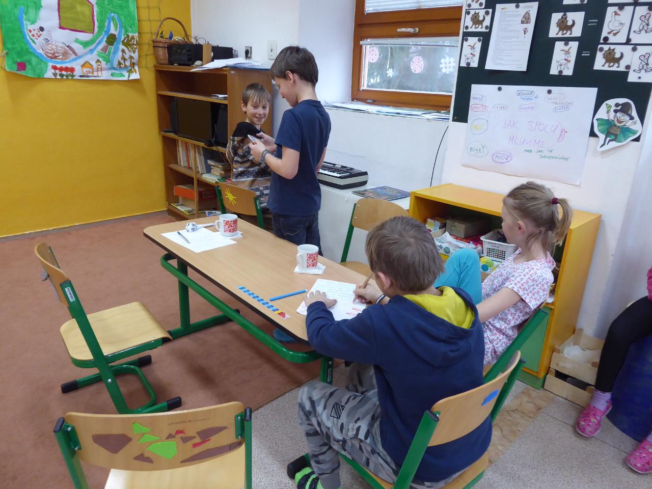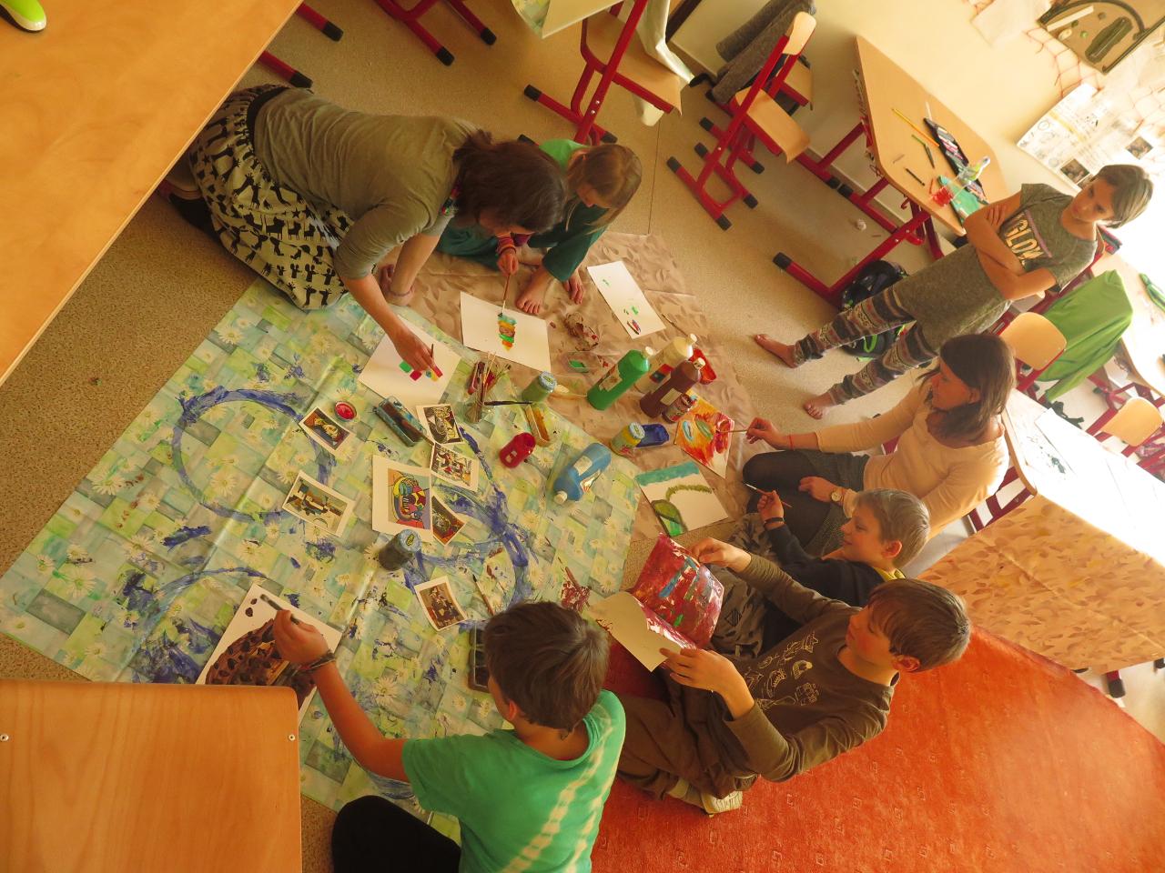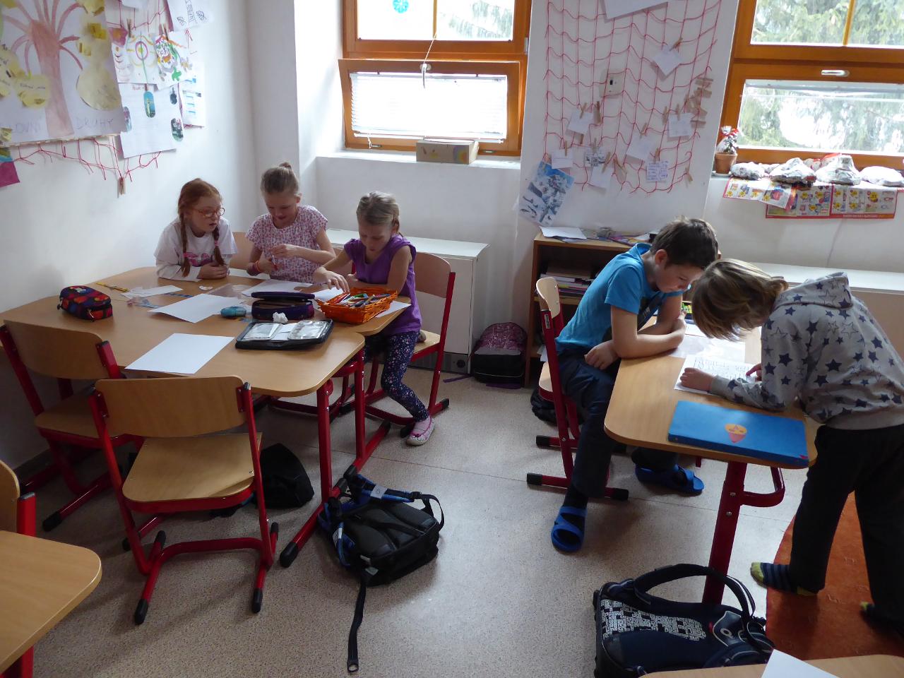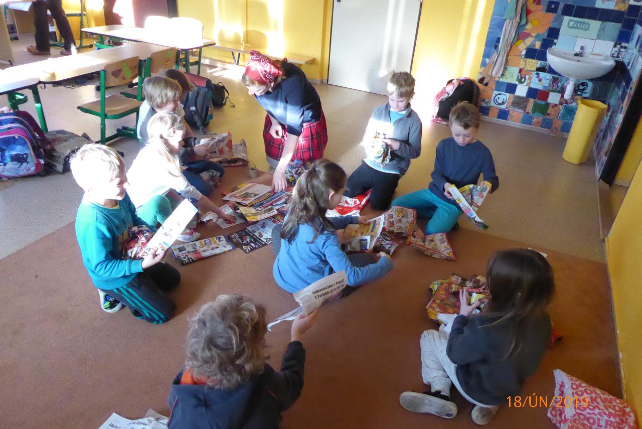 V druhé polovině února jsme se začali blížit k masopustnímu veselí. Školáci začali tvorbu masek technikou kašírování. Pracovali jsme s novinami a lepidlem, vytvořili jsme základní tvar masky, kterou jsme nechali na týden schnout. Navázali jsme také na předchozí týden medií tvorbou školního časopisu. Společně jsme vymýšleli název i obsah časopisu, který si tvoří školáci s pomocí dospěláků. Tvořili jsme rozmanité části časopisu, psali jsme články ze života mravenčího, kreslili jsme i vymýšleli hlavolamy. Při bruslícím úterku jsme také navštívili trutnovskou knihovnu a objevovali jsme, jak vypadají a co nabízí jiné časopisy. Školáci měli i chvilku na čtení toho, co jim padlo do oka - čas s klidem a radostí využili. Při angličtině si starší třída zahrála pohybové hry v tělocvičně a spojila tak komunikaci v cizím jazyce a fyzickou aktivitu. Ve čtvrtek jsme pak společně zažili druhé deskohraní, školáci i jejich rodiče naplnili družinu radostnou atmosférou plnou kartiček, vagónků, figurek, kostek a hráli rozmanité hry. Například při cestách vlaky po Evropě využívali k porozumění jazyky, které cestou potkali - kromě češtiny i francouzštinu, angličtinu a němčinu.