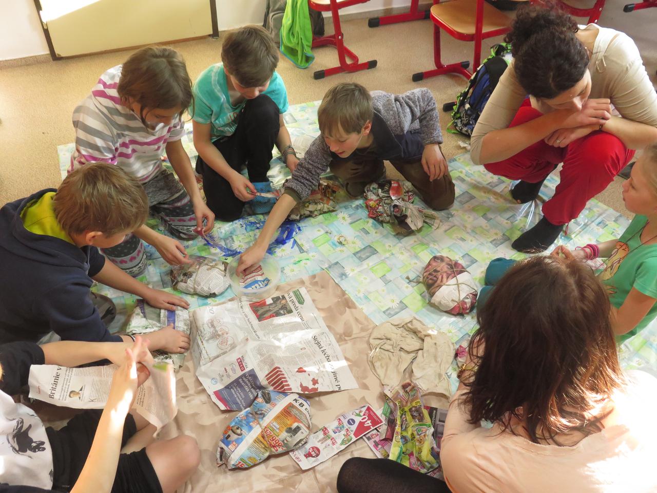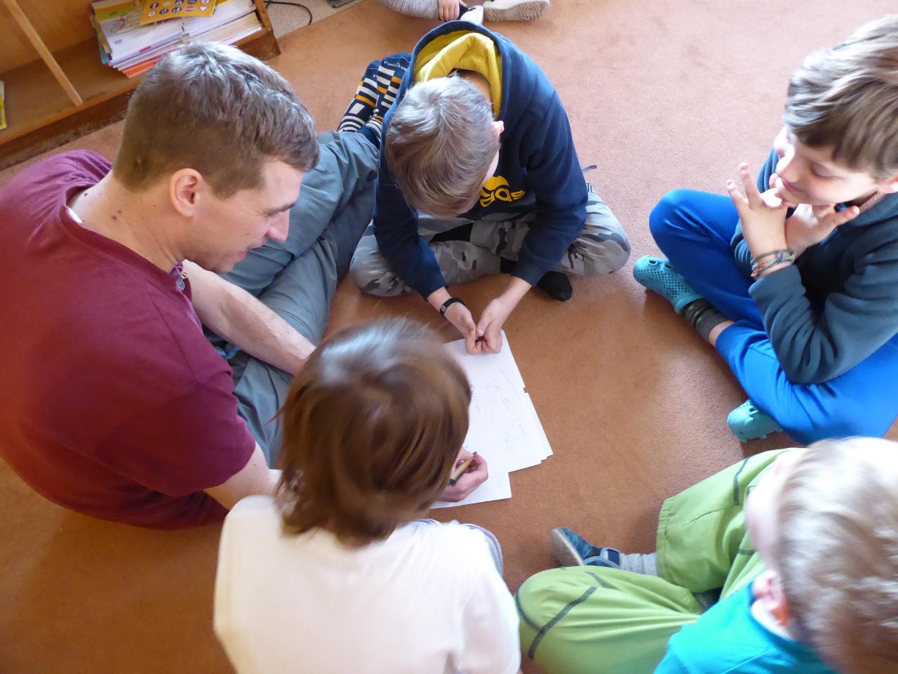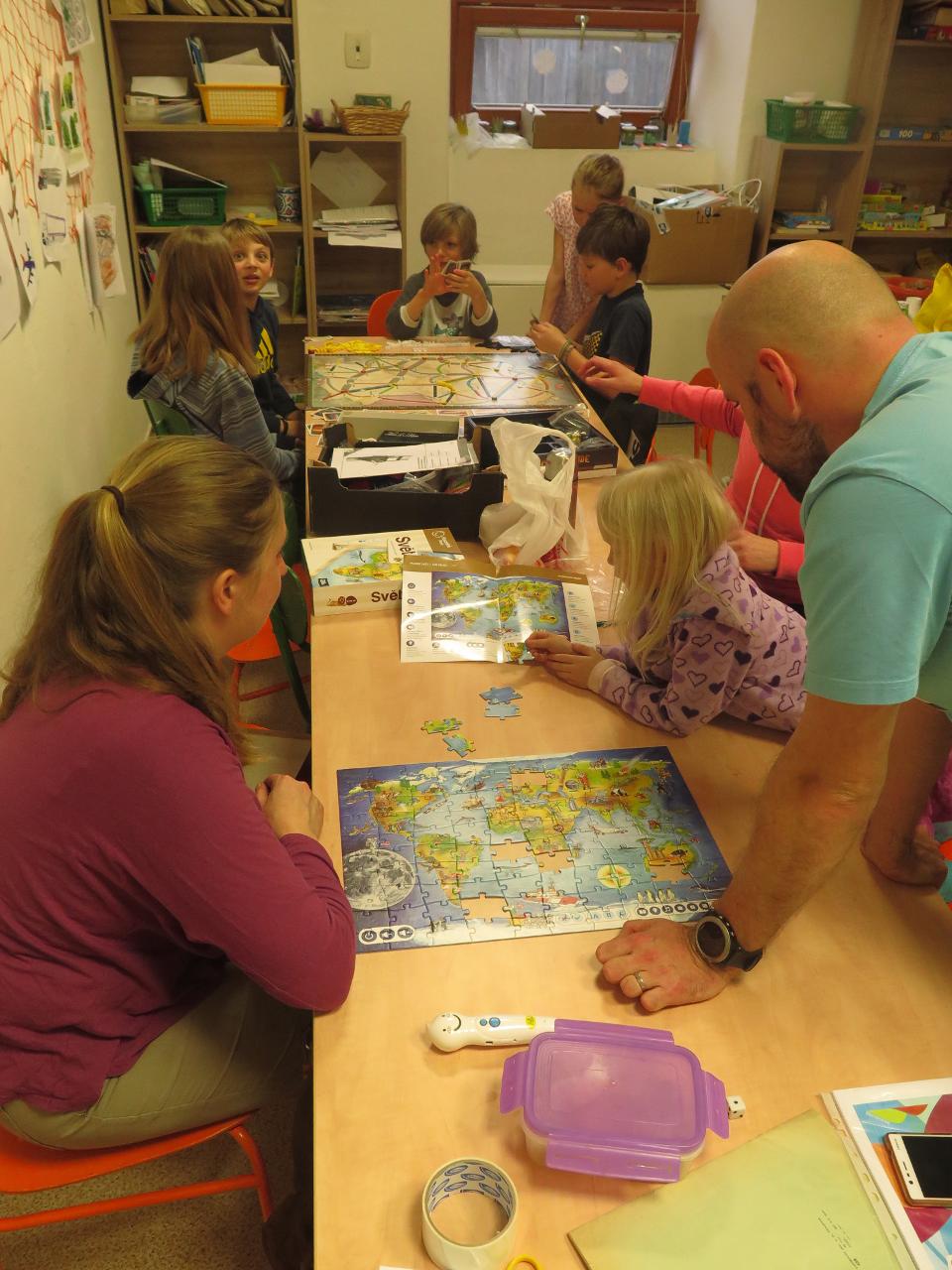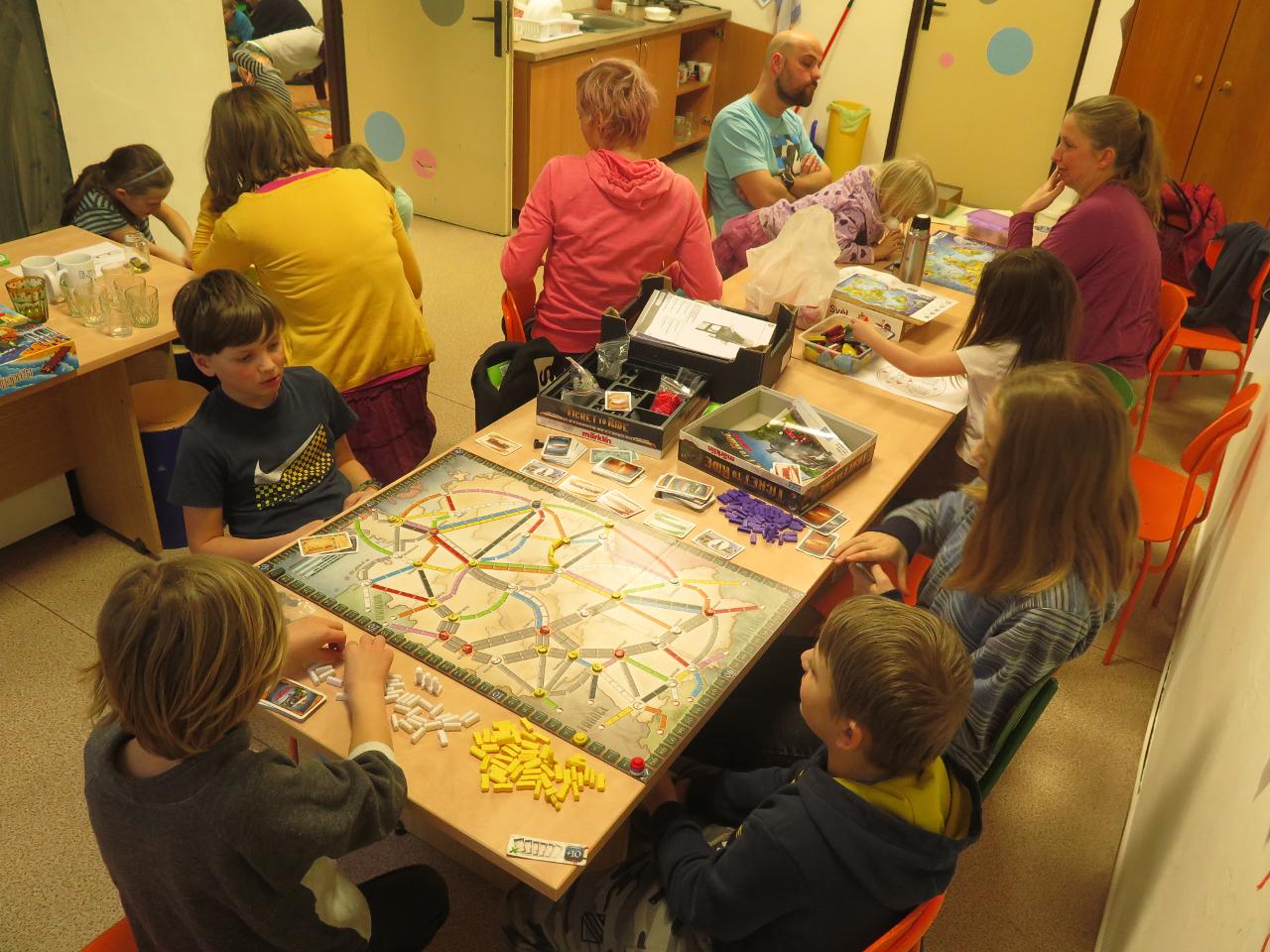 V druhé polovině února jsme se začali blížit k masopustnímu veselí. Školáci začali tvorbu masek technikou kašírování. Pracovali jsme s novinami a lepidlem, vytvořili jsme základní tvar masky, kterou jsme nechali na týden schnout. Navázali jsme také na předchozí týden medií tvorbou školního časopisu. Společně jsme vymýšleli název i obsah časopisu, který si tvoří školáci s pomocí dospěláků. Tvořili jsme rozmanité části časopisu, psali jsme články ze života mravenčího, kreslili jsme i vymýšleli hlavolamy. Při bruslícím úterku jsme také navštívili trutnovskou knihovnu a objevovali jsme, jak vypadají a co nabízí jiné časopisy. Školáci měli i chvilku na čtení toho, co jim padlo do oka - čas s klidem a radostí využili. Při angličtině si starší třída zahrála pohybové hry v tělocvičně a spojila tak komunikaci v cizím jazyce a fyzickou aktivitu. Ve čtvrtek jsme pak společně zažili druhé deskohraní, školáci i jejich rodiče naplnili družinu radostnou atmosférou plnou kartiček, vagónků, figurek, kostek a hráli rozmanité hry. Například při cestách vlaky po Evropě využívali k porozumění jazyky, které cestou potkali - kromě češtiny i francouzštinu, angličtinu a němčinu.