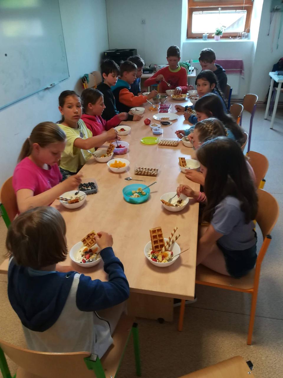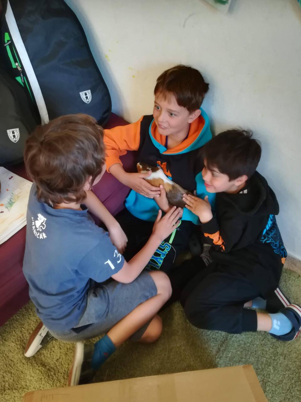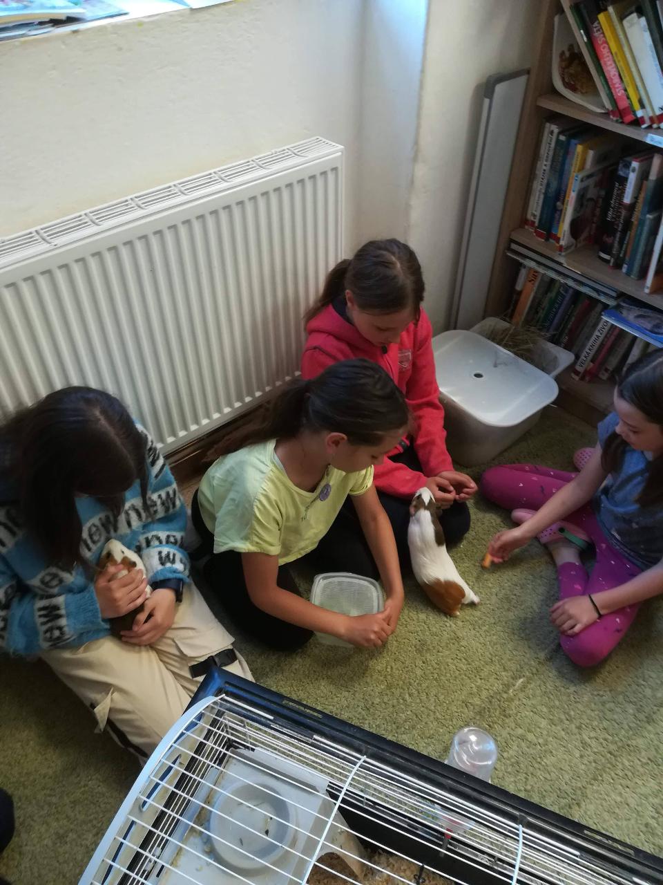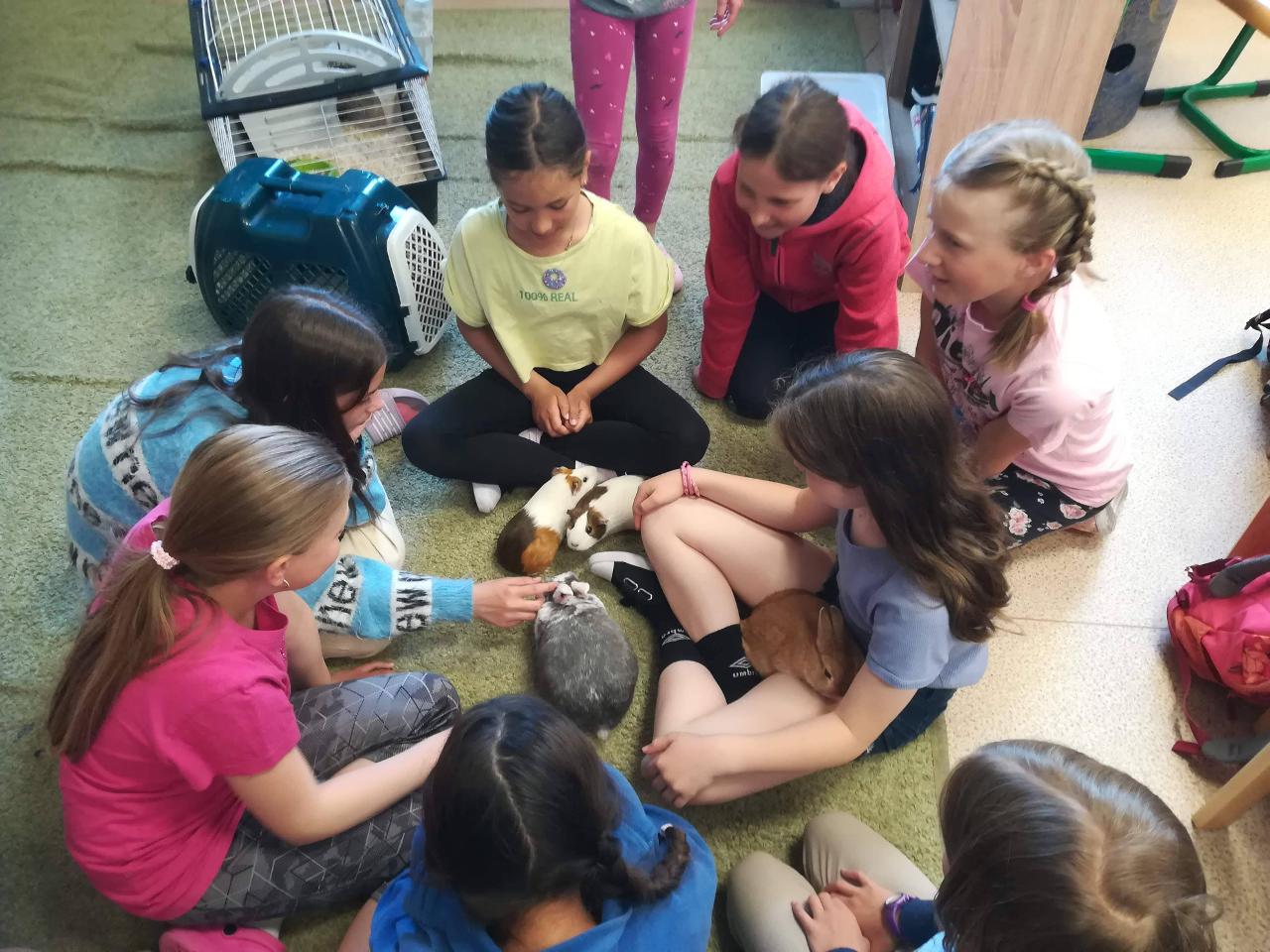 Dnes si děti mohly přinést domácí mazlíčky. Nejdříve si je prohlédly - králíčky, morčata a dokonce i strašilky. Vytvořily si poháry z přinesených dobrot. Zahrály si venku hry a vyvenčily u toho své mazlíčky. K obědu byla pizza! S plnými bříšky se děti odkulily do třídy na film, kde pokračovaly v mlsání popcornu, zmrzliny….Den, jaký si přály.