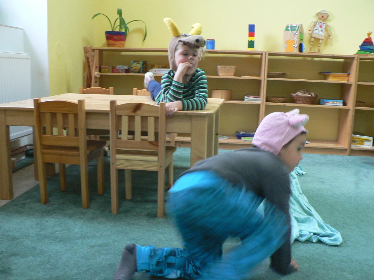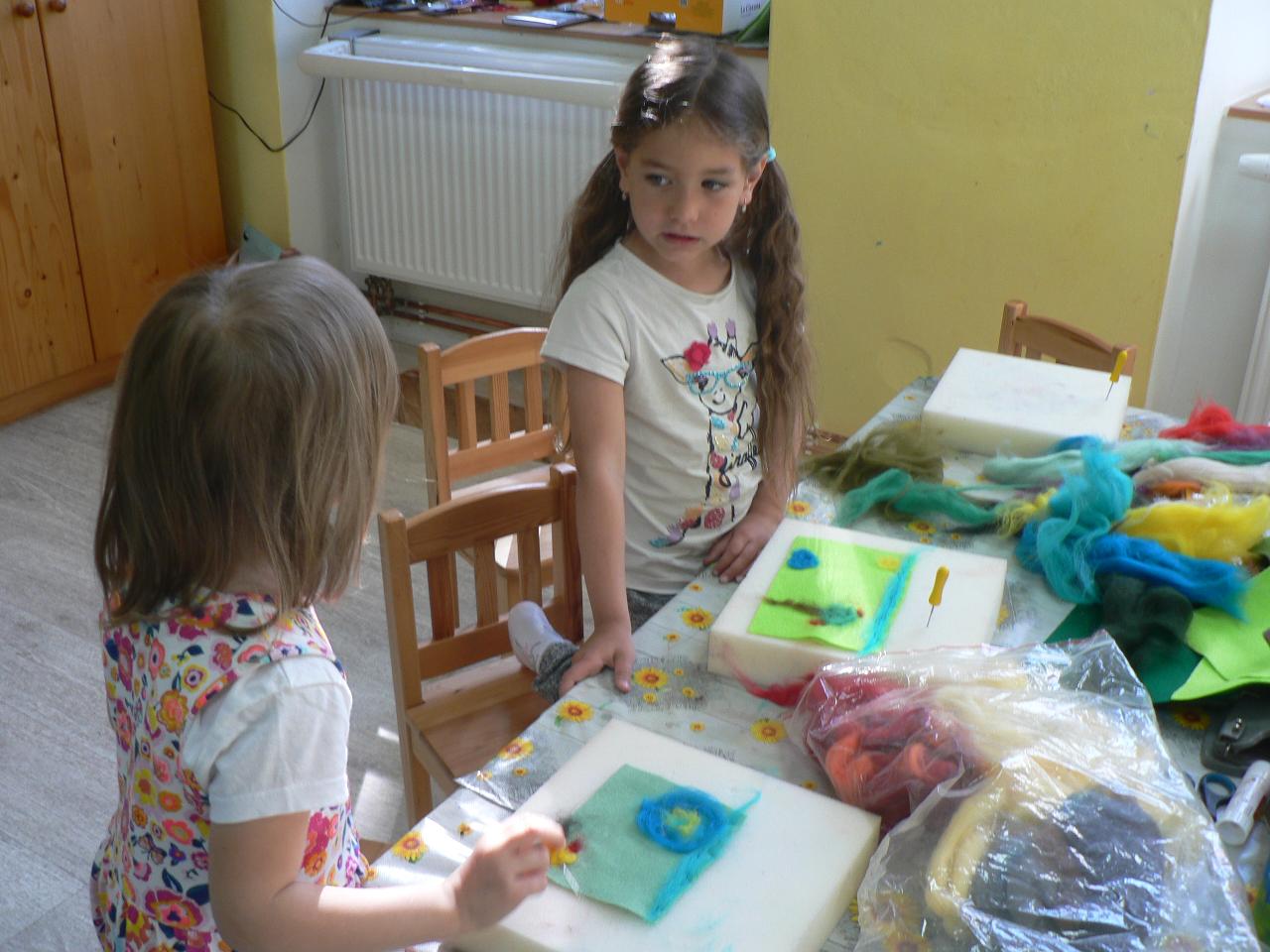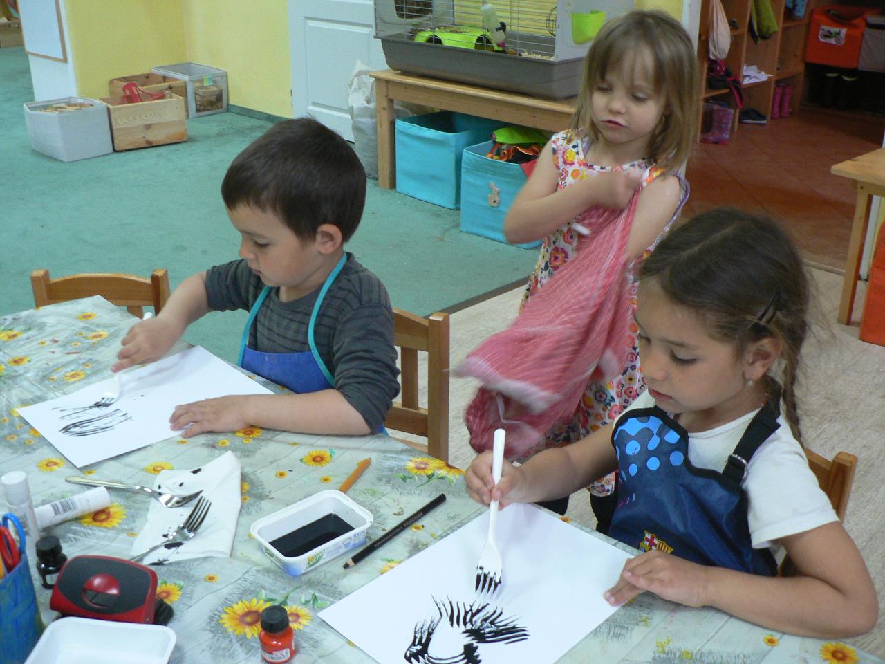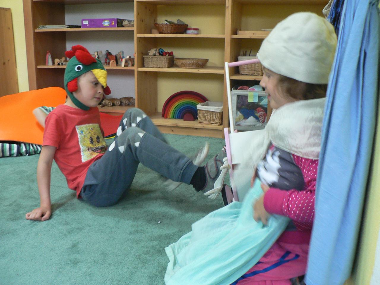 Tradiční pohádka o lakomém kohoutkovi a obětavé slepičce, pohádka, kterou děti dobře znají a která je výborná na procvičení paměti a schopnosti koncentrace. Koho musela slepička poprosit o pomoc, než dostala vodu pro svého kohoutka, co všechno musela udělat a jak to šlo popořadě. Posloupnost příběhu jsme zkoušeli také s pomocí obrázkových kartiček a dát dohromady správný průběh během čtvrtečního divadýlka pak už byla hračka. Při každodenním vyrábění jsme s dětmi lepili papírové slepičky, drátkovali zápichy do květináčů, malovali kohoutky tuší nebo plstili rozkvetlou louku. Naučili jsme se nové říkanky, hráli pohybové hry, cvičili jógu. Venku jsme se hodně věnovali pohybovým aktivitám a hrám, hodně jsme běhali, šplhali po stromech, lezli po kládách i po kamenech, honili jsme se i schovávali. Na louce jsme pak lovili brouky či pavouky a jiný hmyz.