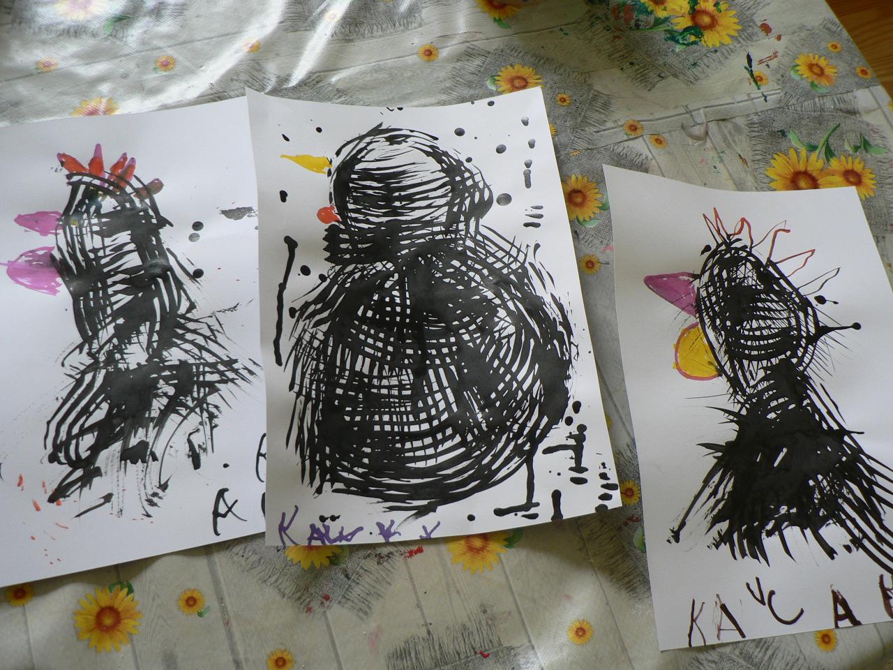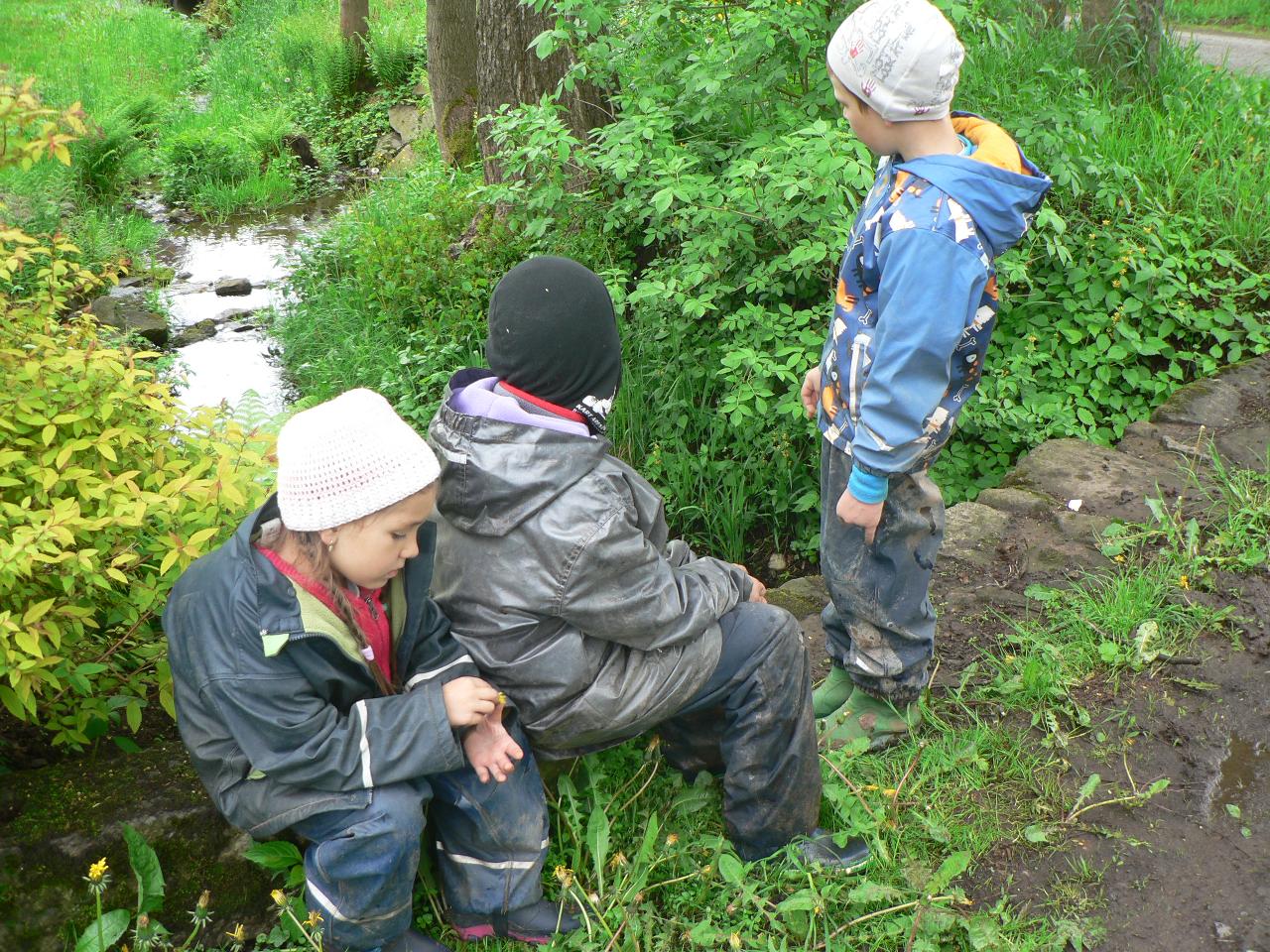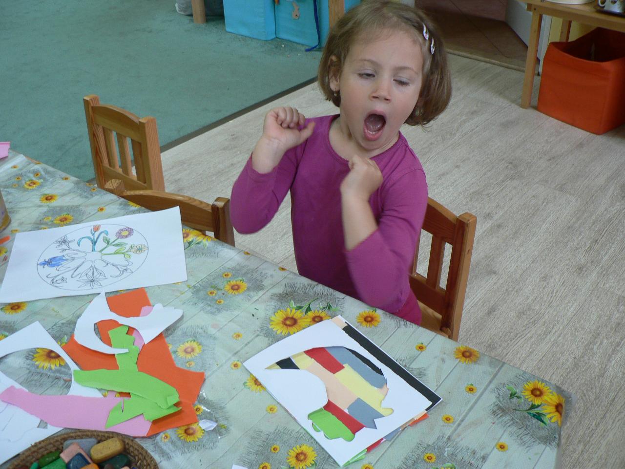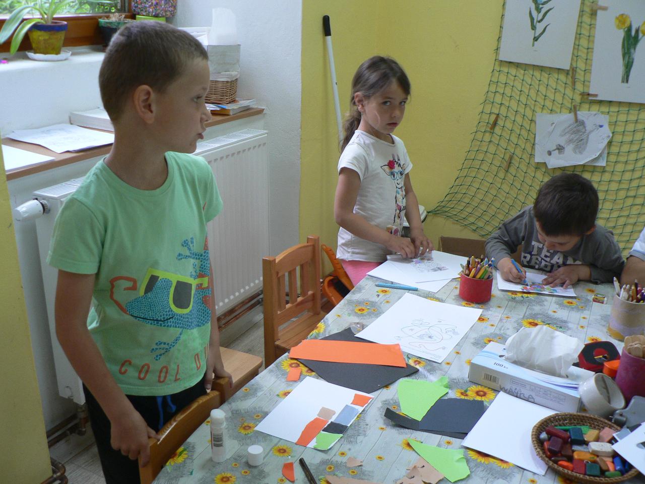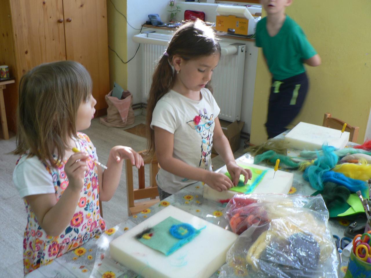 Tradiční pohádka o lakomém kohoutkovi a obětavé slepičce, pohádka, kterou děti dobře znají a která je výborná na procvičení paměti a schopnosti koncentrace. Koho musela slepička poprosit o pomoc, než dostala vodu pro svého kohoutka, co všechno musela udělat a jak to šlo popořadě. Posloupnost příběhu jsme zkoušeli také s pomocí obrázkových kartiček a dát dohromady správný průběh během čtvrtečního divadýlka pak už byla hračka. Při každodenním vyrábění jsme s dětmi lepili papírové slepičky, drátkovali zápichy do květináčů, malovali kohoutky tuší nebo plstili rozkvetlou louku. Naučili jsme se nové říkanky, hráli pohybové hry, cvičili jógu. Venku jsme se hodně věnovali pohybovým aktivitám a hrám, hodně jsme běhali, šplhali po stromech, lezli po kládách i po kamenech, honili jsme se i schovávali. Na louce jsme pak lovili brouky či pavouky a jiný hmyz.