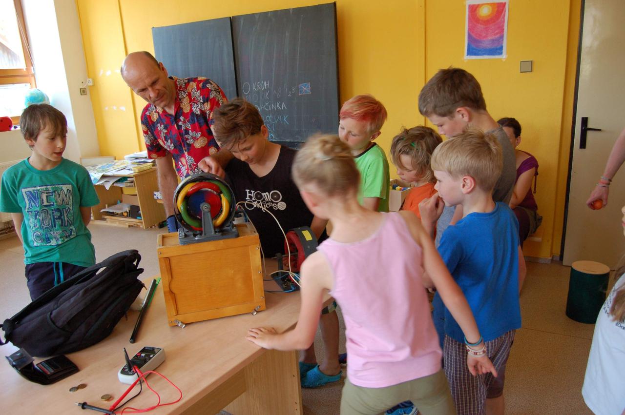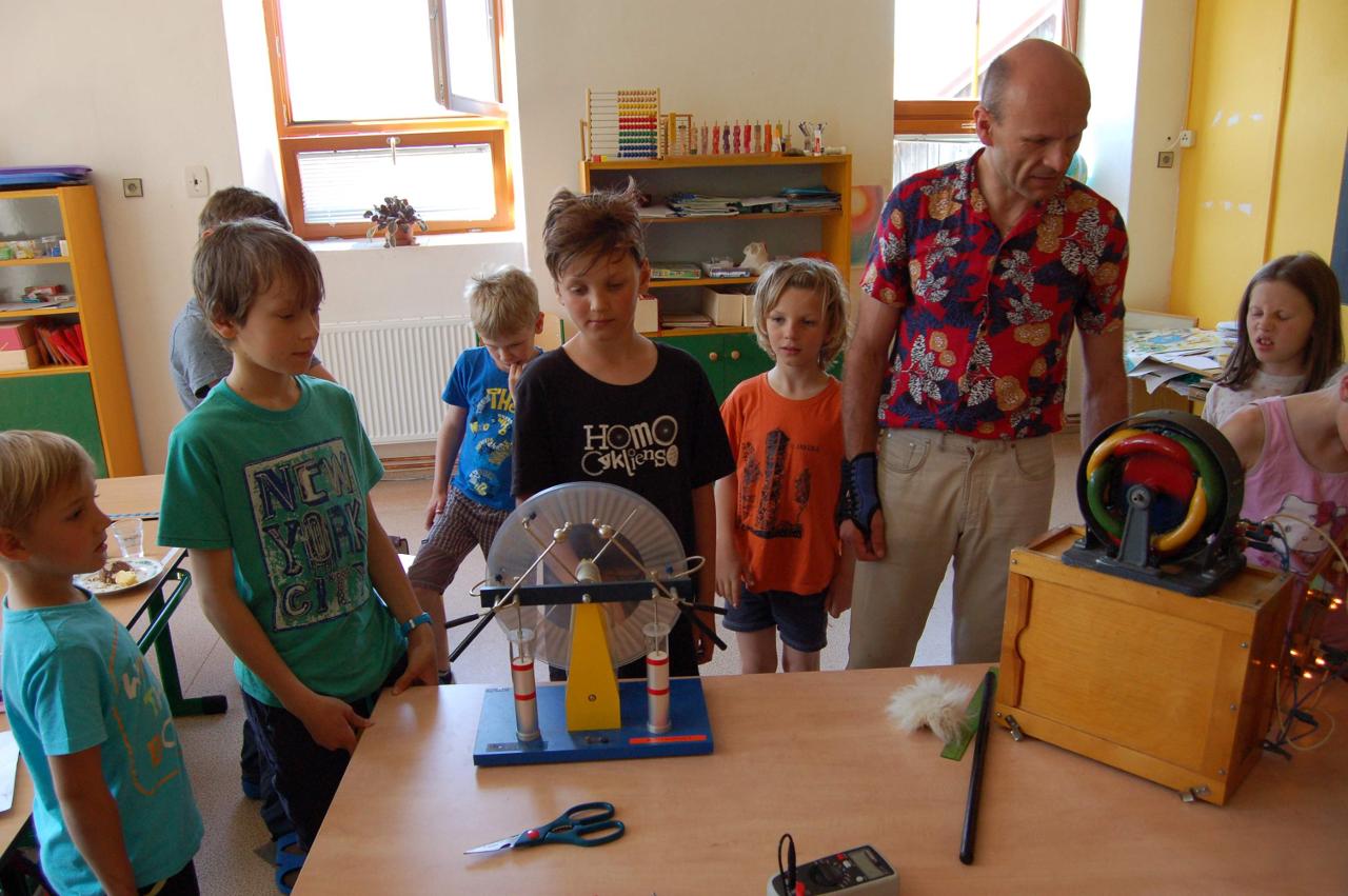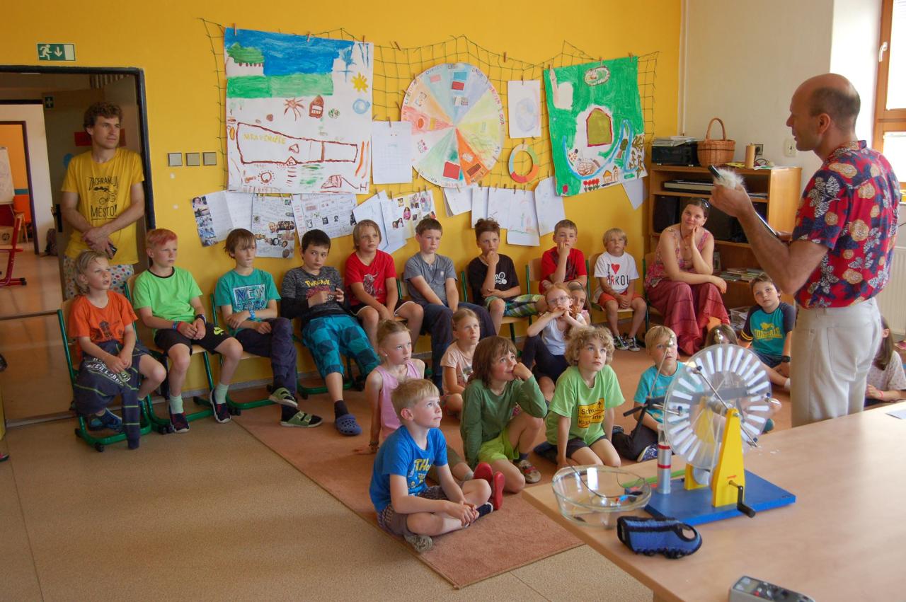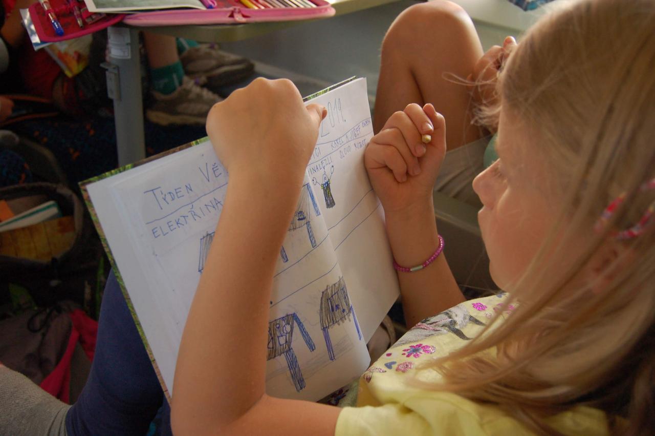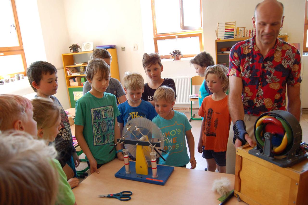 Na dopravní týdny jsme navázali tak potřebnou vědou, která nám díky svým objevům umožňuje rozmanité pokroky. Začátek týdne patřil svátku Mezinárodního dne dětí - školáci se dle své volby věnovali jednotlivým předmětům. V pondělí a v úterý jsme zažili v rámci projektu Lidé kolem nás aneb dospělí dětem fyzikální pokusy s Ondrou Lvem a Liborem Turkem, dvěma tatínky školních dětí vyučujících fyziku na trutnovském gymnáziu. Ukázali nám, jak lze vyrobit elektřinu, co to elektřina je, co nám umožňuje nebo jaké divy se dají dělat s magnetem či závažím. Vše jsme nejen viděli, ale mohli jsme si i vyzkoušet. Ve čtvrtek jsme vyrazili do Prahy - Letňan na Veletrh vědy. Cestou jsme poznávali známé i neznámé české vědce a jejich objevy, na místě jsme na mnoha stanovištích poznali rozmanitosti vědy a mnohé jsme si také vyzkoušeli, například jak se pilotuje letadlo (na simulátoru), jak může jezdit vlak na solární pohon, jak a kde postavit protipovodňovou hráz, aby to lidem pomohlo nebo jak zjistit, z čeho se skládá rostlina a mnoho dalšího z různých oborů. Zažili jsme i pokus, který nám ukázal, jak rozsvítit žárovku citronem nebo jsme zažili rozhovor s akrobatickým letcem Martinem Šonkou. Kromě vědy jsme také začali připravovat zahradní slavnost, programovali jsme, pracovali jsme s vyjmenovanými slovy. V pátek nás Káťa Šímová provedla drátkováním, a tak si každý něco pěkného vytvořil - například srdíčko ozdobené korálky.