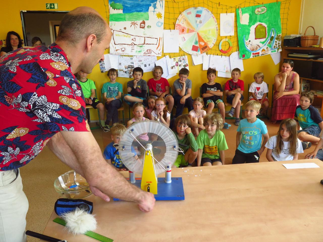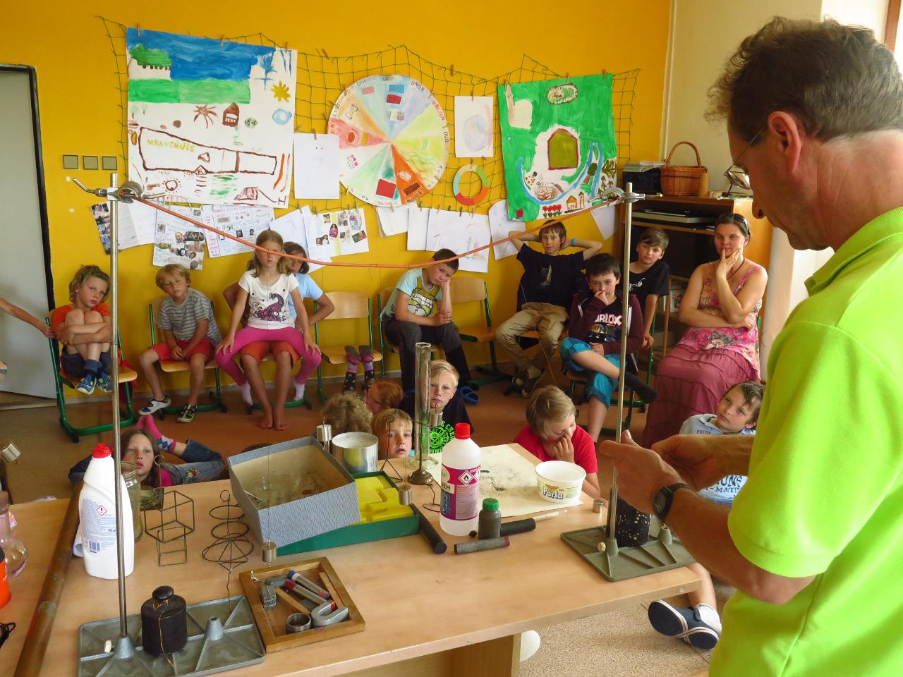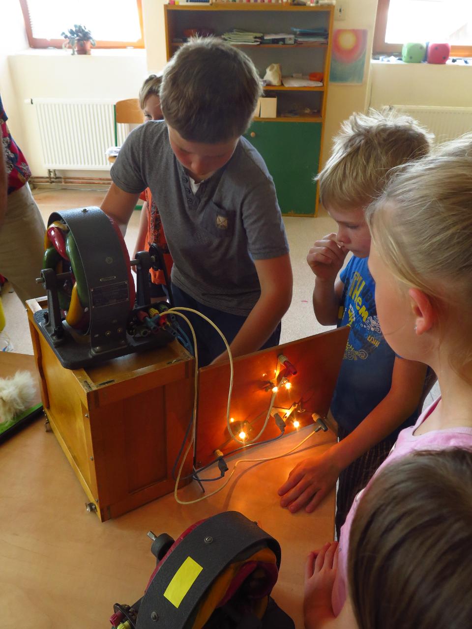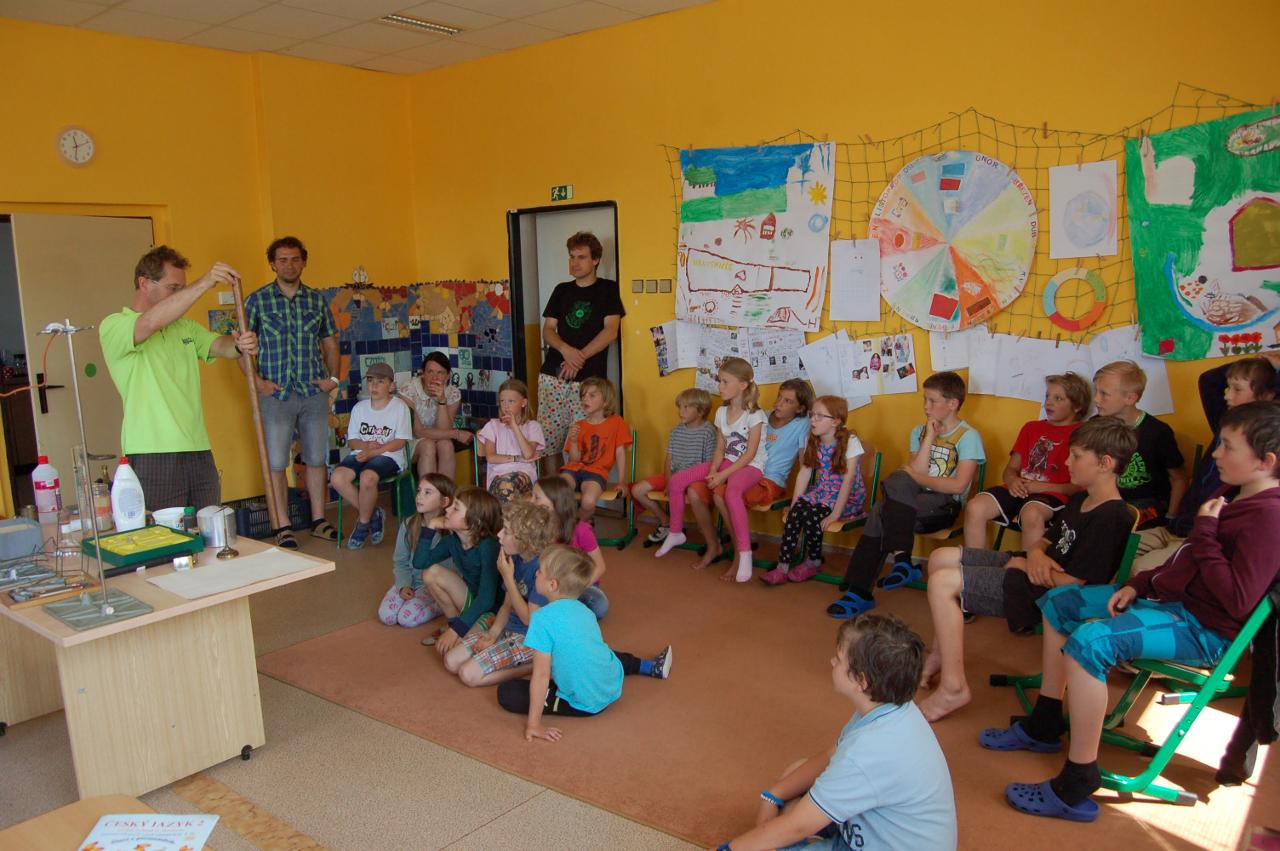 Na dopravní týdny jsme navázali tak potřebnou vědou, která nám díky svým objevům umožňuje rozmanité pokroky. Začátek týdne patřil svátku Mezinárodního dne dětí - školáci se dle své volby věnovali jednotlivým předmětům. V pondělí a v úterý jsme zažili v rámci projektu Lidé kolem nás aneb dospělí dětem fyzikální pokusy s Ondrou Lvem a Liborem Turkem, dvěma tatínky školních dětí vyučujících fyziku na trutnovském gymnáziu. Ukázali nám, jak lze vyrobit elektřinu, co to elektřina je, co nám umožňuje nebo jaké divy se dají dělat s magnetem či závažím. Vše jsme nejen viděli, ale mohli jsme si i vyzkoušet. Ve čtvrtek jsme vyrazili do Prahy - Letňan na Veletrh vědy. Cestou jsme poznávali známé i neznámé české vědce a jejich objevy, na místě jsme na mnoha stanovištích poznali rozmanitosti vědy a mnohé jsme si také vyzkoušeli, například jak se pilotuje letadlo (na simulátoru), jak může jezdit vlak na solární pohon, jak a kde postavit protipovodňovou hráz, aby to lidem pomohlo nebo jak zjistit, z čeho se skládá rostlina a mnoho dalšího z různých oborů. Zažili jsme i pokus, který nám ukázal, jak rozsvítit žárovku citronem nebo jsme zažili rozhovor s akrobatickým letcem Martinem Šonkou. Kromě vědy jsme také začali připravovat zahradní slavnost, programovali jsme, pracovali jsme s vyjmenovanými slovy. V pátek nás Káťa Šímová provedla drátkováním, a tak si každý něco pěkného vytvořil - například srdíčko ozdobené korálky.