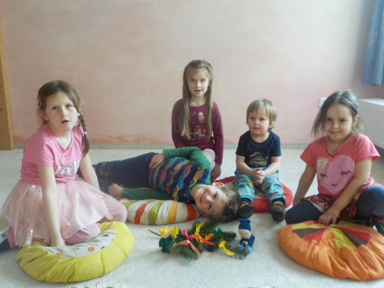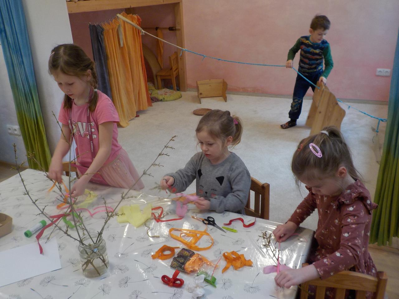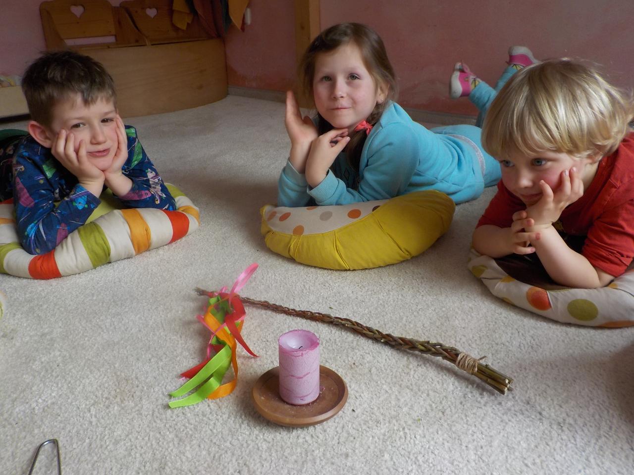 Květná neděle je příležitostí pro děvčata, poprvé po zimě se obléci do sukýnek a s lítečkem vyzdobeným barevnými pentlemi se vydat na koledu. Na zahrádkách jsou vidět další odvážné květinky - krokusy, narcisky, petrklíče, zlatý déšť očaruje každého svými něžnými kvítky a když se na větvičku přidá pár ozdobených vajíček je tu rázem velikonoční čas. A pak zase klučičí čas - upletli jsme si pomlázku a koleda zněla zvesela. Nechyběl pečený beránek, v květináčku nám odvážně raší kaštan a pšenice si dává na čas. Z posledního sněhu ještě alespoň jednou chceme stihnout sněhuláka. A aby toho všeho nebylo málo, slavíme další krásné narozeniny a přát přichází i náš skřítek.
