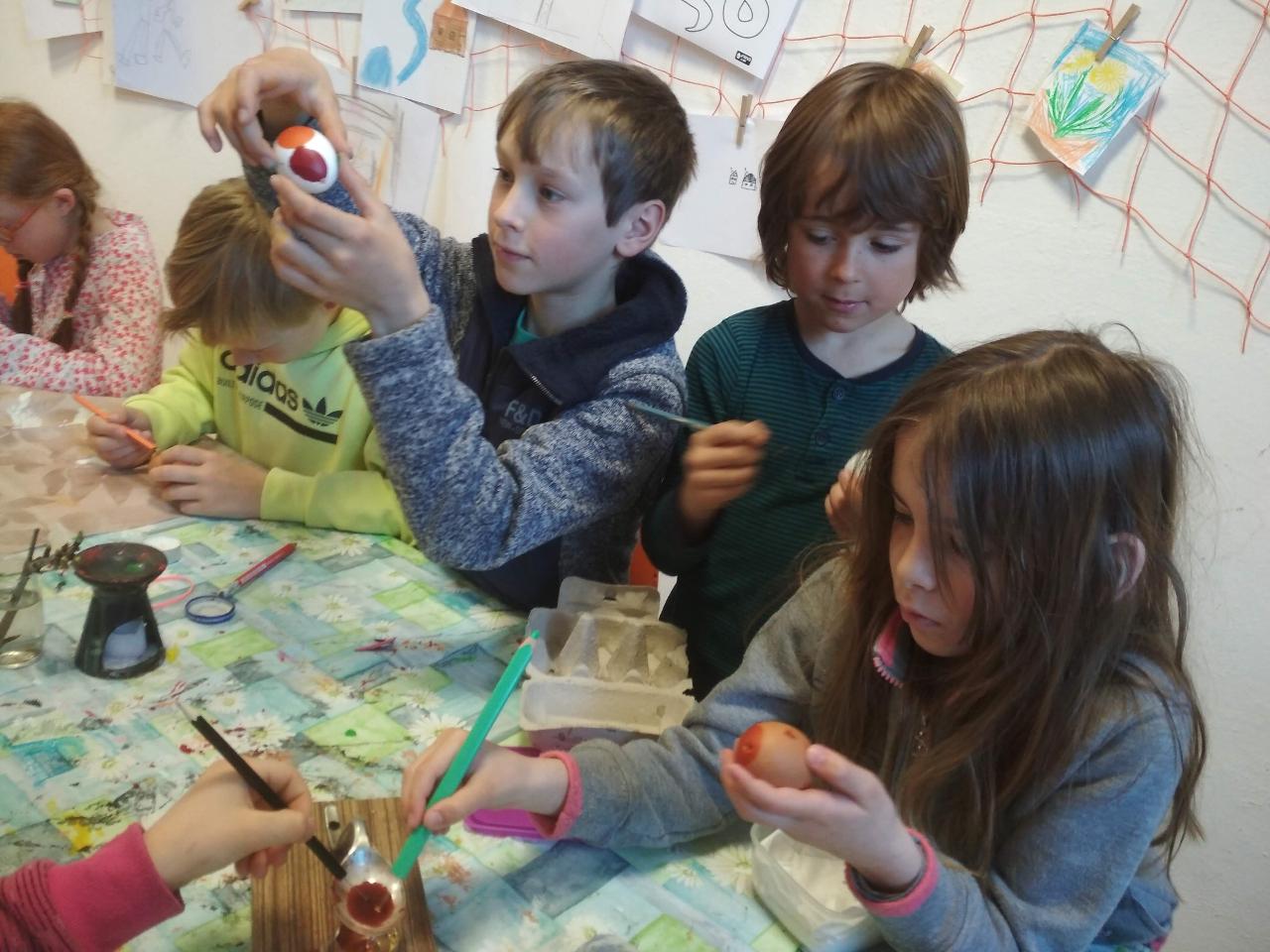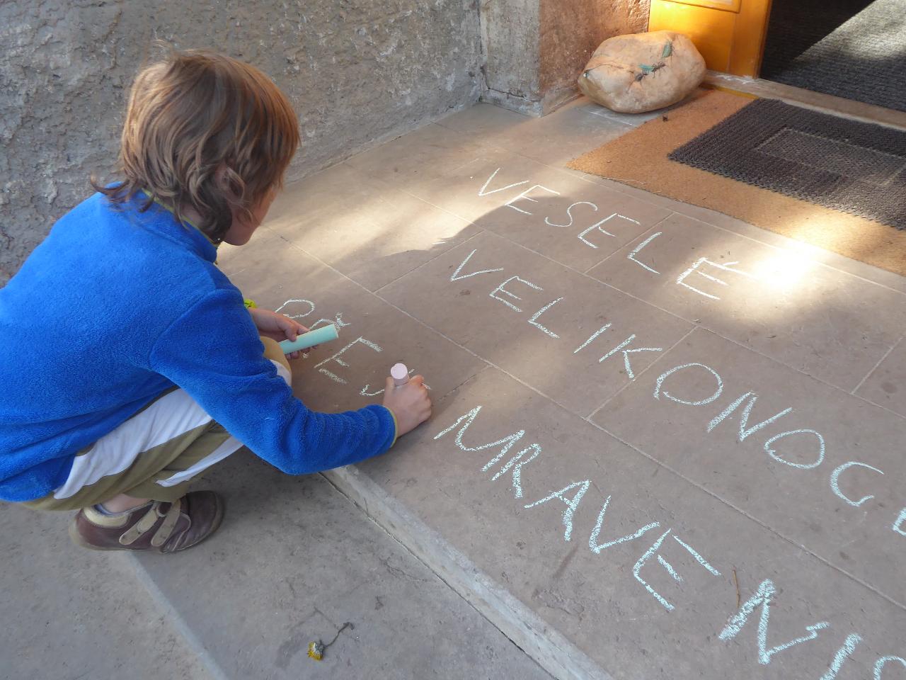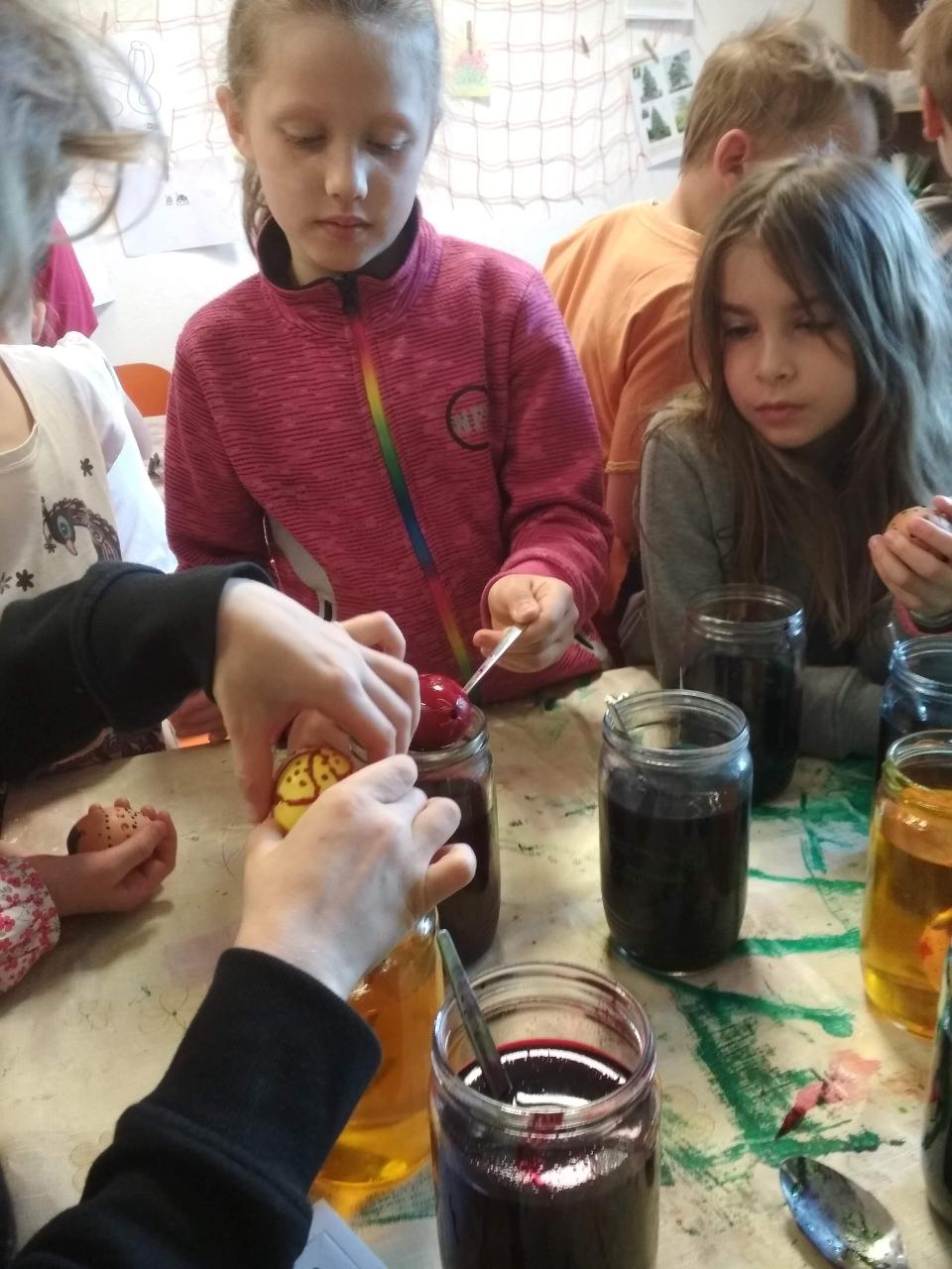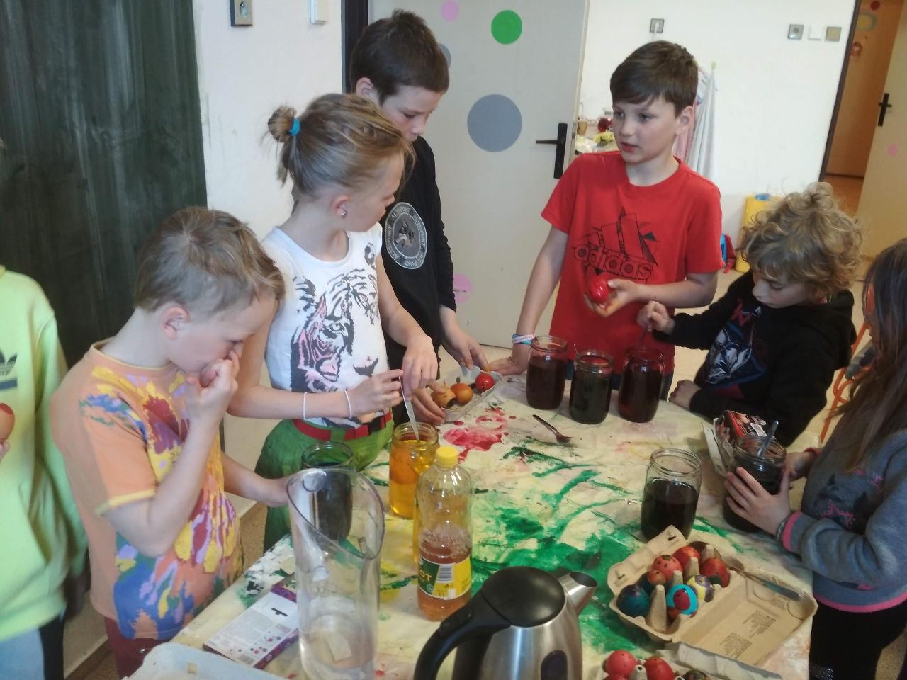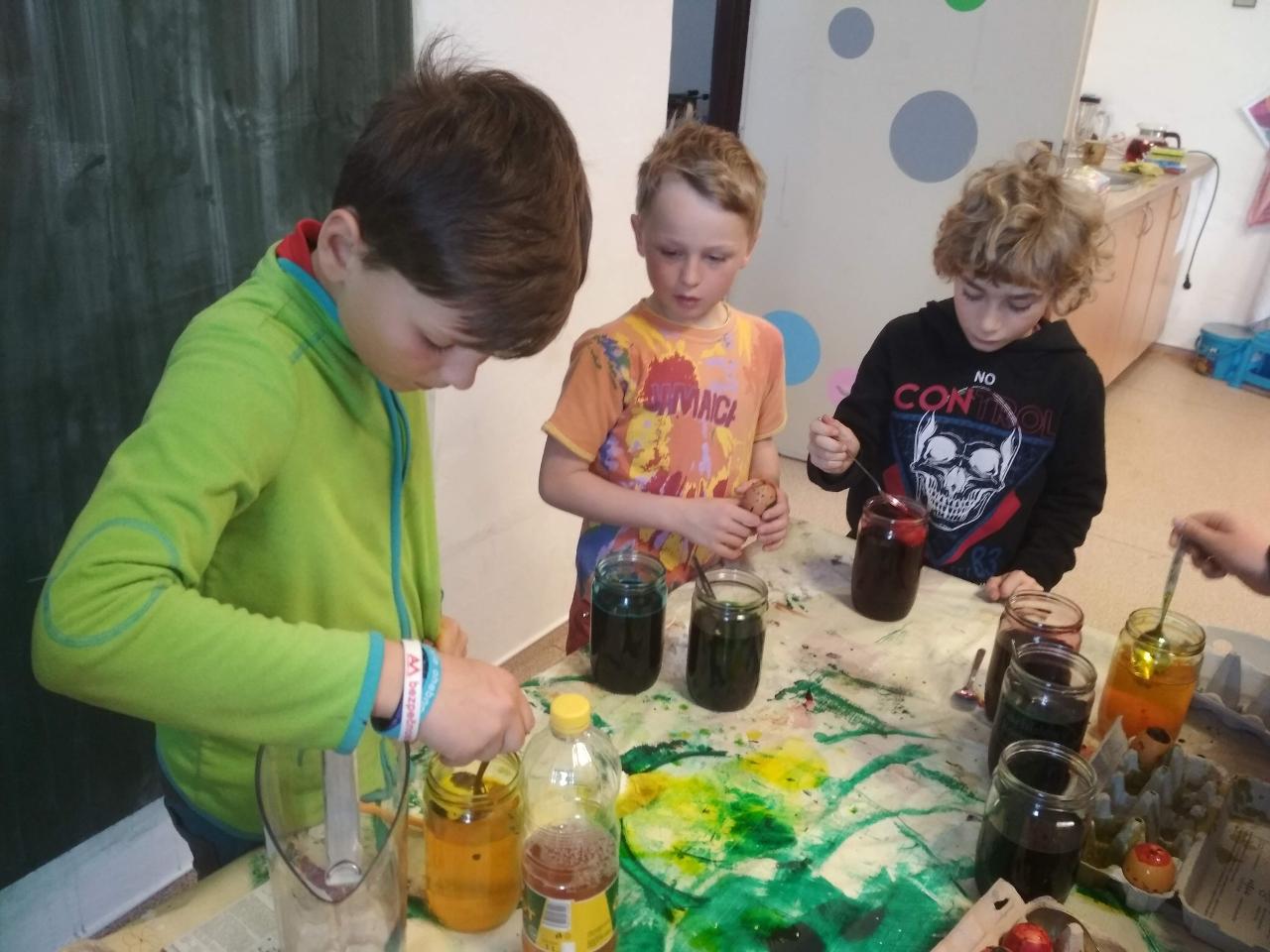 Na téma týdne jsme navázali hnedle v pondělí zrána projektem “Lidé kolem nás aneb dospělí dětem”.Tentokrát si Cyrilova mamka pro nás přichystala tvoření velikonočních kraslic. Vejdunků jsme společně přinesli dostatek, a tak si každý školák mohl vytvořit několik vlastních parádně vyzdobených vajíček. Krátký týden jsme propojili zpíváním i malováním velikonočních koled.Starší zapojili také tanec, který měl minulý týden velký úspěch. A protože se starším školákům líbilo, že ti mladší mohli učit dospěláky, tak si s chutí také přichystali vlastní hodiny angličtiny. Tělocvik nám zpestřila překážková dráha z vrbového proutí, které si předtím školáci nastříhali, a po tělocviku připravili pro středeční velikonoční tvoření. Jak jsme týden začali, také jsme ho i skončili :-) Ve středu odpoledne jsme pokračovali velikonočními tradicemi a vytvářeli z vrbových poutků pomlázky, vrbové domečky, zápichy, ozdobné věnečky z břízek, průsvity do oken nebo voskem malovaná vajíčka.