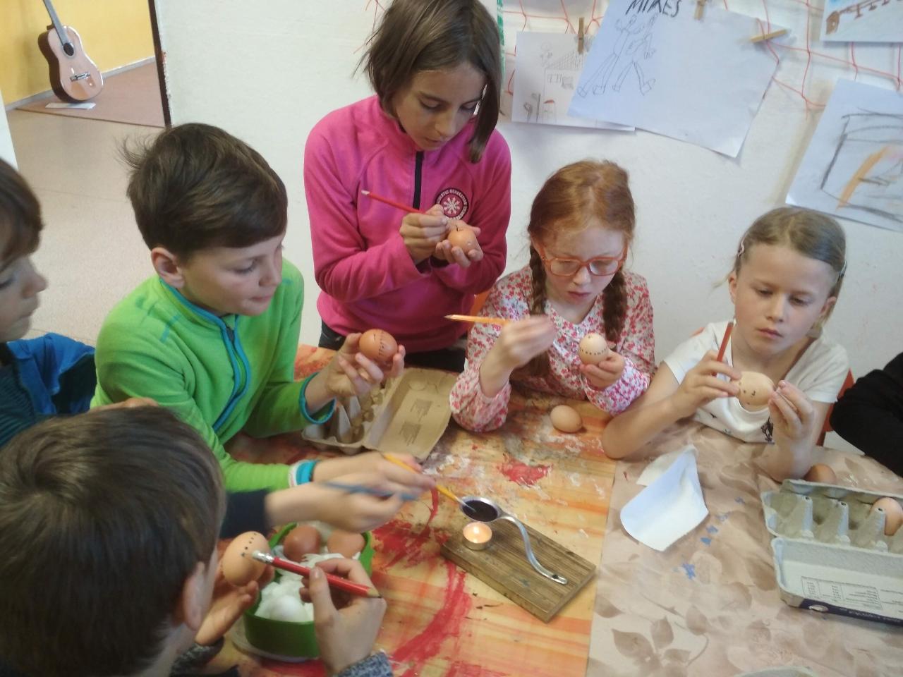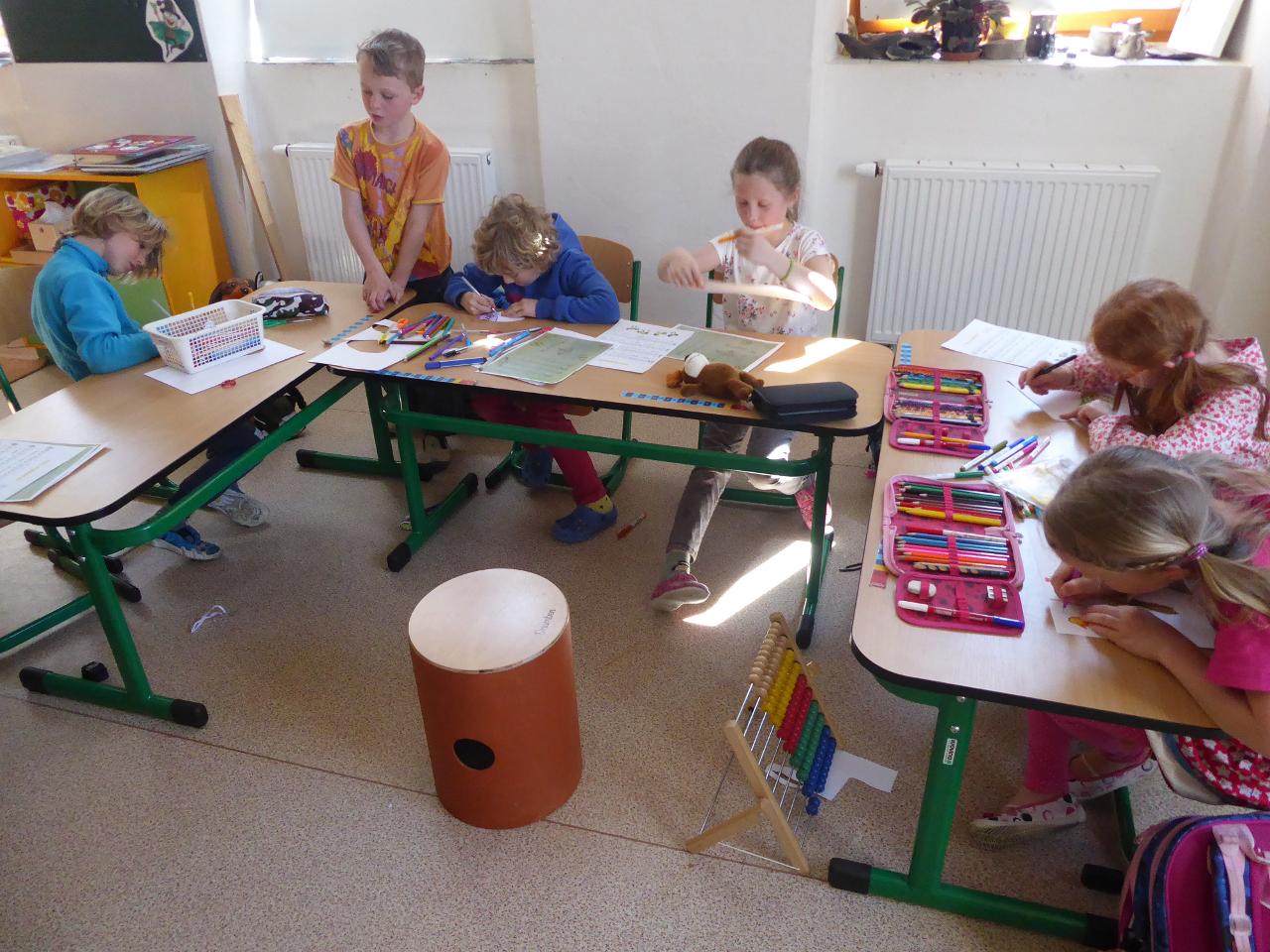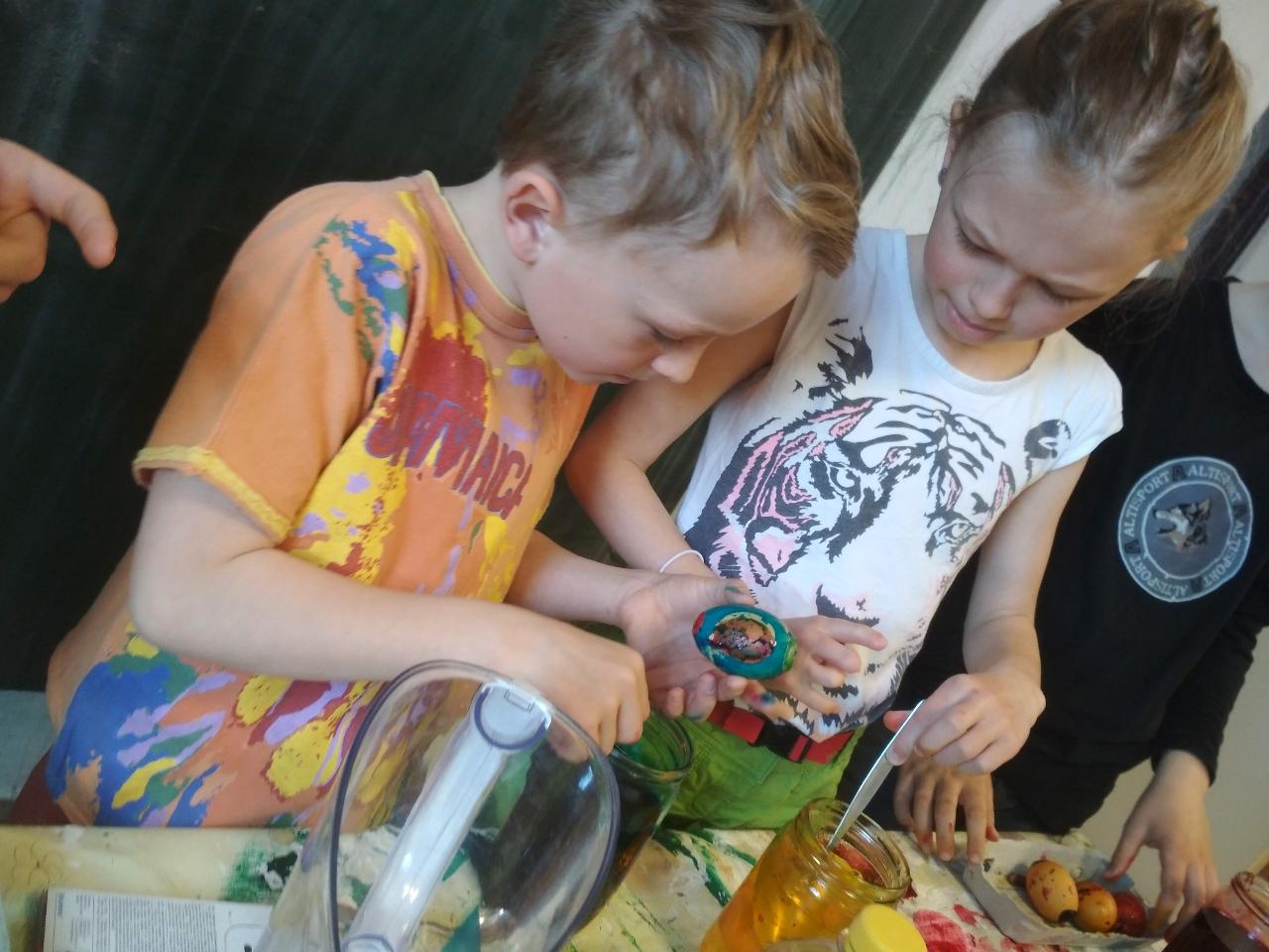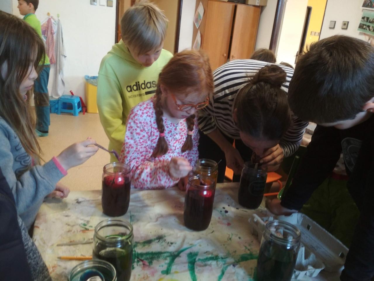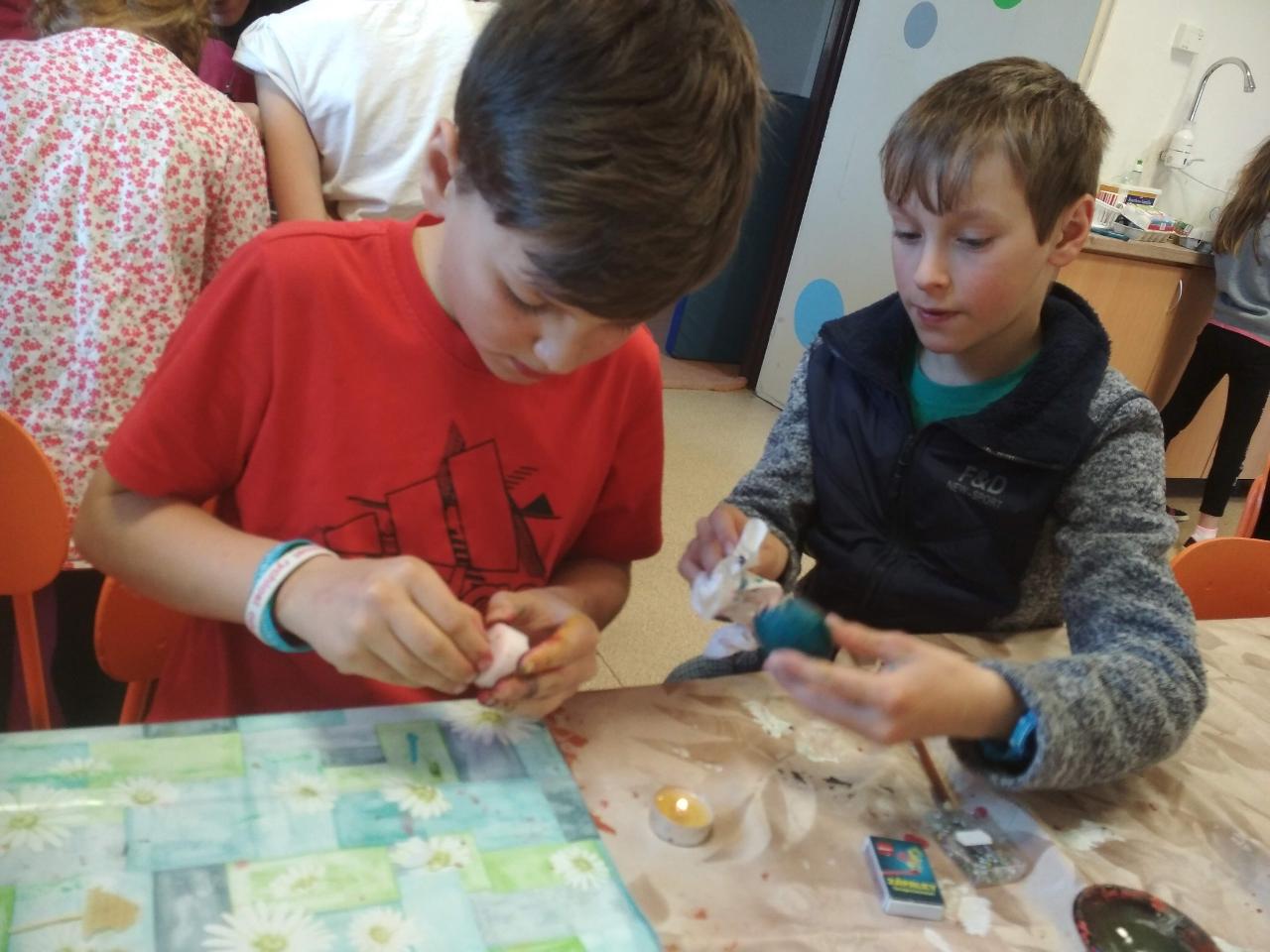 Na téma týdne jsme navázali hnedle v pondělí zrána projektem “Lidé kolem nás aneb dospělí dětem”.Tentokrát si Cyrilova mamka pro nás přichystala tvoření velikonočních kraslic. Vejdunků jsme společně přinesli dostatek, a tak si každý školák mohl vytvořit několik vlastních parádně vyzdobených vajíček. Krátký týden jsme propojili zpíváním i malováním velikonočních koled.Starší zapojili také tanec, který měl minulý týden velký úspěch. A protože se starším školákům líbilo, že ti mladší mohli učit dospěláky, tak si s chutí také přichystali vlastní hodiny angličtiny. Tělocvik nám zpestřila překážková dráha z vrbového proutí, které si předtím školáci nastříhali, a po tělocviku připravili pro středeční velikonoční tvoření. Jak jsme týden začali, také jsme ho i skončili :-) Ve středu odpoledne jsme pokračovali velikonočními tradicemi a vytvářeli z vrbových poutků pomlázky, vrbové domečky, zápichy, ozdobné věnečky z břízek, průsvity do oken nebo voskem malovaná vajíčka.