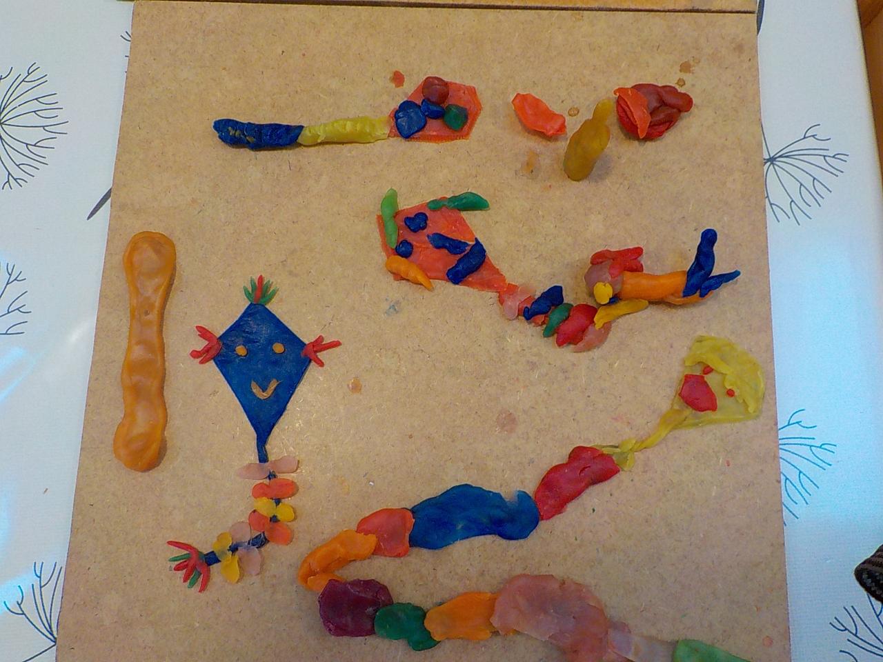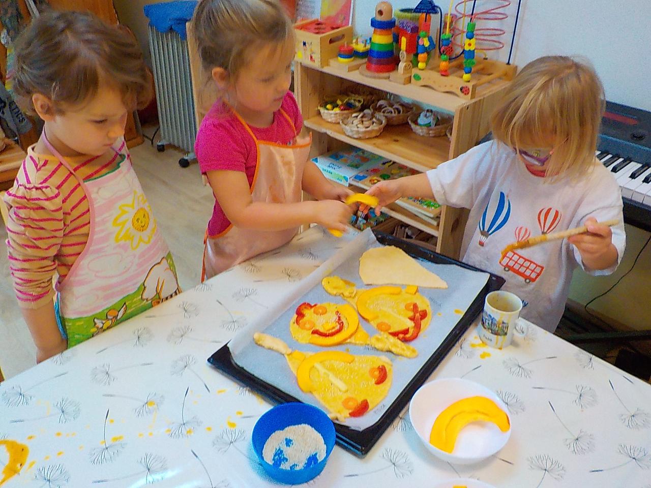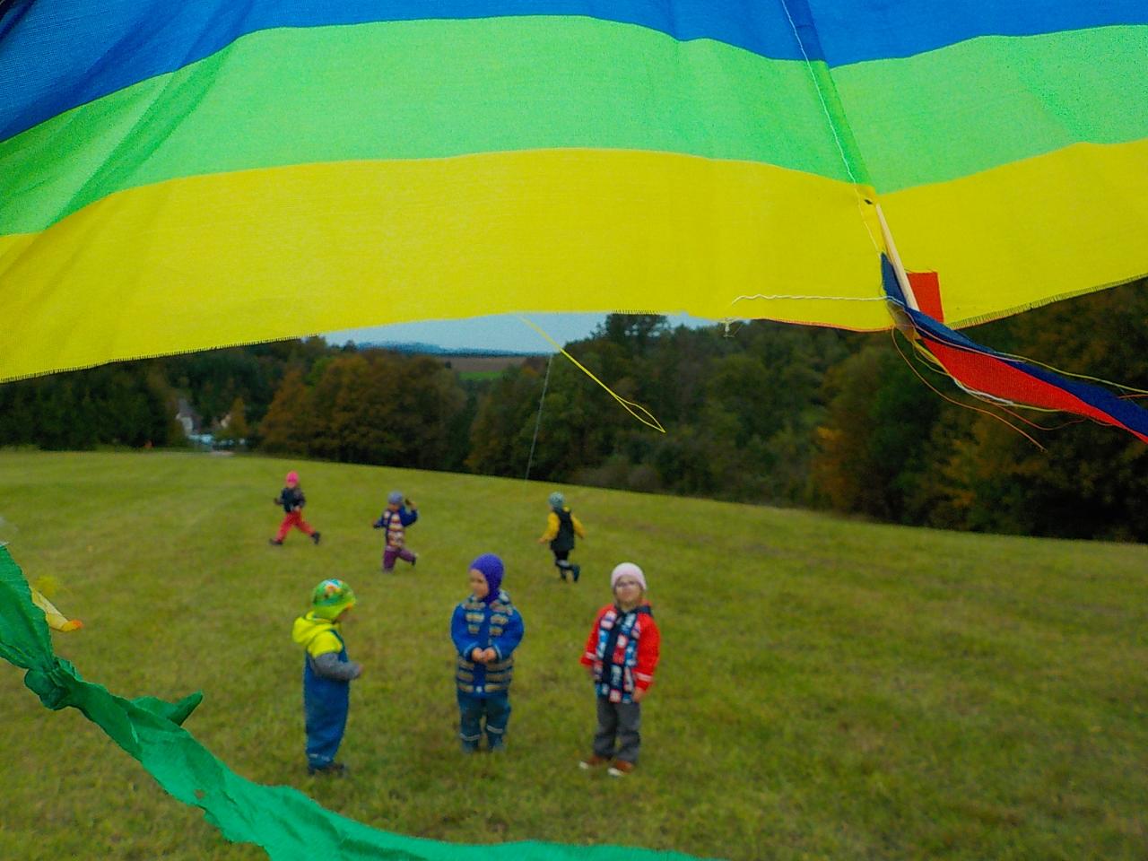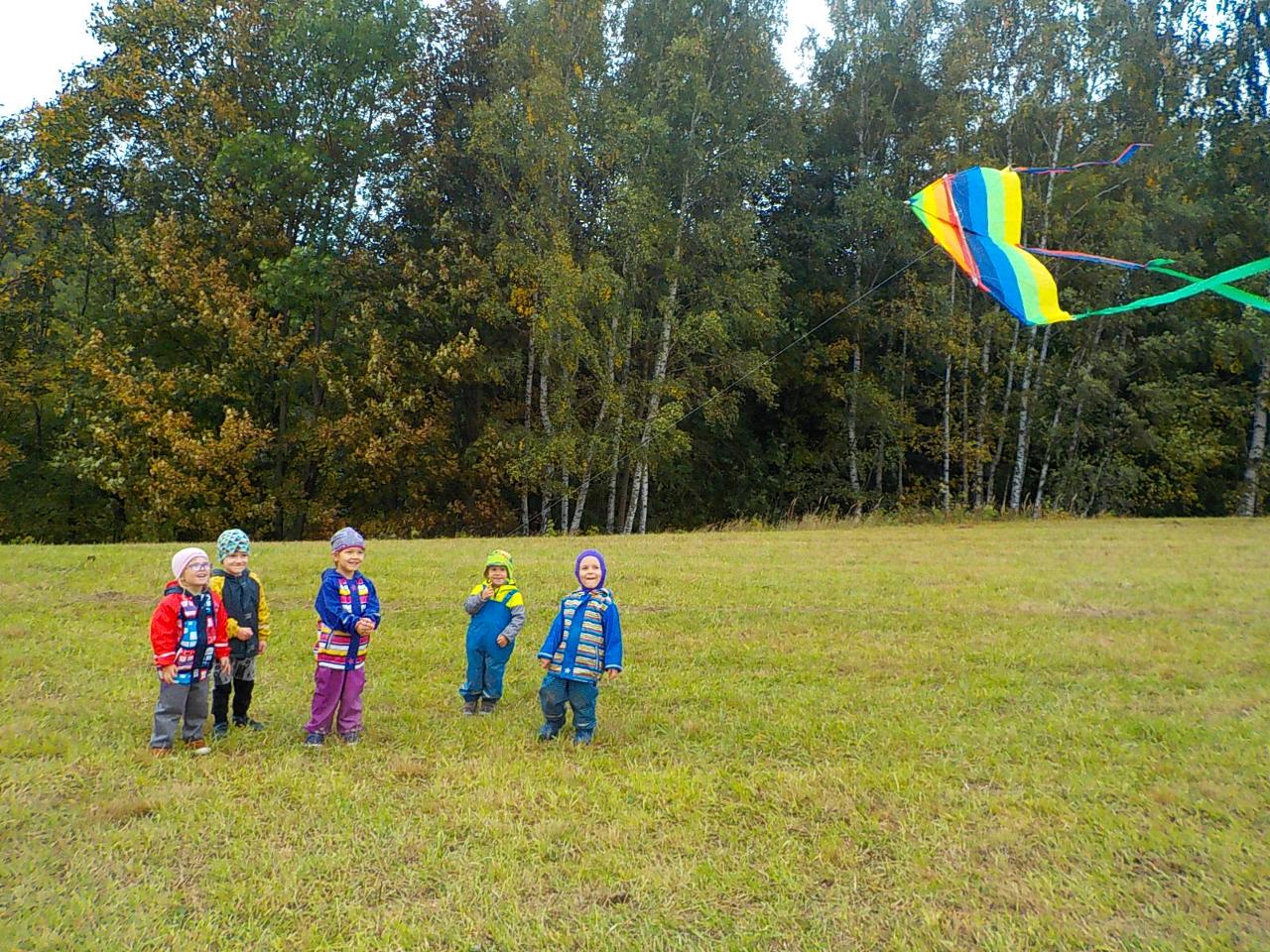Tento týden byl ve znamení létacích draků a větru. Vyprávíme si pohádku o drakovi nad strání a draka také pouštíme. V Mravenečkovi věšíme nové šátky a závěsy a zkoušíme, jak vlají. Vlají dokonce i igelitové pytlíky na provázku. Draky modelujeme a vystřihujeme a jednoho draka jsme si také ve středu upekli jako pizzu. Také jsme popřáli Beníkovi k narozeninám. A v pátek jsme si vyrobili létací komety, které k létání nepotřebují vítr, jen naši sílu. Jejich dlouhé ohony z krepáku se nám sice ve vlhké trávě dost rozmočily, ale zato se krásně podzimně obarvily (a naše ruce taky :-).