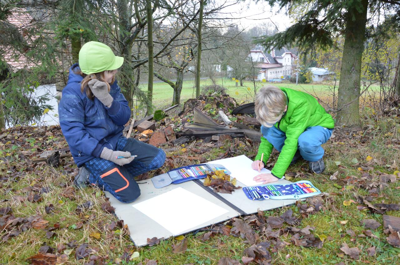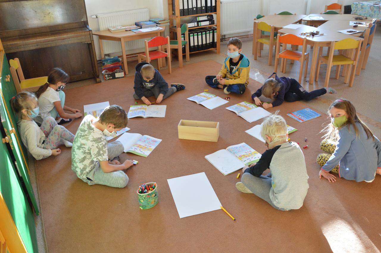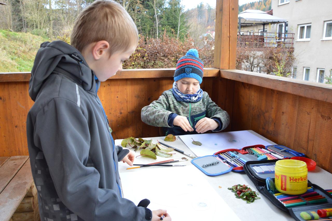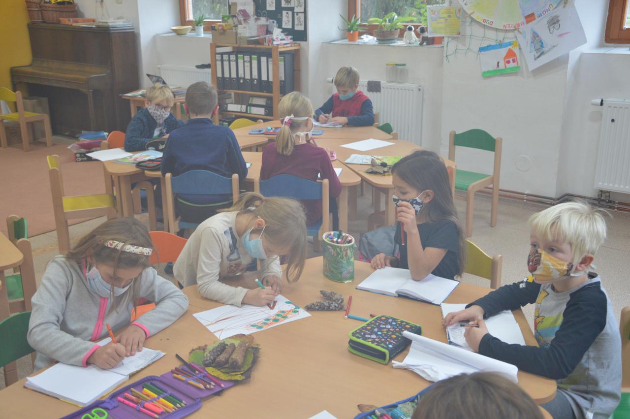 Po téměř měsíci výuky na dálku jsme po významném svátku svobody a demokracie přivítali ve škole třídu mladších dětí - prvňáčky, druháčky i třeťáčky. Radostně jsme se vítali, sdělovali si zážitky, pohráli si v družině i jsme se podívali, co se nám podařilo doma z českého jazyka a matematiky. Větší část jsme trávili venku, psali jsme klacíkem názvy stromů nebo prvňáčci začáteční písmena. V altánu jsme si s Míšou Šaránkem připomněli za zvuku české hymny a Modlitby pro Martu období 17.listopadu 1989. Také nás navštívil Král Ota I. ze Země čtenářů a pasoval druháčky na zkušenější čtenáře. Ve čtvrtek jsme měli venkovní den a jeden z cílů dne bylo dosažení Zaječího vrchu. Cestou jsme řešili krokovací rovnice v matematice, hráli slovní fotbal, skládali správné pořadí vět v příběhu, dozvěděli se nové informace o lišejníku v “kamínkovém lese” a cestou poznávali stromy. Po obědě jsme si zaznamenali do výletníčku venkovní výpravu a shlédli příběh ježka “Pajdy”, kterého jsme si zkusili zároveň vytvořit z šiškových šupin. V pátek jsme se pustili už opět do práce v pracovních sešitech češtiny a matematiky. Také jsme se vzájemně inspirovali zápisy z výletníčku a nakonec se pustili do tvorby podzimního autoportrétu. Autoportréty můžete shlédnout v galerii.