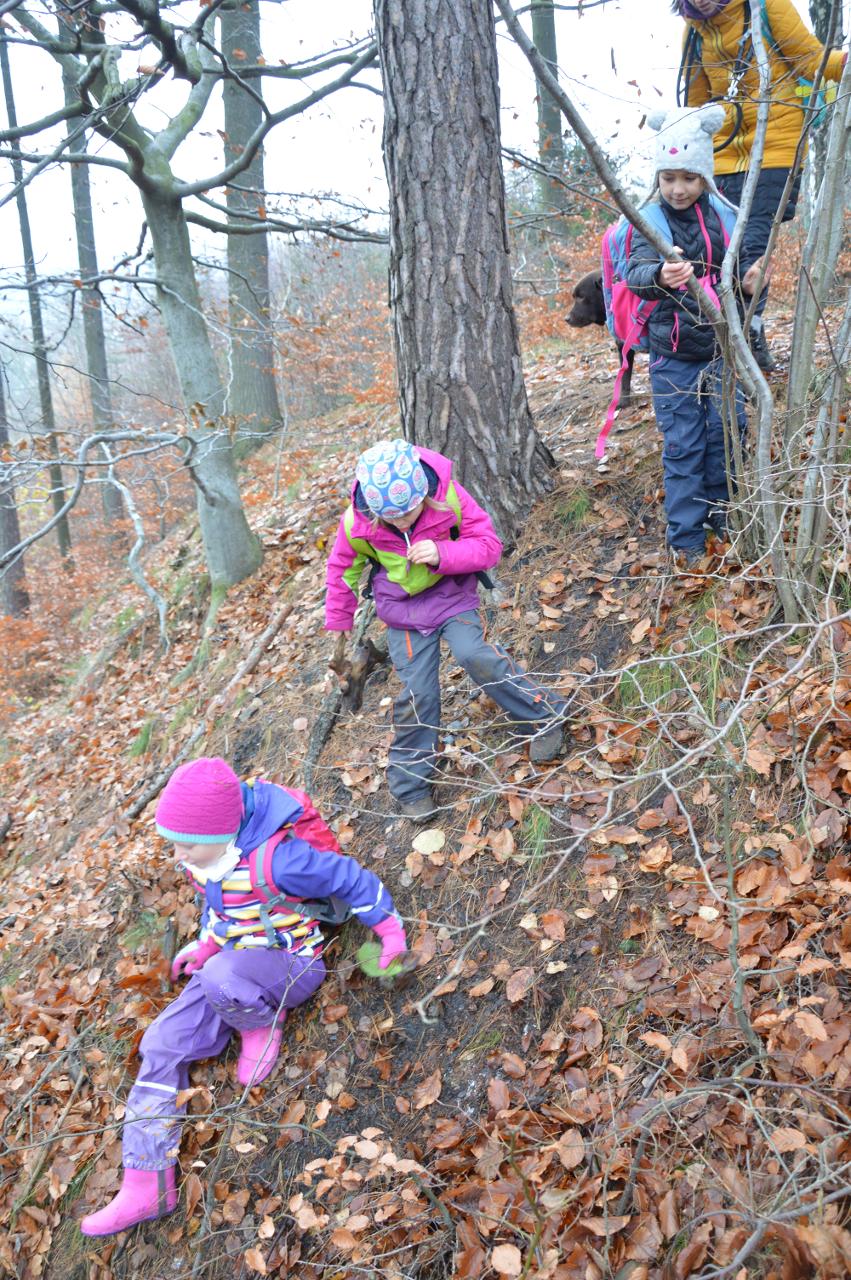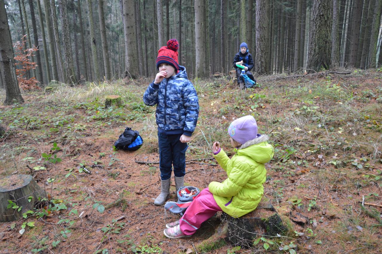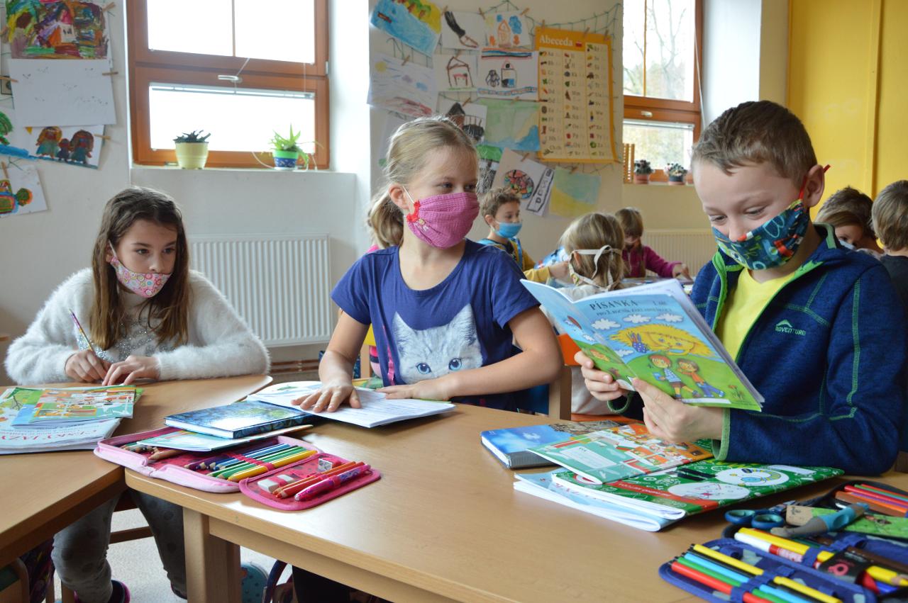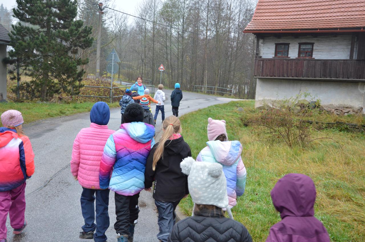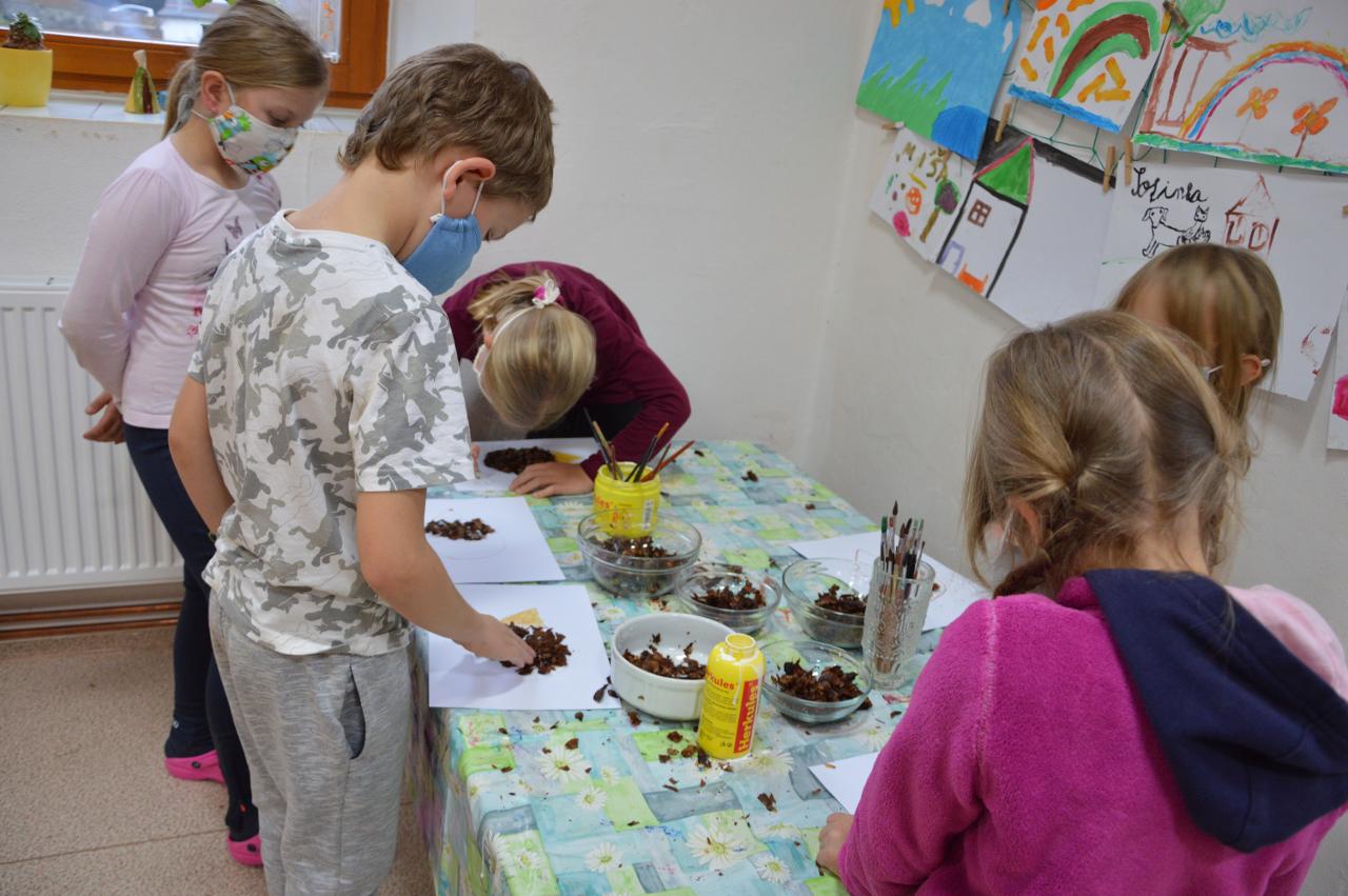 Po téměř měsíci výuky na dálku jsme po významném svátku svobody a demokracie přivítali ve škole třídu mladších dětí - prvňáčky, druháčky i třeťáčky. Radostně jsme se vítali, sdělovali si zážitky, pohráli si v družině i jsme se podívali, co se nám podařilo doma z českého jazyka a matematiky. Větší část jsme trávili venku, psali jsme klacíkem názvy stromů nebo prvňáčci začáteční písmena. V altánu jsme si s Míšou Šaránkem připomněli za zvuku české hymny a Modlitby pro Martu období 17.listopadu 1989. Také nás navštívil Král Ota I. ze Země čtenářů a pasoval druháčky na zkušenější čtenáře. Ve čtvrtek jsme měli venkovní den a jeden z cílů dne bylo dosažení Zaječího vrchu. Cestou jsme řešili krokovací rovnice v matematice, hráli slovní fotbal, skládali správné pořadí vět v příběhu, dozvěděli se nové informace o lišejníku v “kamínkovém lese” a cestou poznávali stromy. Po obědě jsme si zaznamenali do výletníčku venkovní výpravu a shlédli příběh ježka “Pajdy”, kterého jsme si zkusili zároveň vytvořit z šiškových šupin. V pátek jsme se pustili už opět do práce v pracovních sešitech češtiny a matematiky. Také jsme se vzájemně inspirovali zápisy z výletníčku a nakonec se pustili do tvorby podzimního autoportrétu. Autoportréty můžete shlédnout v galerii.