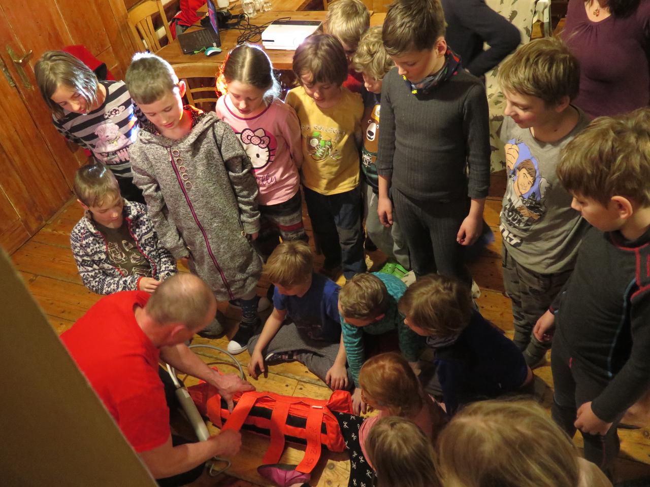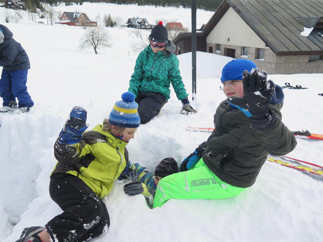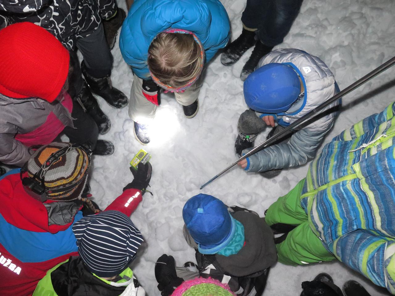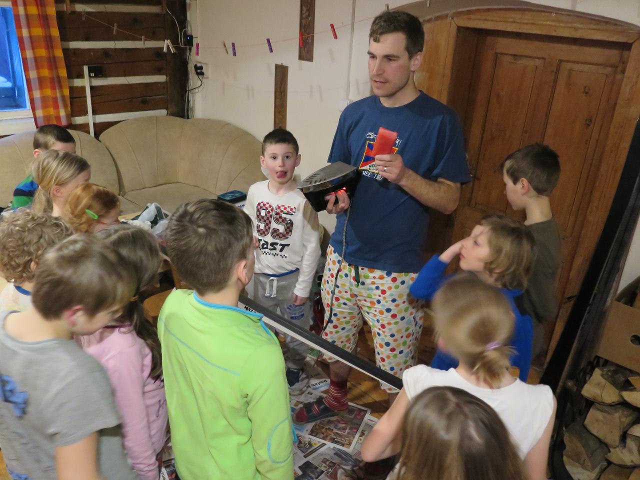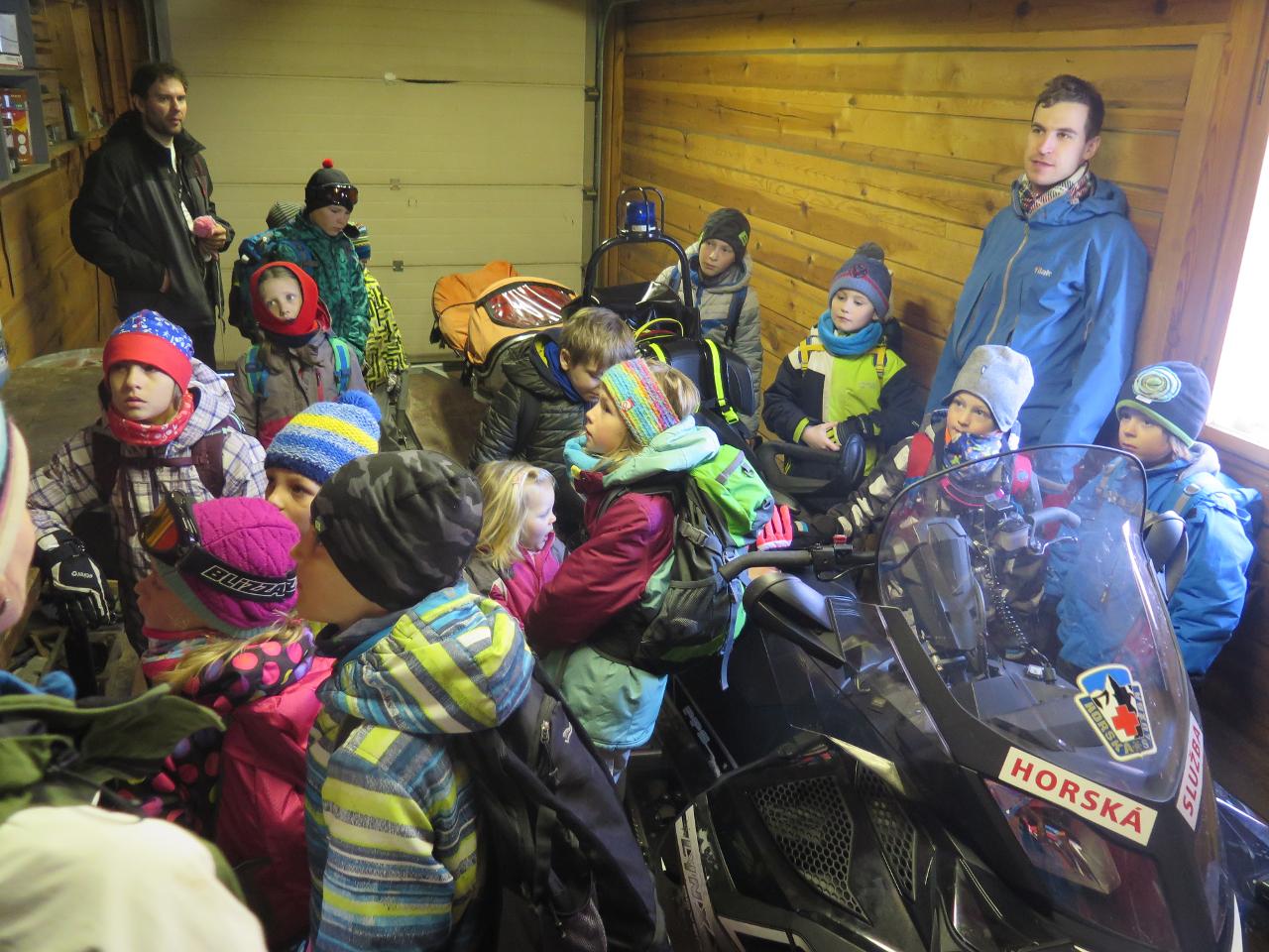 Navštívil nás také Olda z Horské služby, dozvěděli jsme se mnoho ze života záchranáře, viděli i zkusili jsme si vybavení, které využívá, když pomáhá lidem, například nafukovací dlahu. Kromě fotek a mnoha slov o skútrech, lavinách nebo vybavení jsme si i v terénu zkusili, jaké je to hledat předmět zasypaný sněhem pomocí lavinového pípáku! Během celodenního výletu na Pomezky a k maloúpskému kostelíku jsme se podívali i přímo na stanici horské služby! Večer jsme pak zažili poučné dobrodružství Hanče a Vrbaty prostřednictvím filmu Synové hor. Na závěrečné odpoledne a večer přijeli i rodiče, zažili jsme s nimi různé hry venku i vevnitř.