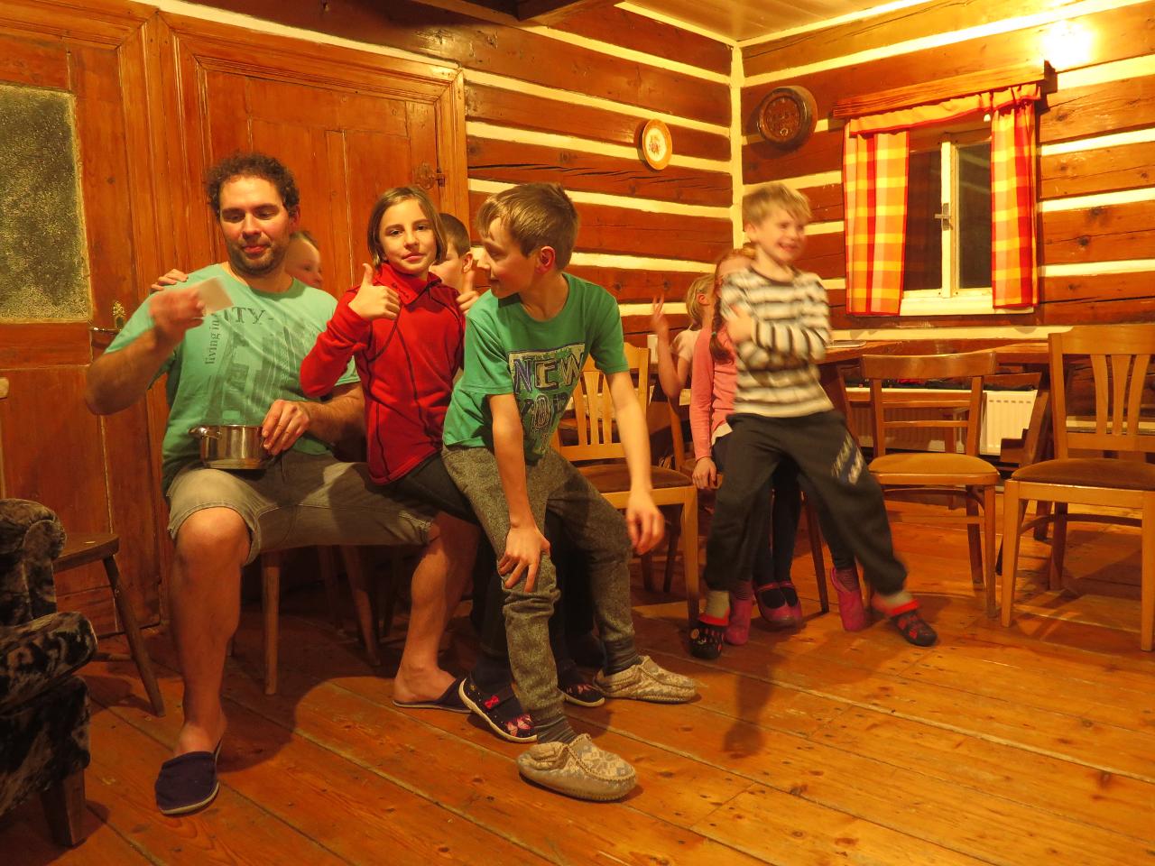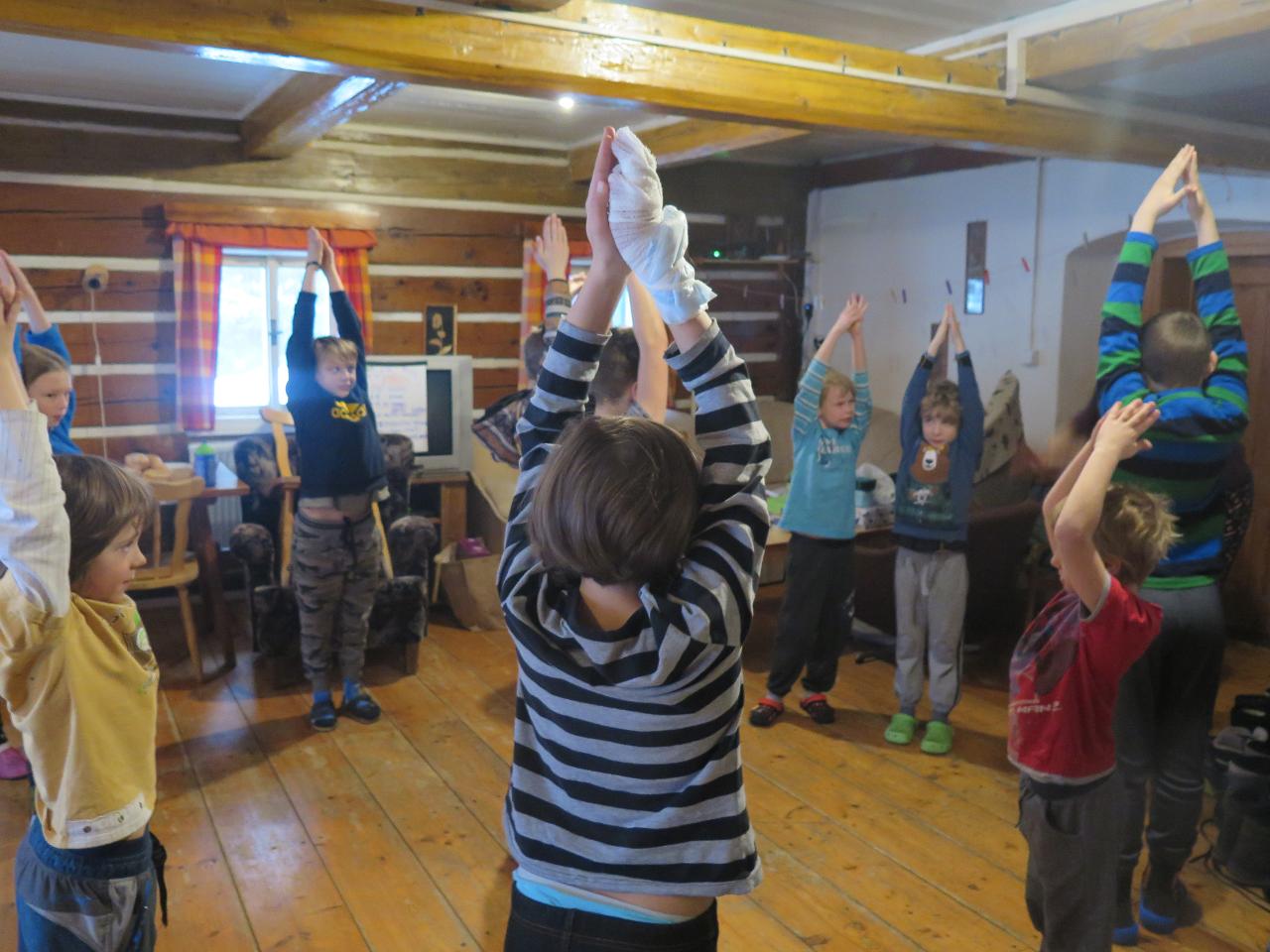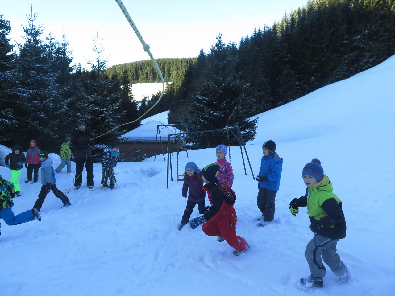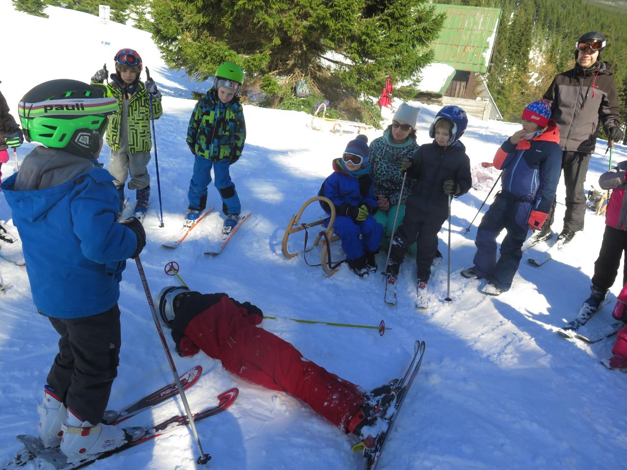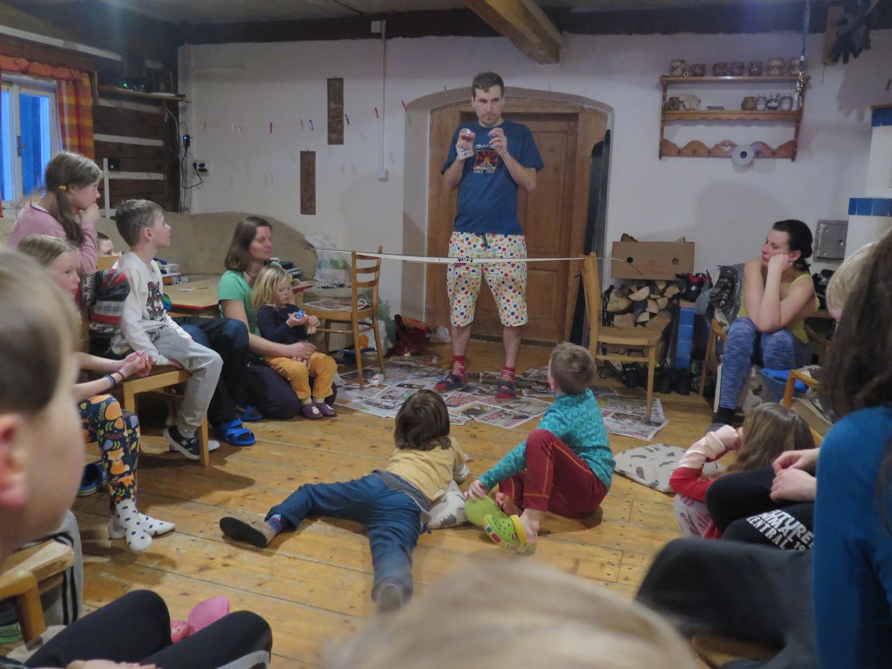 Navštívil nás také Olda z Horské služby, dozvěděli jsme se mnoho ze života záchranáře, viděli i zkusili jsme si vybavení, které využívá, když pomáhá lidem, například nafukovací dlahu. Kromě fotek a mnoha slov o skútrech, lavinách nebo vybavení jsme si i v terénu zkusili, jaké je to hledat předmět zasypaný sněhem pomocí lavinového pípáku! Během celodenního výletu na Pomezky a k maloúpskému kostelíku jsme se podívali i přímo na stanici horské služby! Večer jsme pak zažili poučné dobrodružství Hanče a Vrbaty prostřednictvím filmu Synové hor. Na závěrečné odpoledne a večer přijeli i rodiče, zažili jsme s nimi různé hry venku i vevnitř.