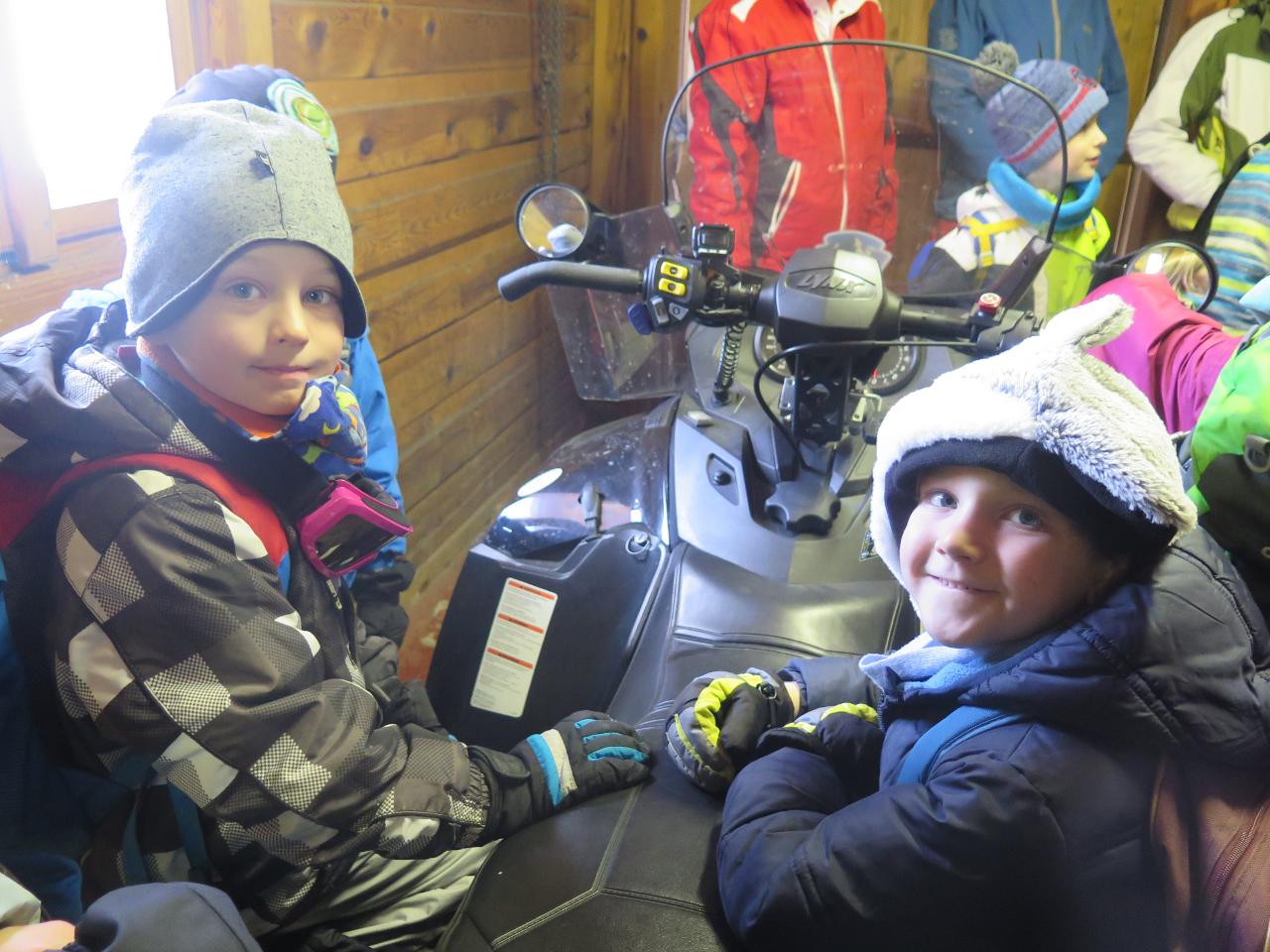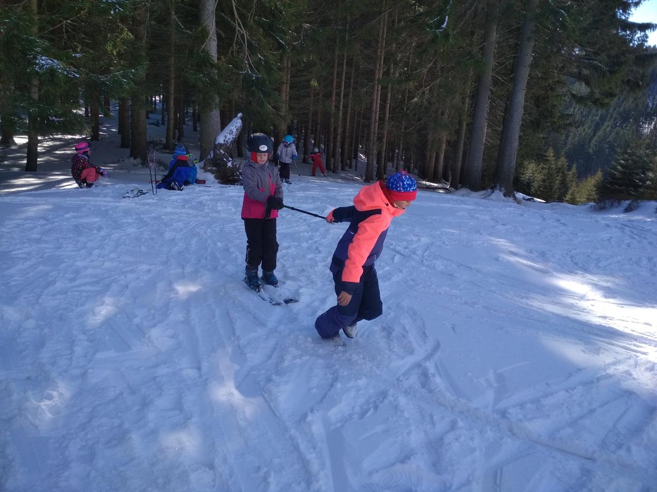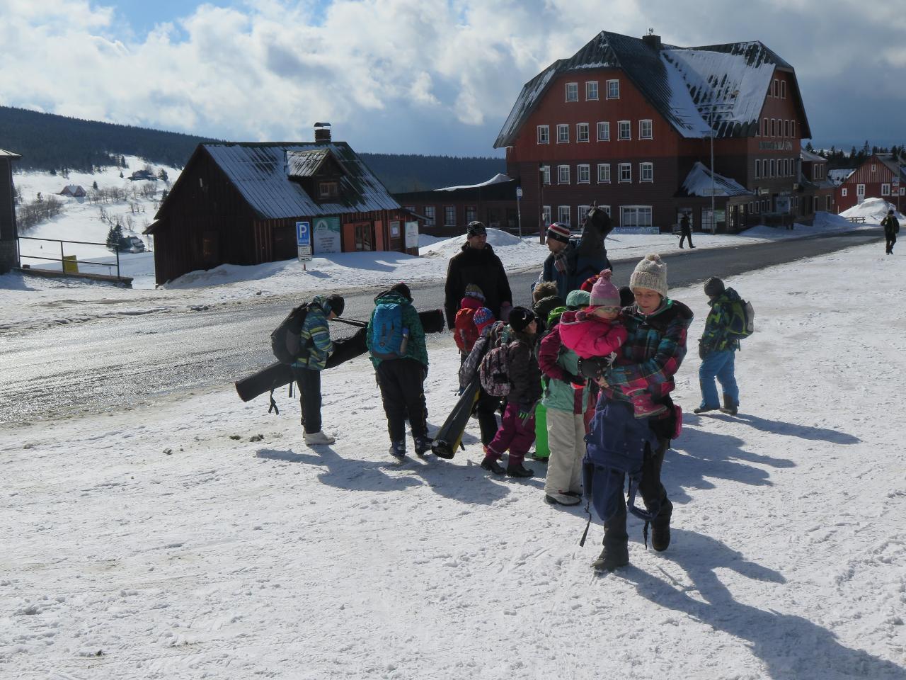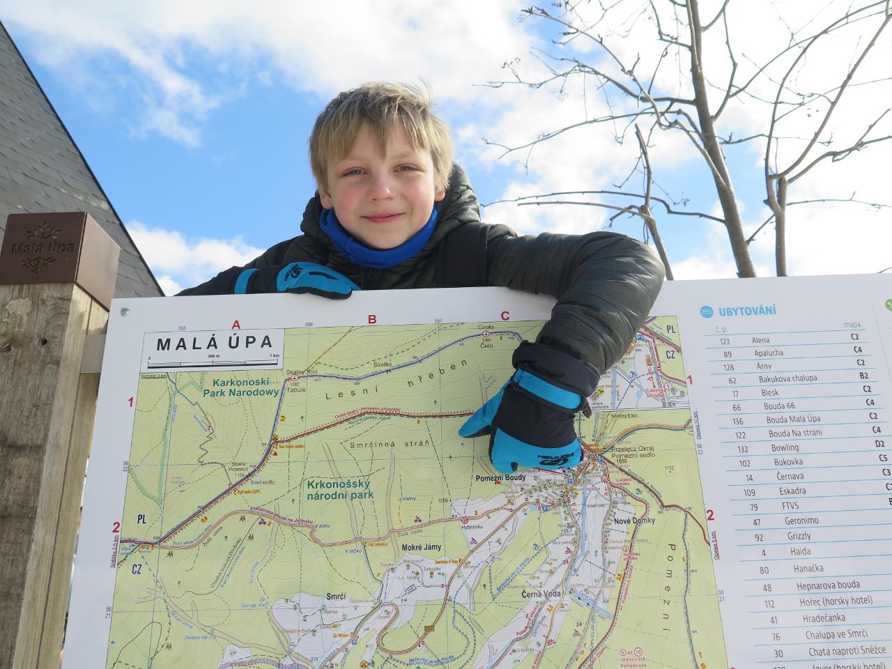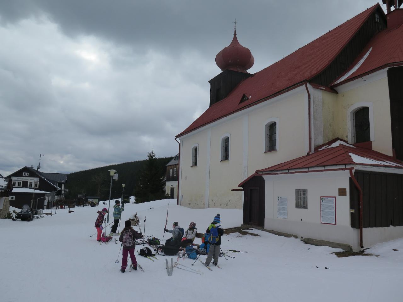 Navštívil nás také Olda z Horské služby, dozvěděli jsme se mnoho ze života záchranáře, viděli i zkusili jsme si vybavení, které využívá, když pomáhá lidem, například nafukovací dlahu. Kromě fotek a mnoha slov o skútrech, lavinách nebo vybavení jsme si i v terénu zkusili, jaké je to hledat předmět zasypaný sněhem pomocí lavinového pípáku! Během celodenního výletu na Pomezky a k maloúpskému kostelíku jsme se podívali i přímo na stanici horské služby! Večer jsme pak zažili poučné dobrodružství Hanče a Vrbaty prostřednictvím filmu Synové hor. Na závěrečné odpoledne a večer přijeli i rodiče, zažili jsme s nimi různé hry venku i vevnitř.