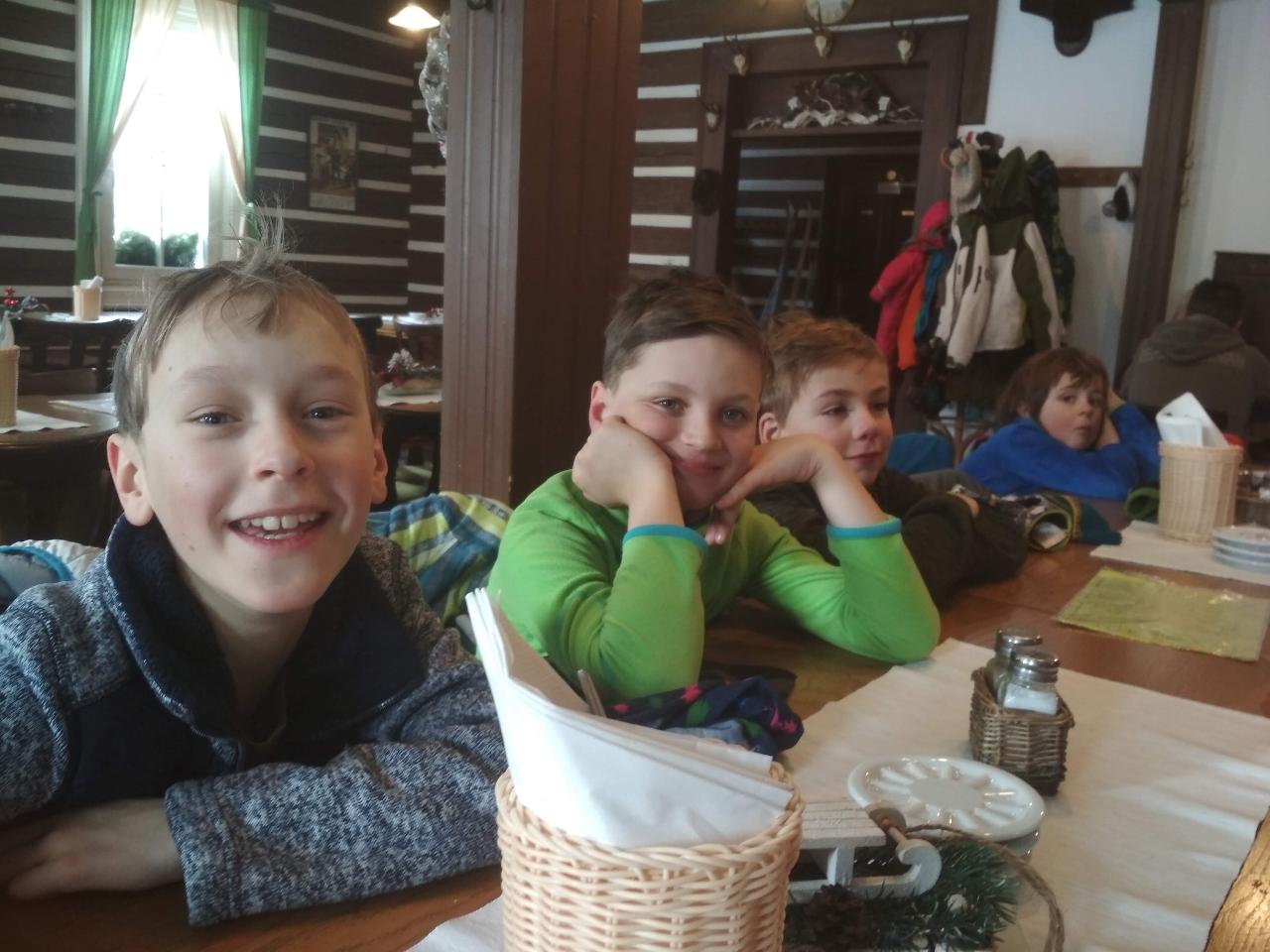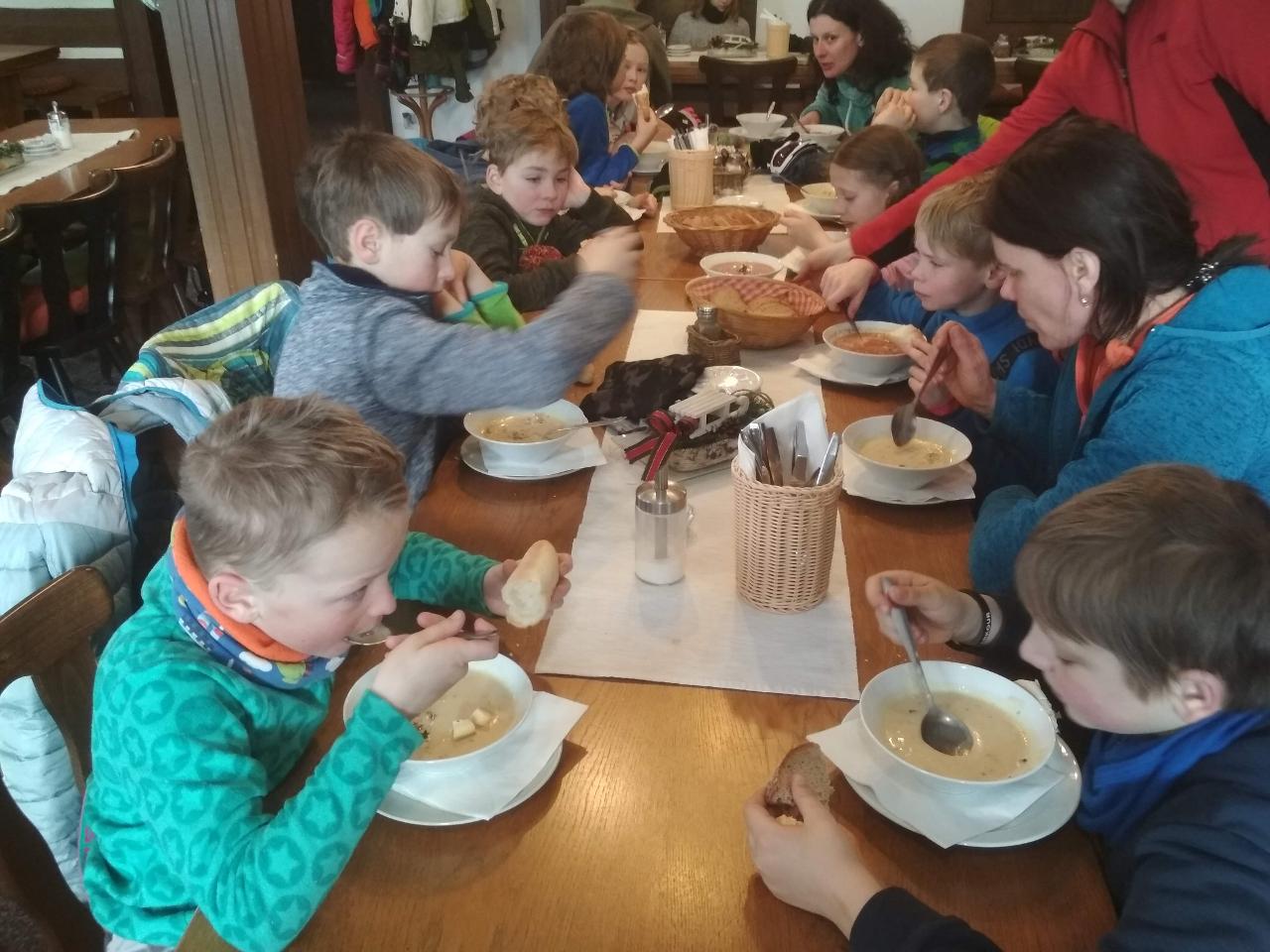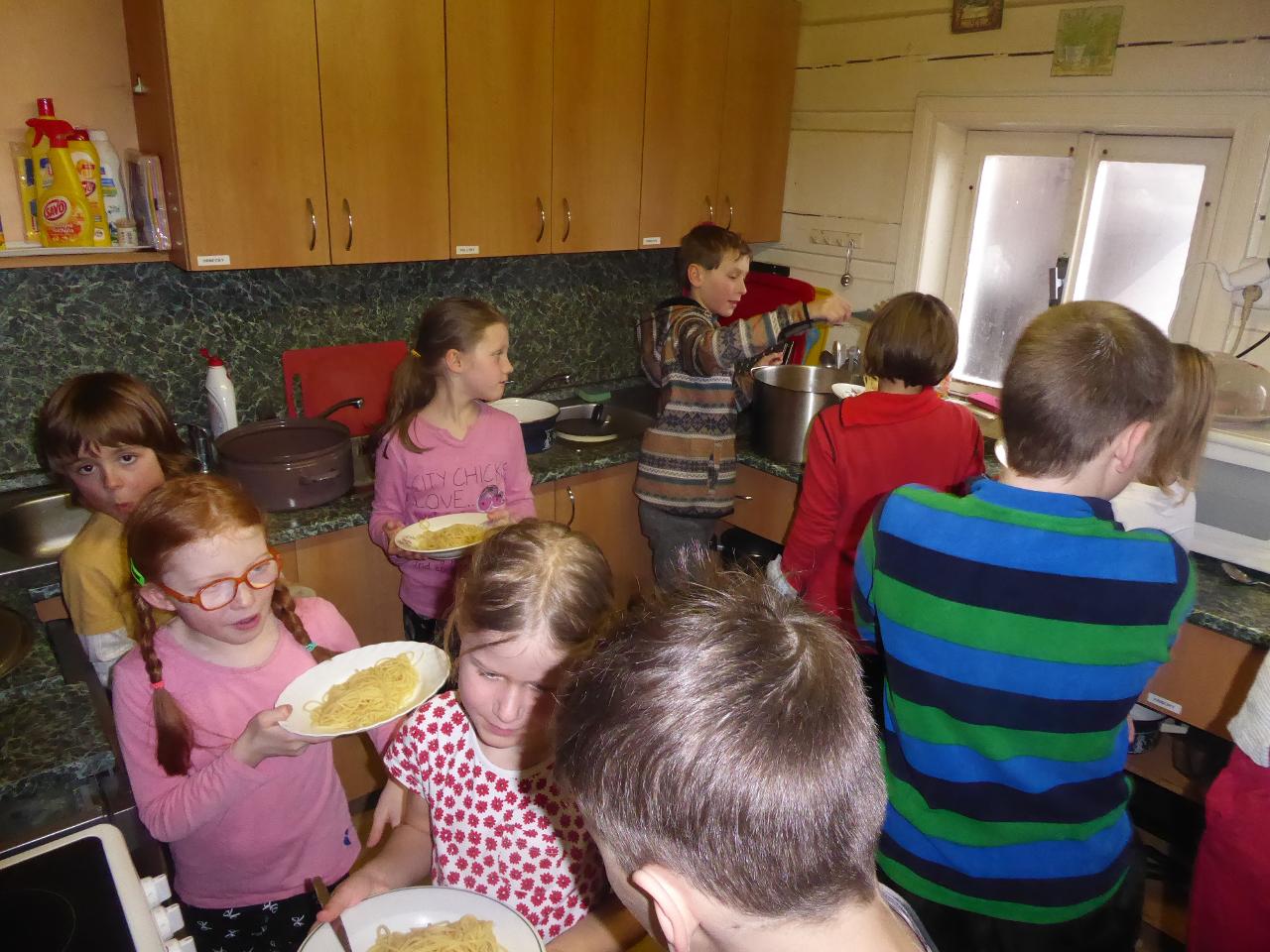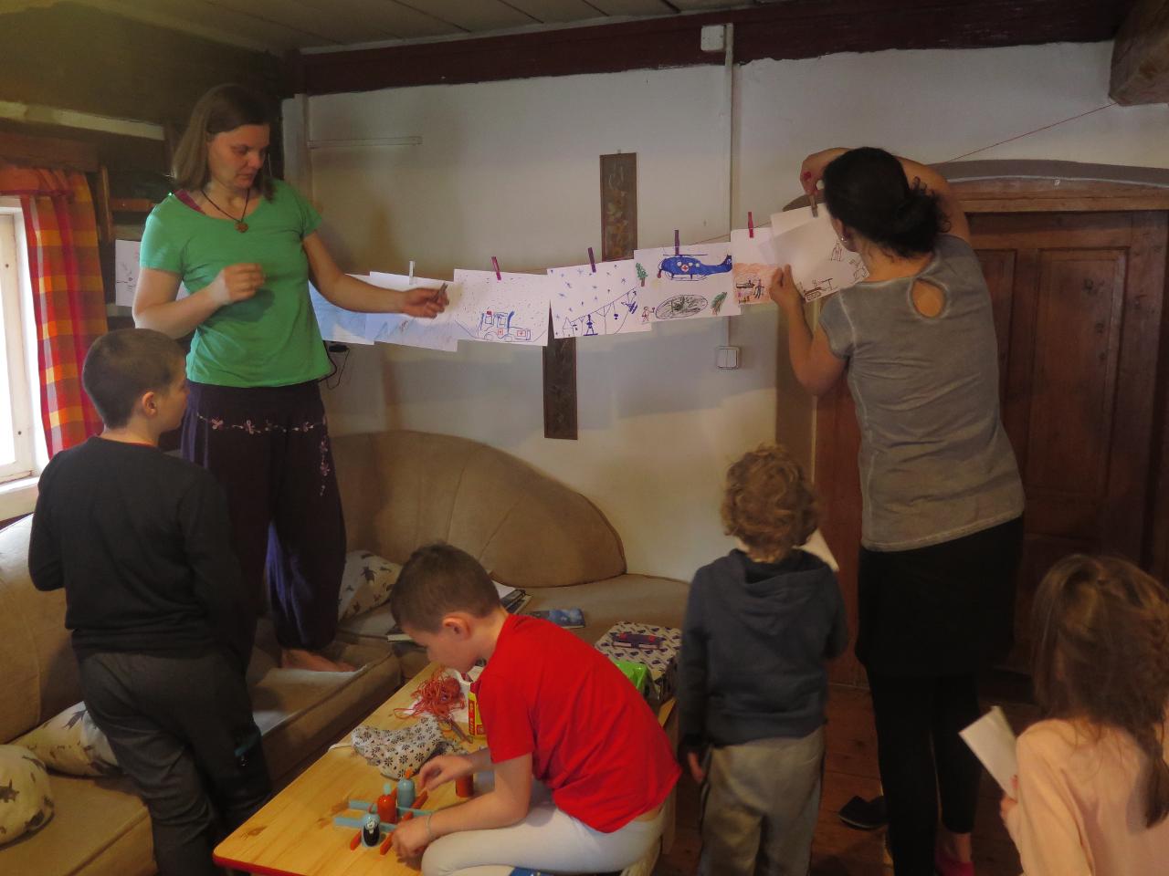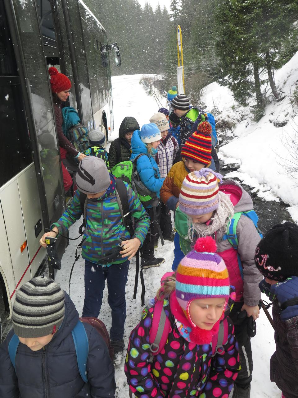 Navštívil nás také Olda z Horské služby, dozvěděli jsme se mnoho ze života záchranáře, viděli i zkusili jsme si vybavení, které využívá, když pomáhá lidem, například nafukovací dlahu. Kromě fotek a mnoha slov o skútrech, lavinách nebo vybavení jsme si i v terénu zkusili, jaké je to hledat předmět zasypaný sněhem pomocí lavinového pípáku! Během celodenního výletu na Pomezky a k maloúpskému kostelíku jsme se podívali i přímo na stanici horské služby! Večer jsme pak zažili poučné dobrodružství Hanče a Vrbaty prostřednictvím filmu Synové hor. Na závěrečné odpoledne a večer přijeli i rodiče, zažili jsme s nimi různé hry venku i vevnitř.
