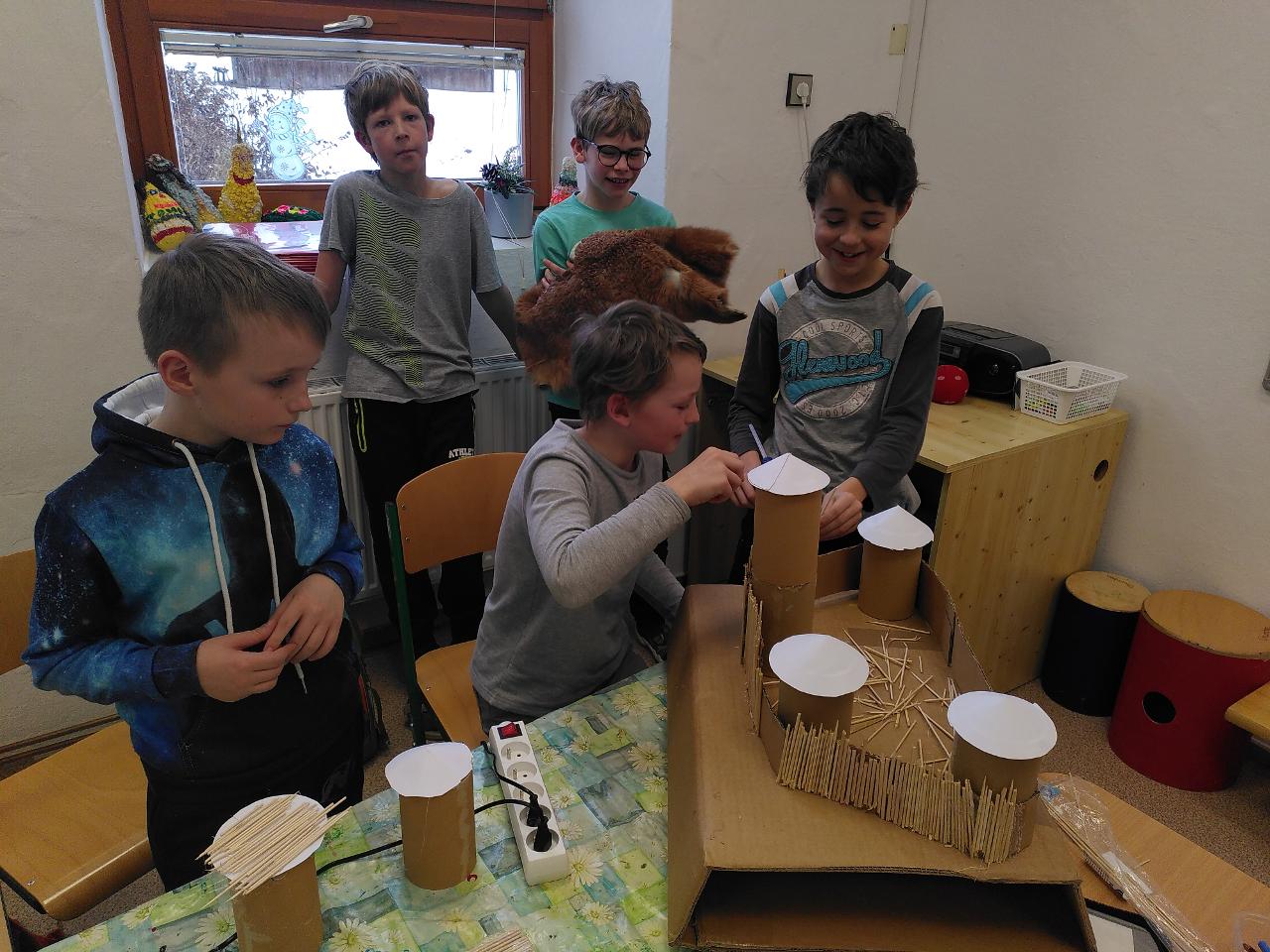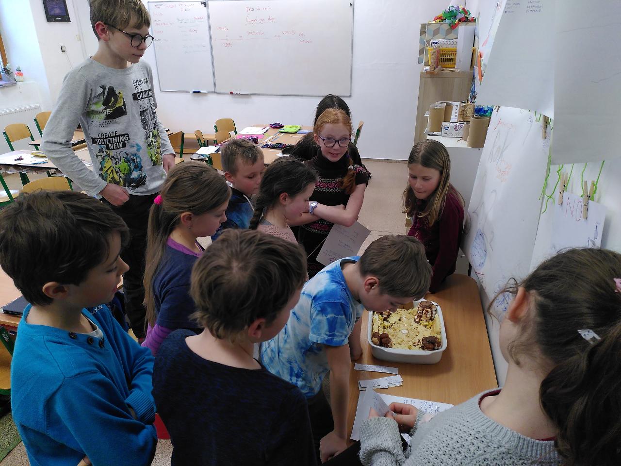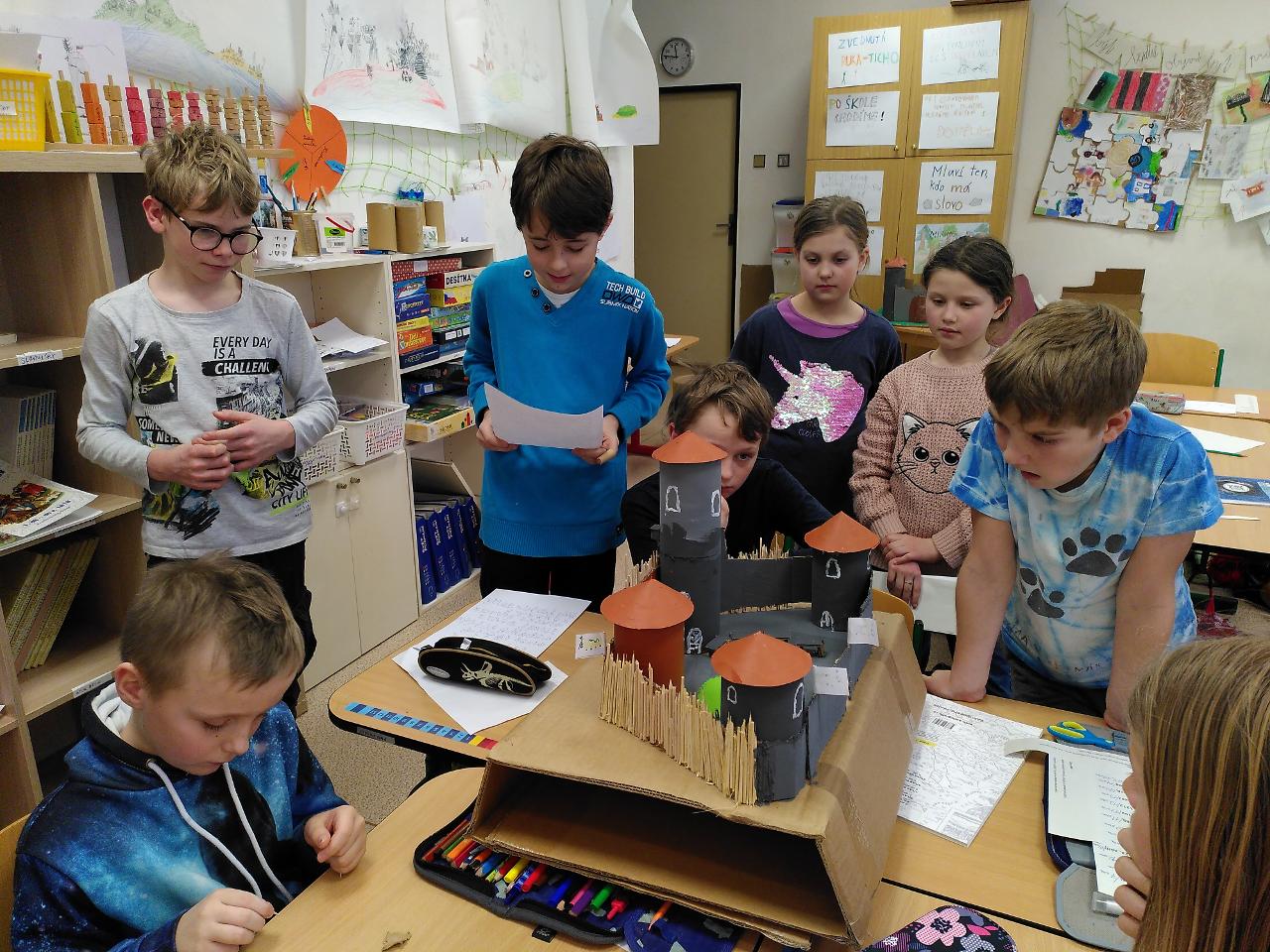 Téma středověk pokračuje, stejně jako práce na středověkých stavbách, která finišuje do zdárného konce. Jednu stavbu jsme dokonce koncem týdne i snědli a byla moc chutná! Naši stavitelé použili i netradiční materiály, jako piškoty, piškotové těsto, čokoládu. Fantazii se meze nekladou. Stejně fantasticky dopadly i ručně malované středověké prapory, gravírované kostky na vrhcáby. V češtině jsme si osvojili slohové téma popisu a dozvěděli se tak mnohé o sourozencích, babičkách, rodičích, ale třeba i o Jean - Paul Belmondovi apod.