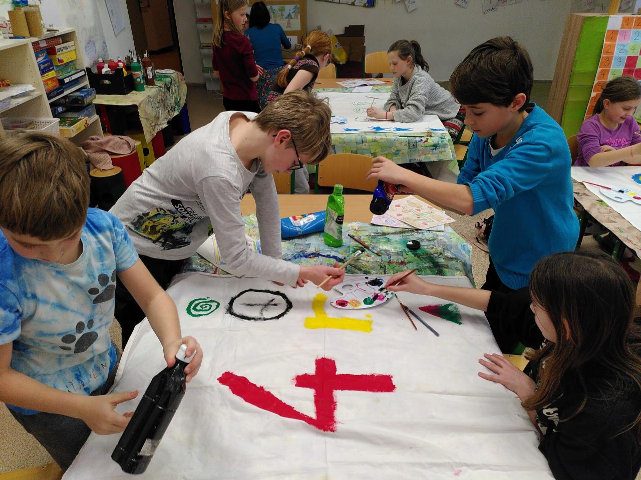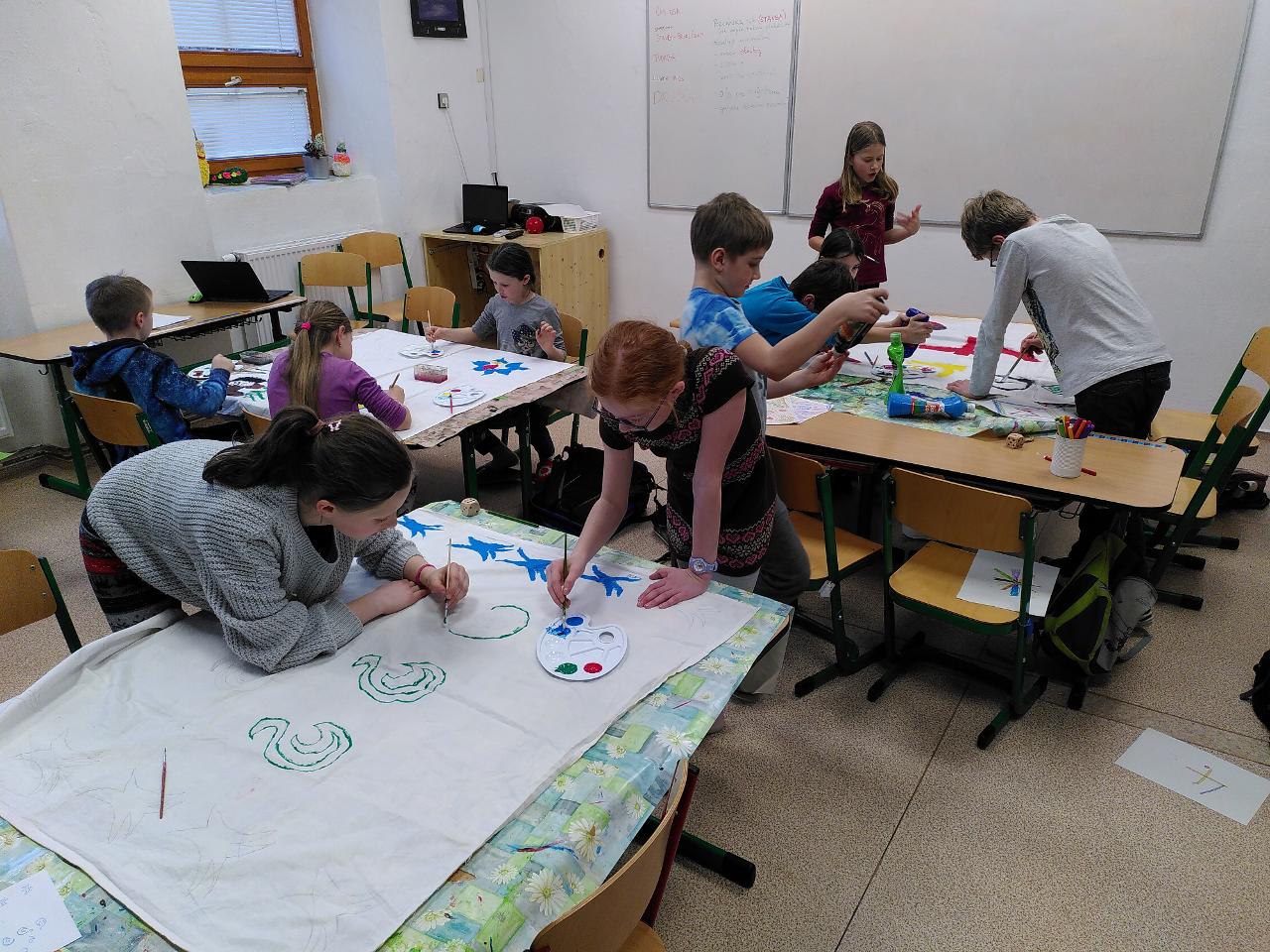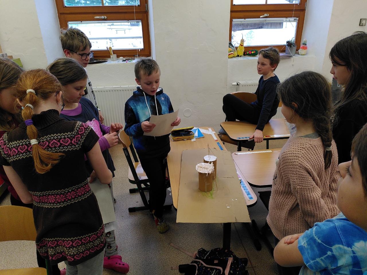 Téma středověk pokračuje, stejně jako práce na středověkých stavbách, která finišuje do zdárného konce. Jednu stavbu jsme dokonce koncem týdne i snědli a byla moc chutná! Naši stavitelé použili i netradiční materiály, jako piškoty, piškotové těsto, čokoládu. Fantazii se meze nekladou. Stejně fantasticky dopadly i ručně malované středověké prapory, gravírované kostky na vrhcáby. V češtině jsme si osvojili slohové téma popisu a dozvěděli se tak mnohé o sourozencích, babičkách, rodičích, ale třeba i o Jean - Paul Belmondovi apod.