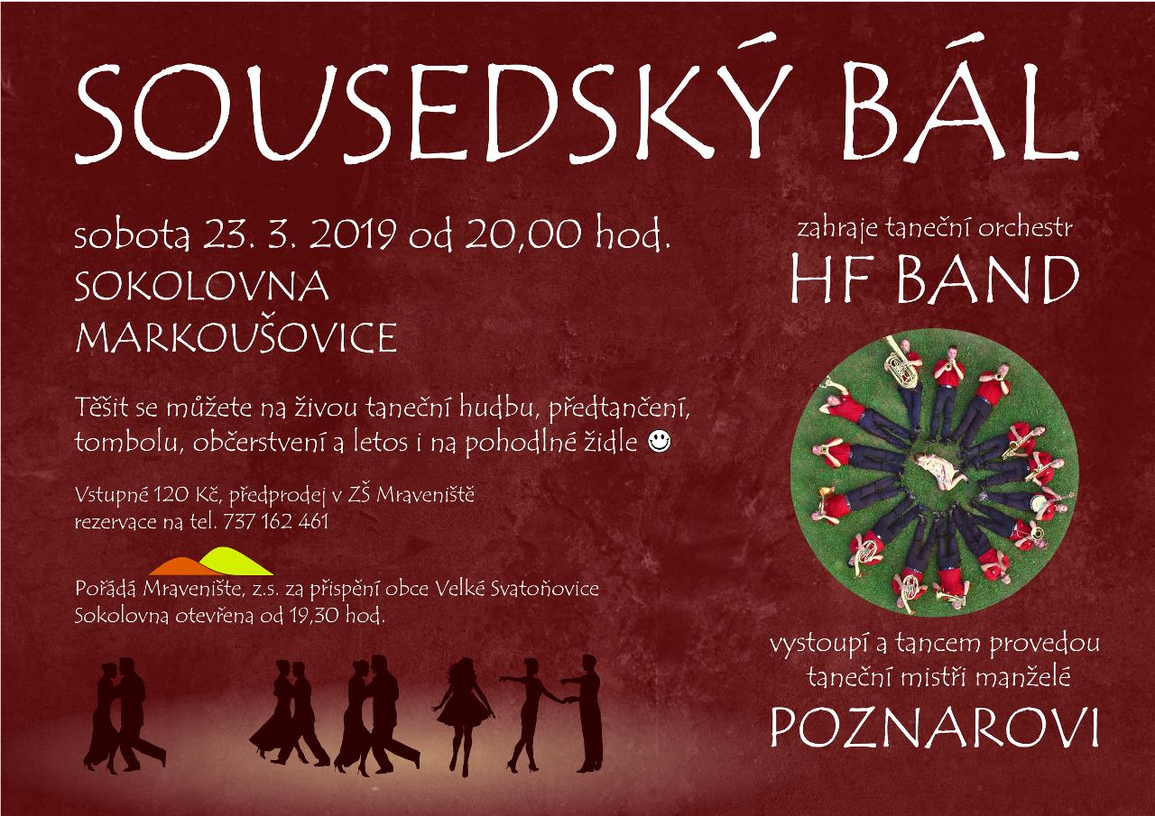I letošní ročník Sousedského bálu se vydařil a Markoušovicemi se ozývala hudba tanečního orchestru HF Band široko daleko. Každý návštěvník si mohl zatančit, vyhrát zajímavé ceny v tombole nebo se občerstvit dobrotami od našich milých maximravenců. Během bálu proběhla přímo na parketu i taneční lekce pod vedením manželů Poznarových. Účast na bále byla hojná, atmosféra velmi uvolněná, taneční páry se neostýchaly hned při prvních tónech vydat na parket, jistě i díky skutečnosti, že také v týdnu před bálem proběhla taneční lekce pro zájemce. Děkujeme všem dobrovolníkům i obci Velké Svatoňovice za podporu a pomoc. Budeme se těšit příští rok opět na viděnou i na tančenou.