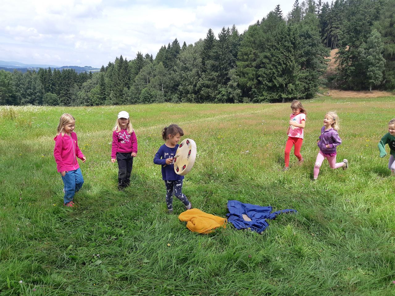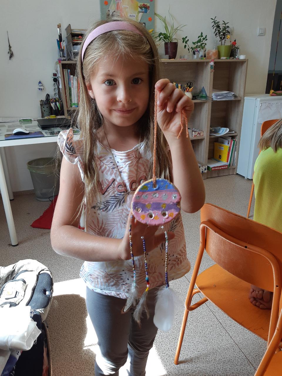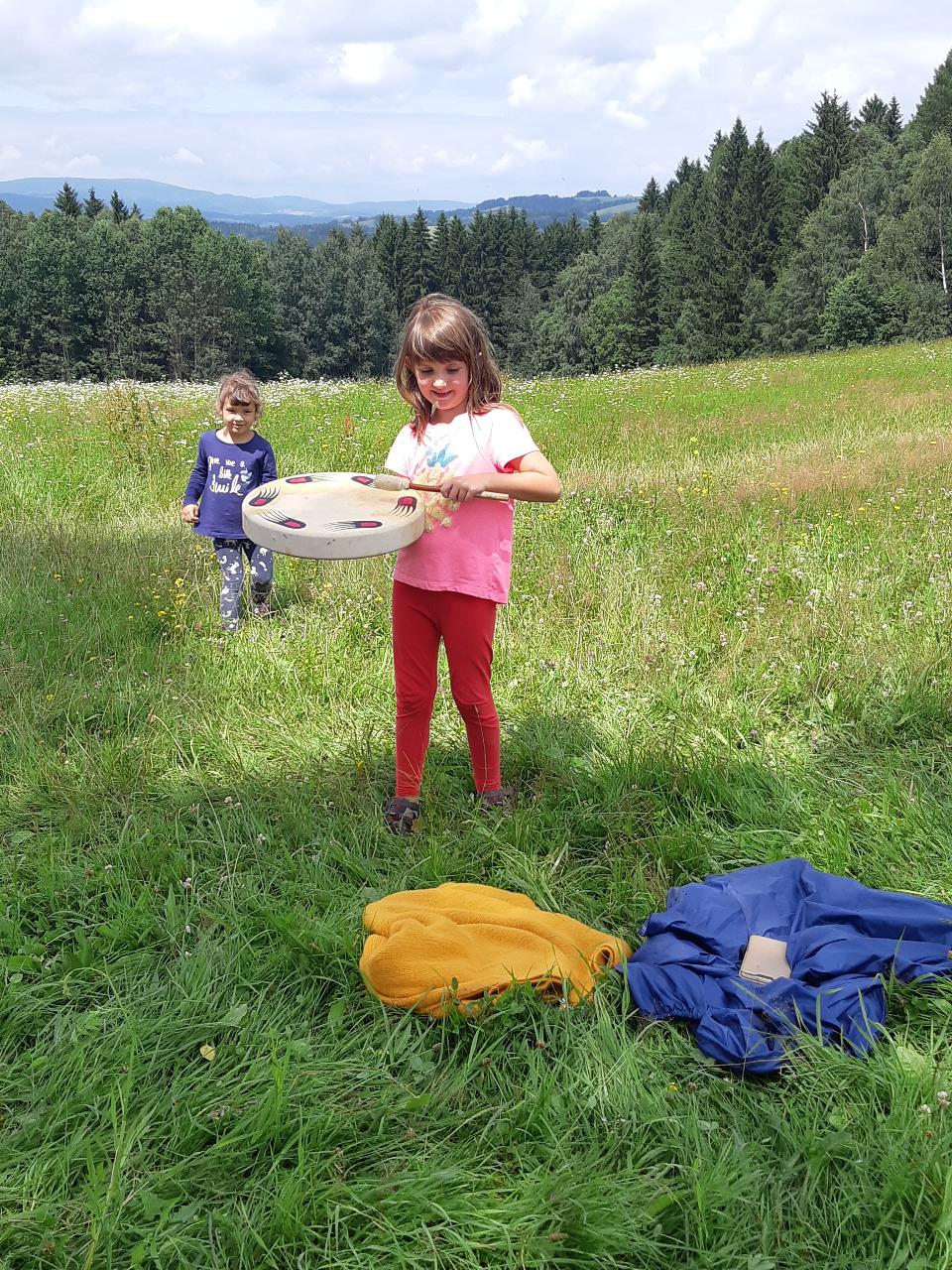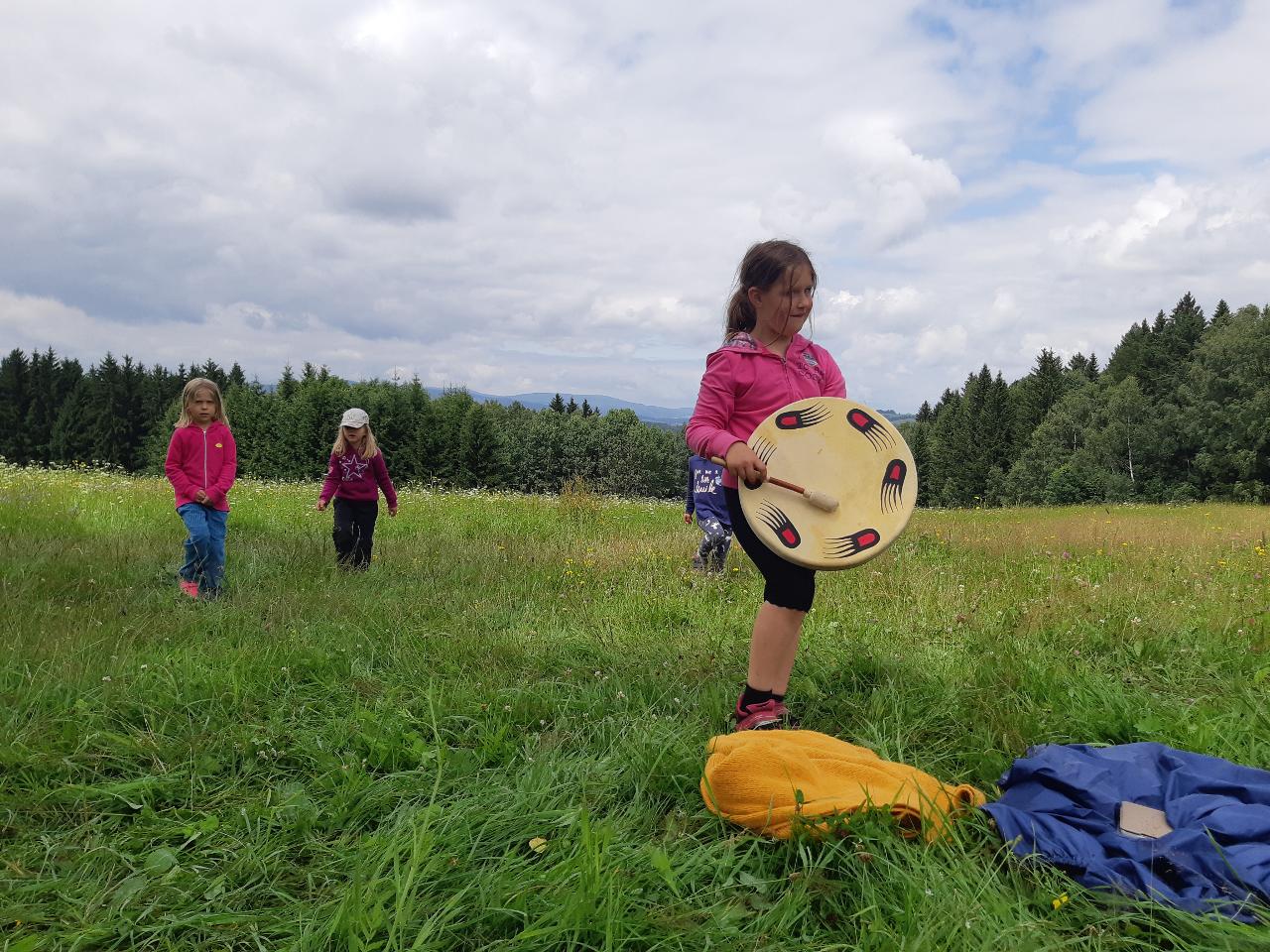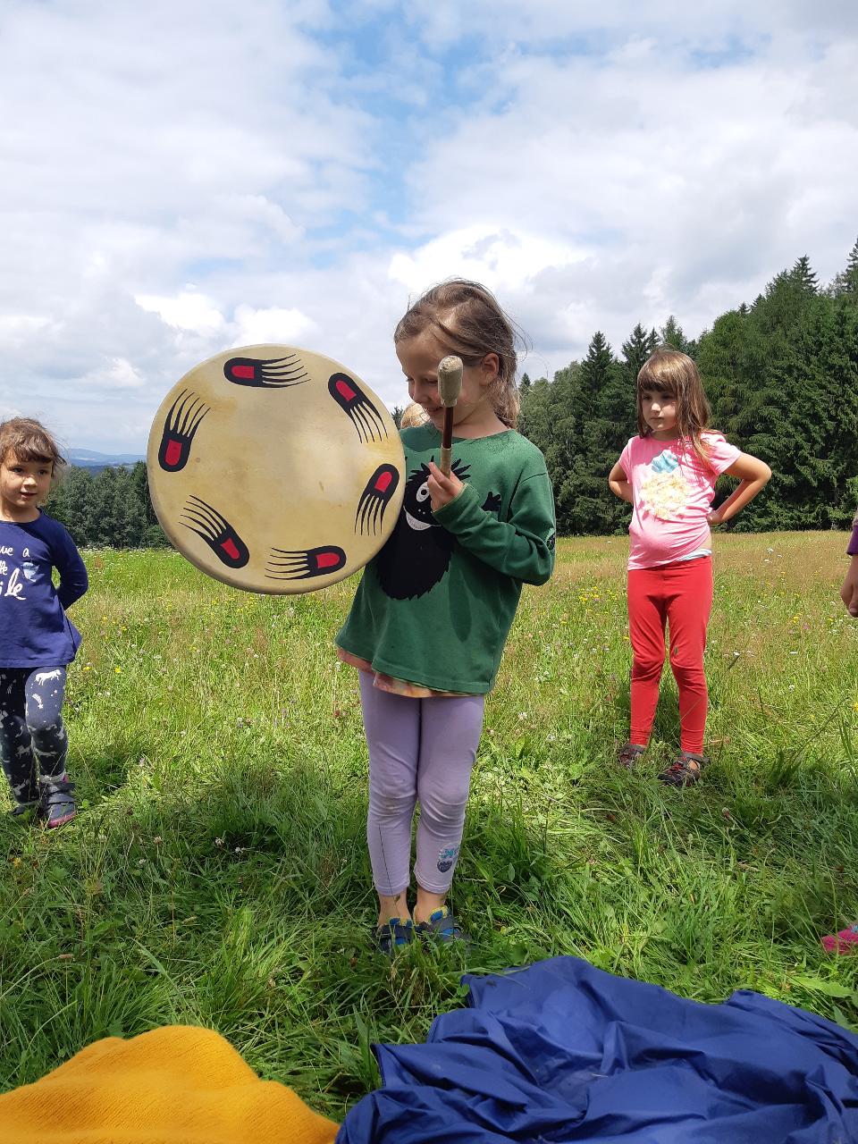 Na tomto týdnu se sešlo 11 dívek ve věku 5-10 let. Užili jsme si spoustu tvoření, malování, vyrábění, výletů i her. Tvořili jsme náramky z korálků, andílky (pardon, vlastně víly) z ovčí vlny, vyráběli jsme lapače snů, malovali roční období a jejich symboly. Svá těla jsme protáhli při jógových cvičeních a zjišťovali, zda se nám lépe a snáz cvičí samostatně nebo ve dvojici. Bubnovali jsme a tančili, zkoumali, jak to máme se strachem a důvěrou. Zkoušeli jsme vyjádřit naše pocity a emoce nejenom slovy, ale třeba právě hraním na různé hudební nástroje. Hodně času jsme také trávili venku a užívali si společných her na loukách a v lesích v okolí Mraveniště. Při společných aktivitách jsme objevovali, jak je důležitá komunikace a spolupráce a že když udělám radost někomu druhému, o to větší může být i moje vlastní. A stejně jako loni nám na výletech a vycházkách dělala společnost zkušená psí průvodkyně Fidorka, která si to s námi určitě moc užila.