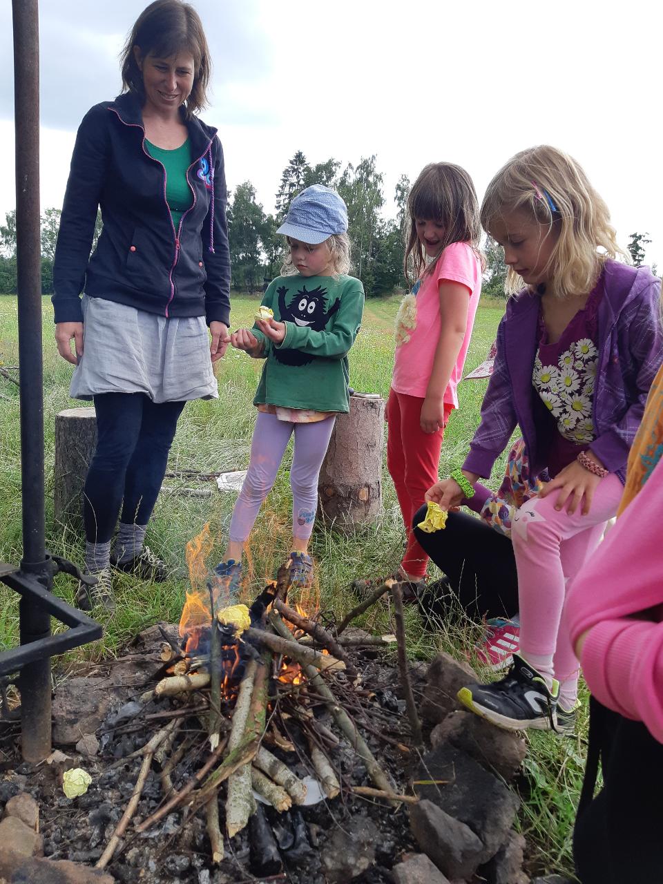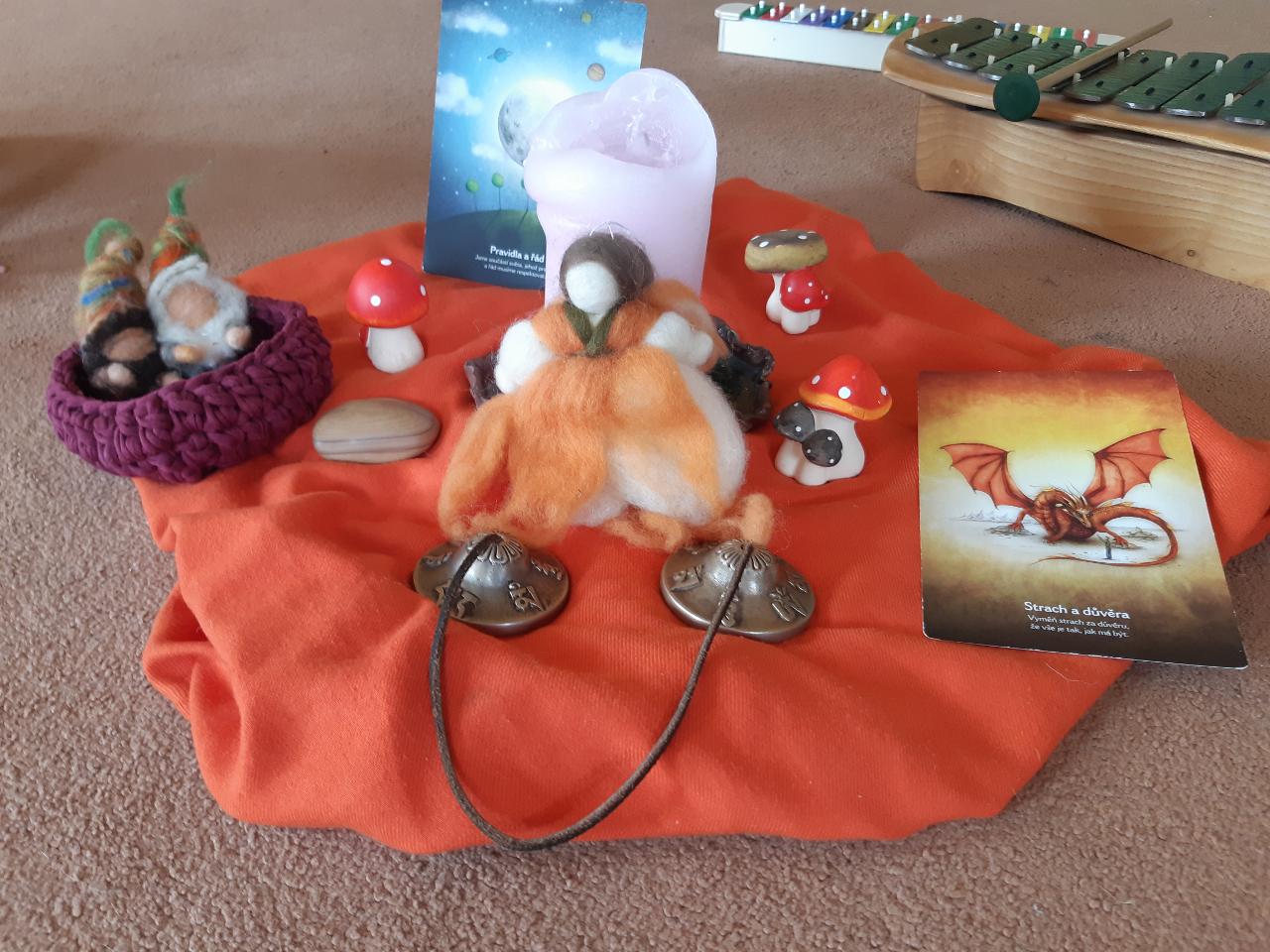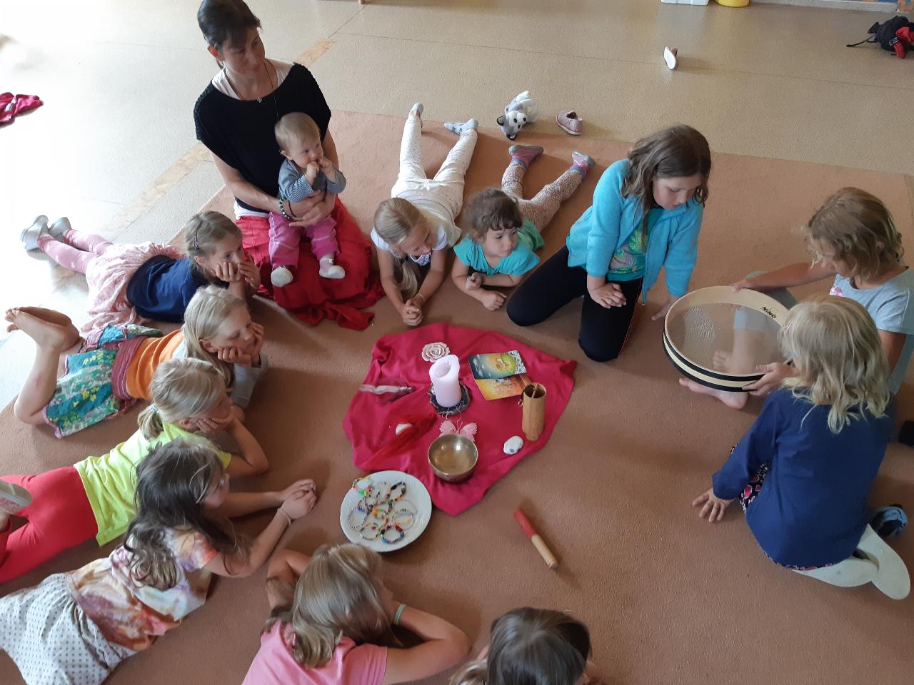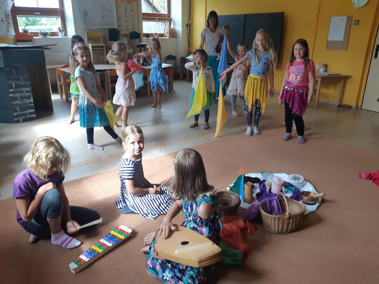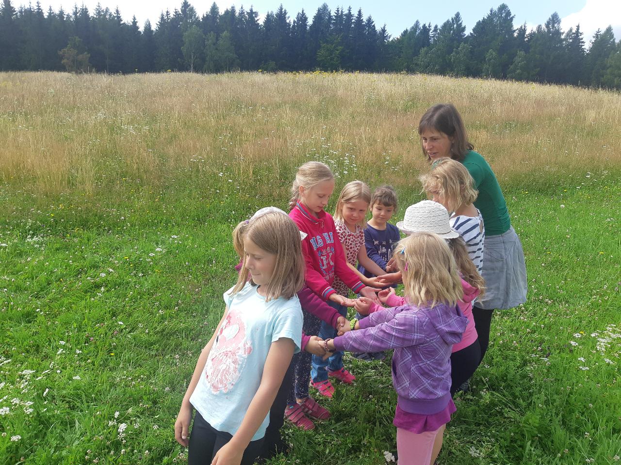 Na tomto týdnu se sešlo 11 dívek ve věku 5-10 let. Užili jsme si spoustu tvoření, malování, vyrábění, výletů i her. Tvořili jsme náramky z korálků, andílky (pardon, vlastně víly) z ovčí vlny, vyráběli jsme lapače snů, malovali roční období a jejich symboly. Svá těla jsme protáhli při jógových cvičeních a zjišťovali, zda se nám lépe a snáz cvičí samostatně nebo ve dvojici. Bubnovali jsme a tančili, zkoumali, jak to máme se strachem a důvěrou. Zkoušeli jsme vyjádřit naše pocity a emoce nejenom slovy, ale třeba právě hraním na různé hudební nástroje. Hodně času jsme také trávili venku a užívali si společných her na loukách a v lesích v okolí Mraveniště. Při společných aktivitách jsme objevovali, jak je důležitá komunikace a spolupráce a že když udělám radost někomu druhému, o to větší může být i moje vlastní. A stejně jako loni nám na výletech a vycházkách dělala společnost zkušená psí průvodkyně Fidorka, která si to s námi určitě moc užila.